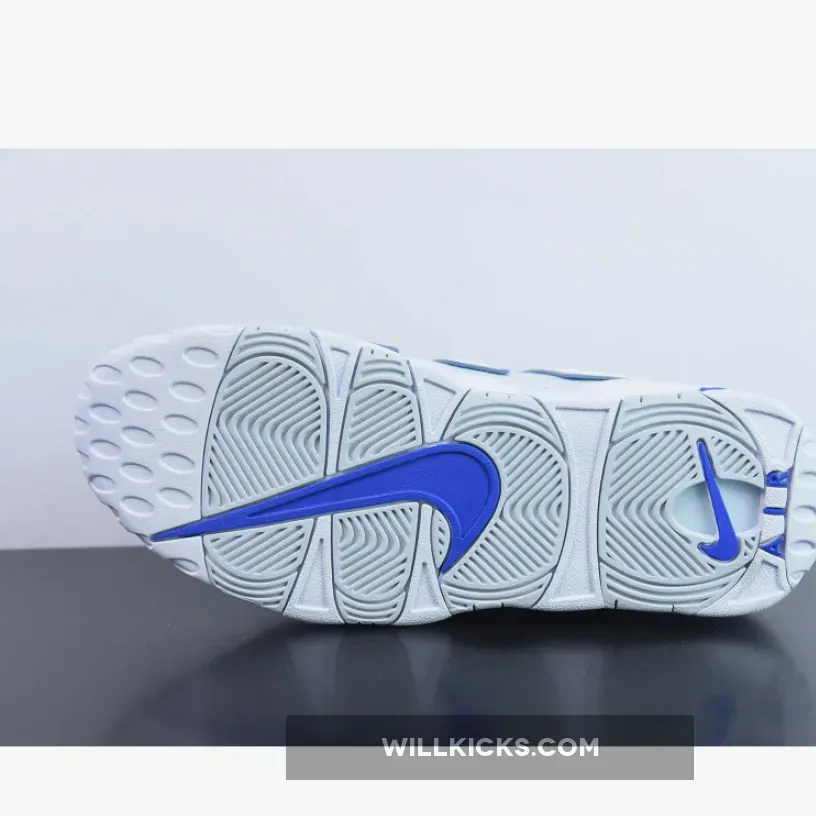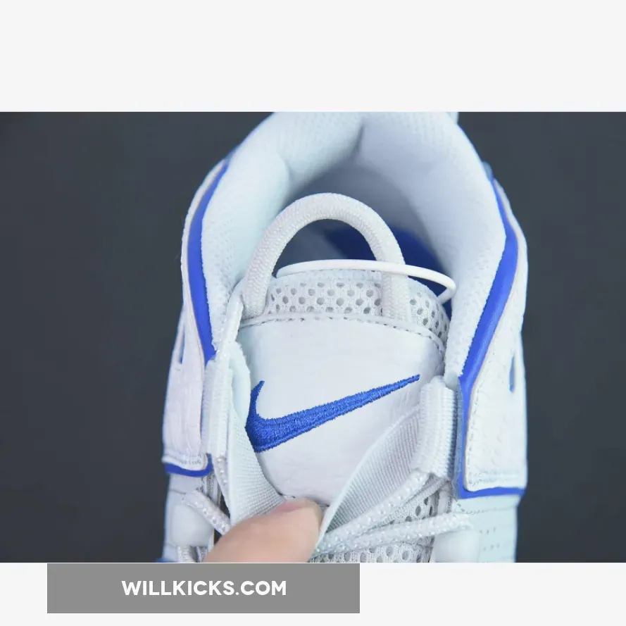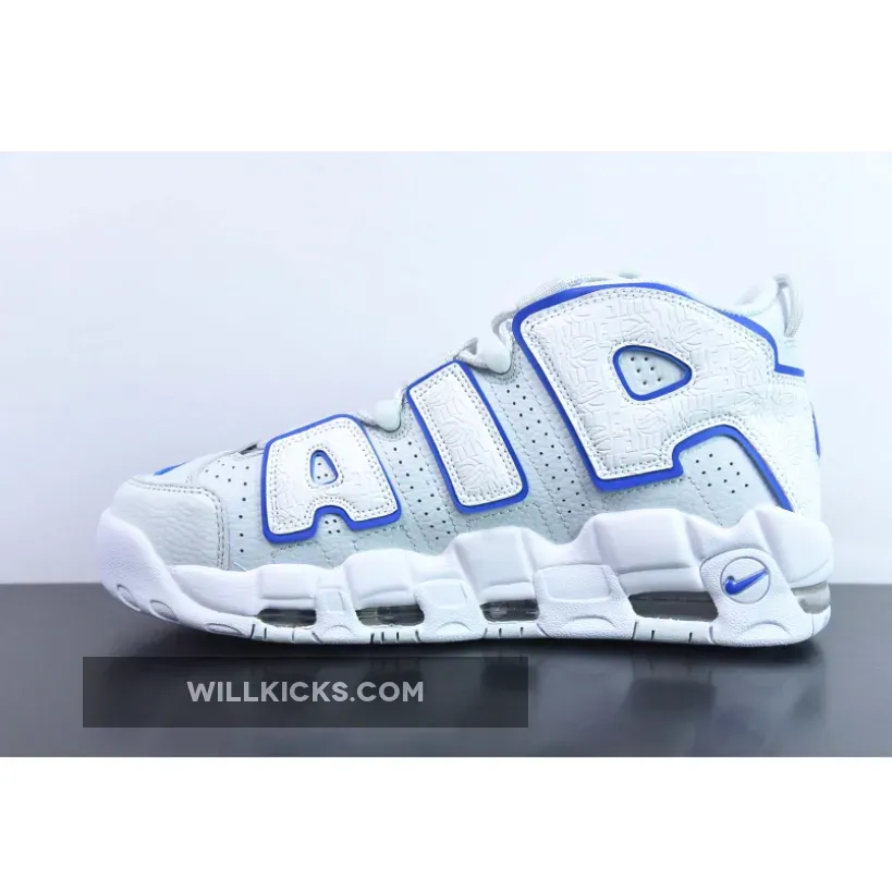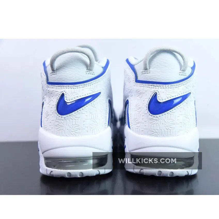 This offering of the Nike Air More Uptempo features a White tumbled leather upper detailed with embossed hoop logos covering the “AIR” letting that wraps around the heel.