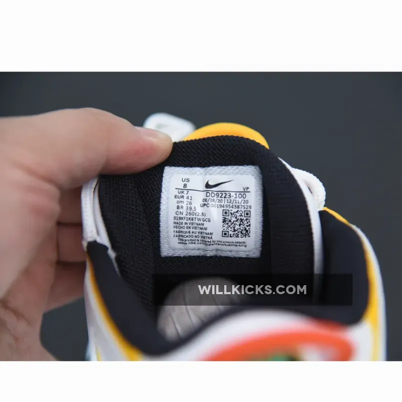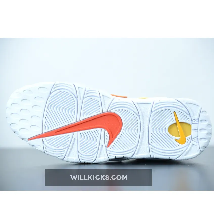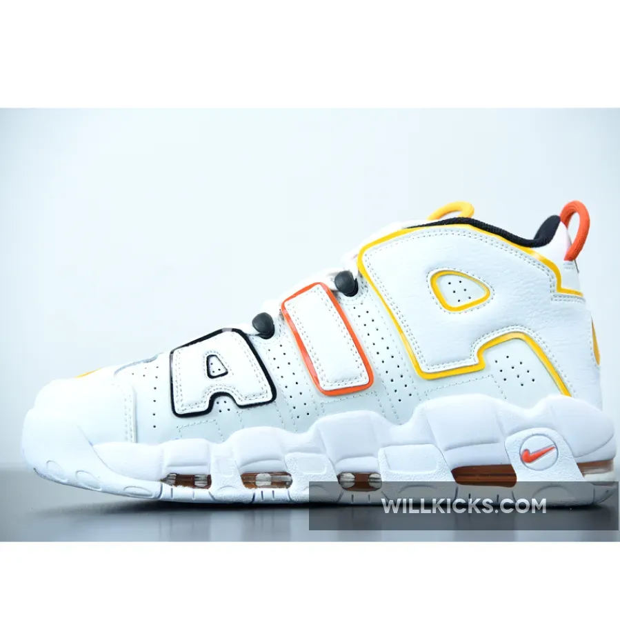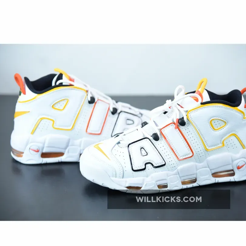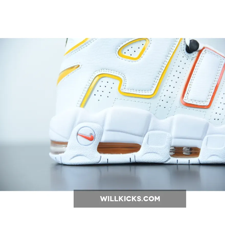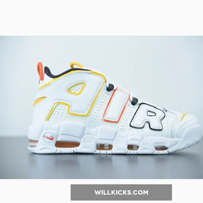 The Nike Air More Uptempo ‘Roswell Raygun’ takes its design cues from a beloved Nike SB Dunk from 2005, which yielded ‘home’ and ‘away’ colorways inspired by a fictional ‘70s ABA team featured in a 2002 Nike Basketball campaign. This pair replicates the look of the home edition of the ‘Raygun’ Dunk, highlighted by a white leather base with signature ‘AIR’ lettering framed in contrasting yellow, orange and black detailing. The Rayguns’ basketball graphic adorns the heel tab, positioned just above an amber jewel Swoosh.