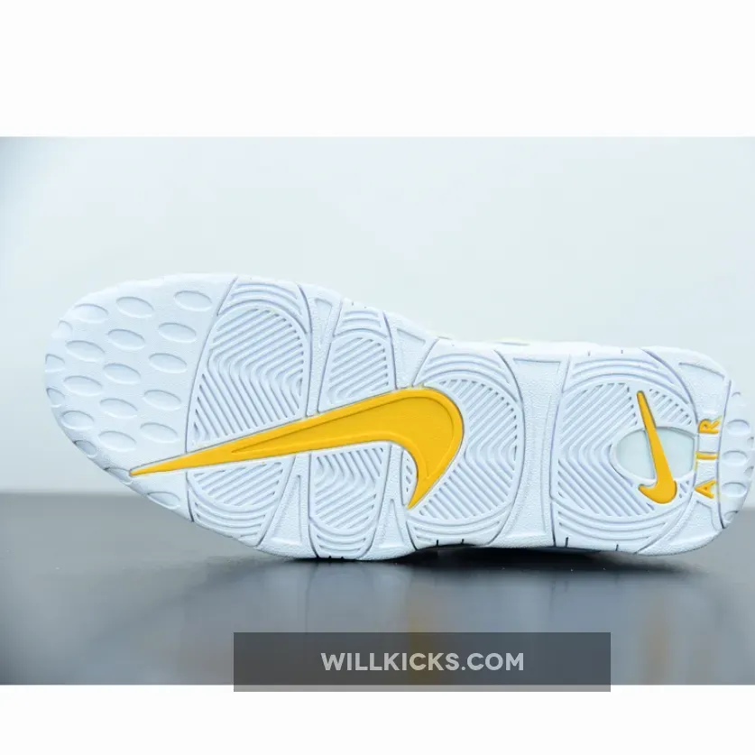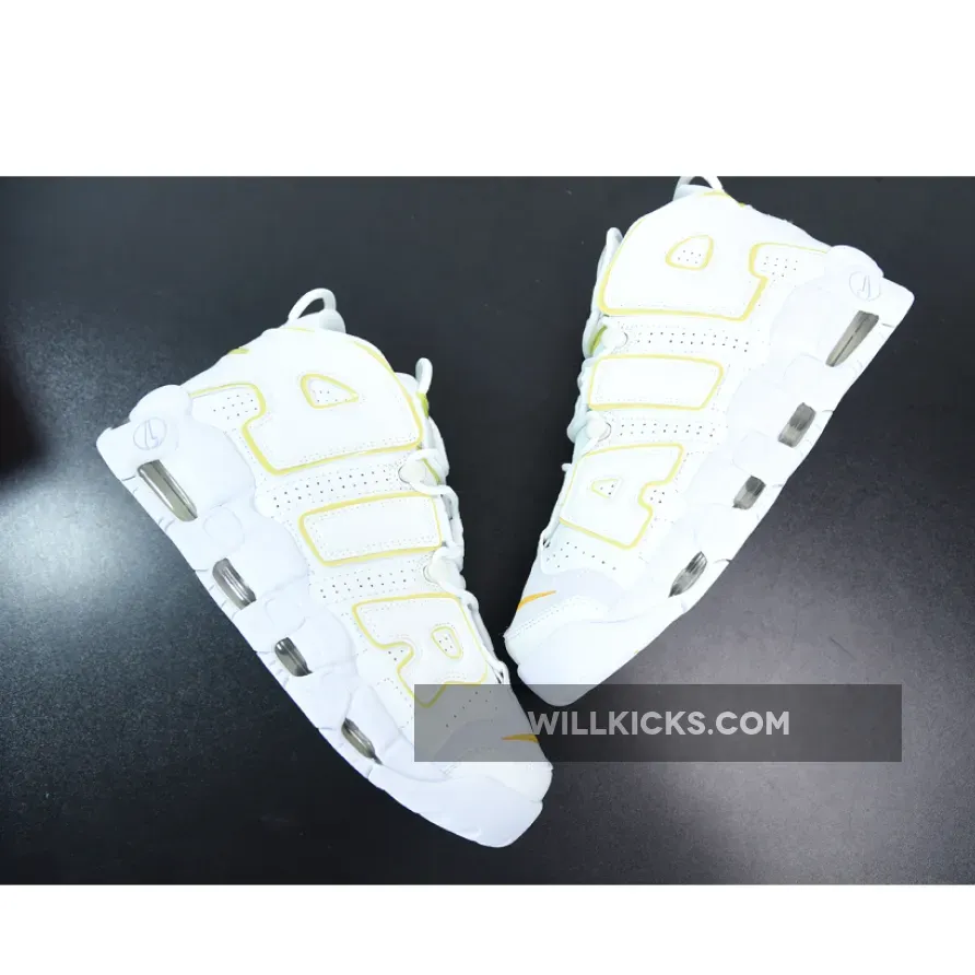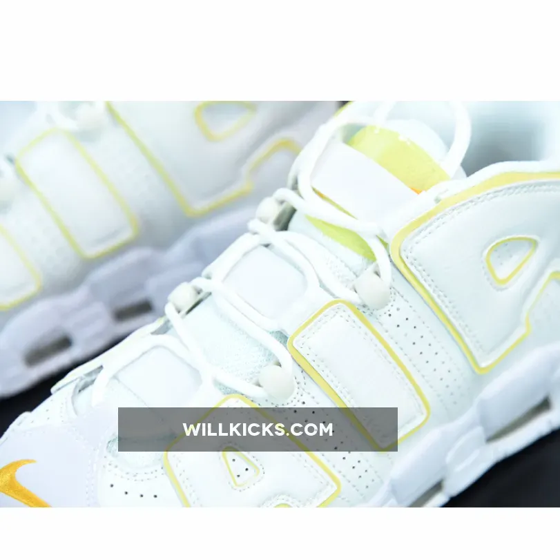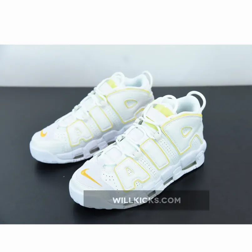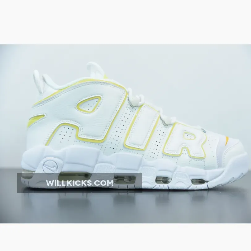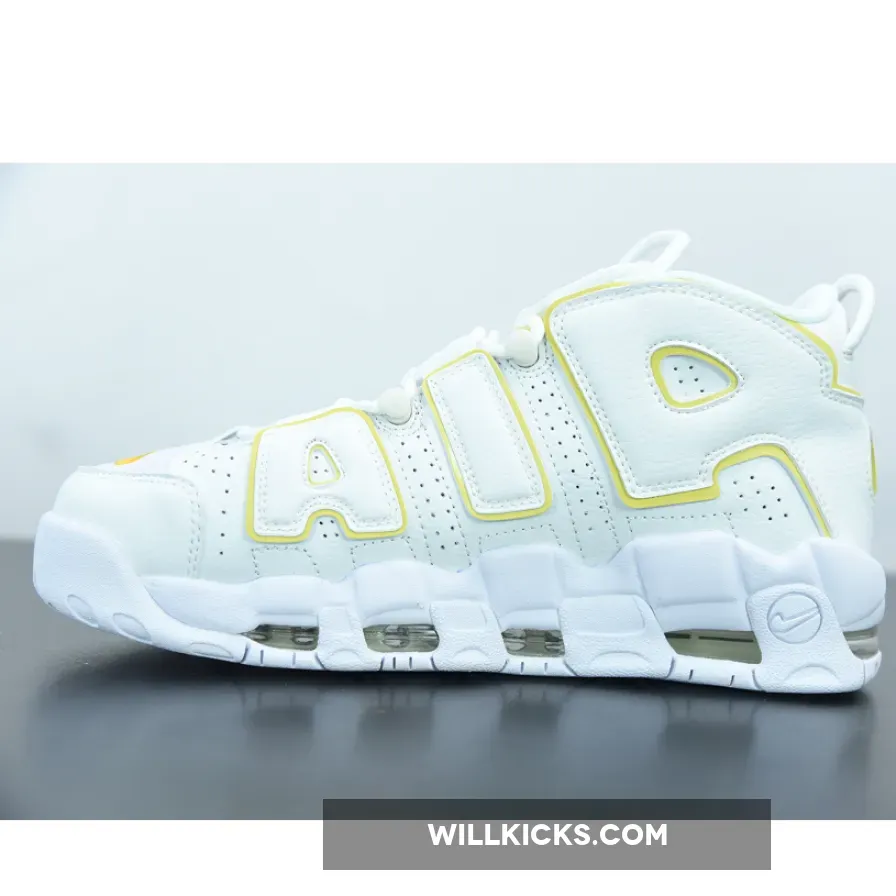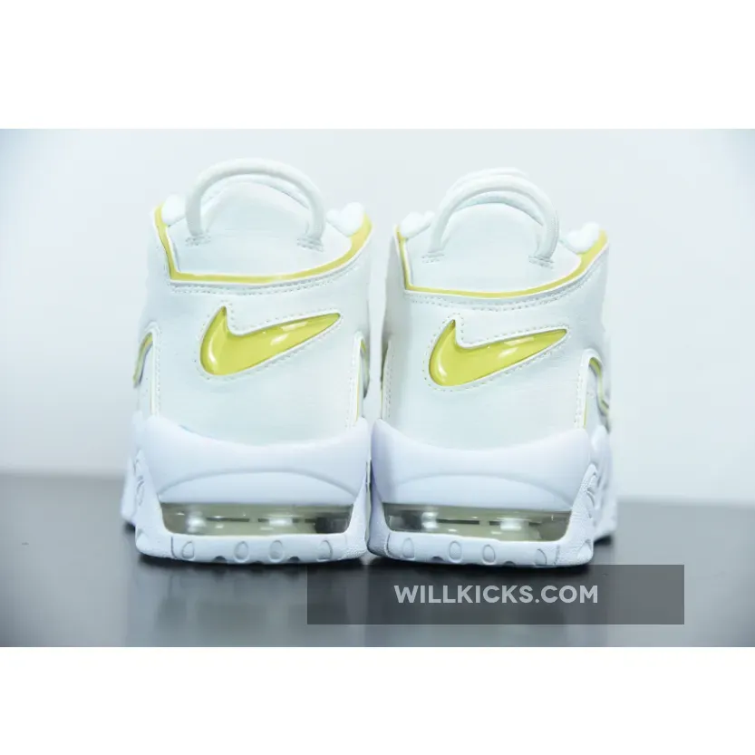This Nike Air More Uptempo utilizing a clean and simple theme of White and Light Citron. First, White tumbled leather adorns the upper and large ‘AIR’ on the side while Yellow hits the trimming, allowing it to stand out. Next, more Yellow outlines the Swoosh across the toe, insole branding, and Swoosh on the heel. Another unique element, we have a TPU overlay on the tongue. Finally, White runs across the midsole and rubber outsole accompanied by Yellow branding.