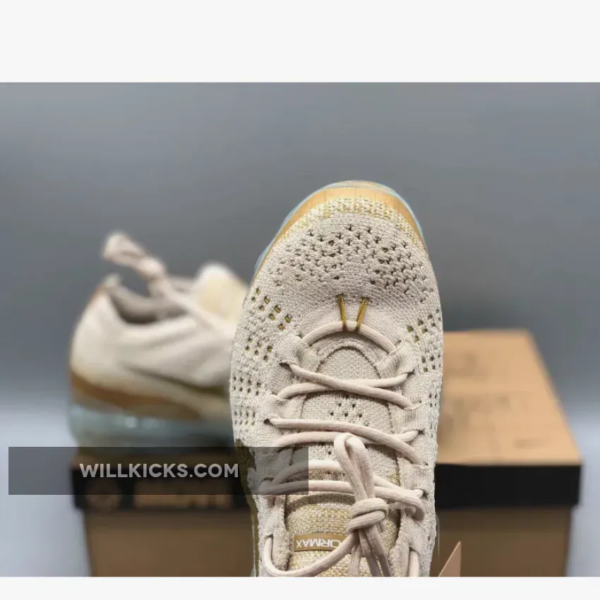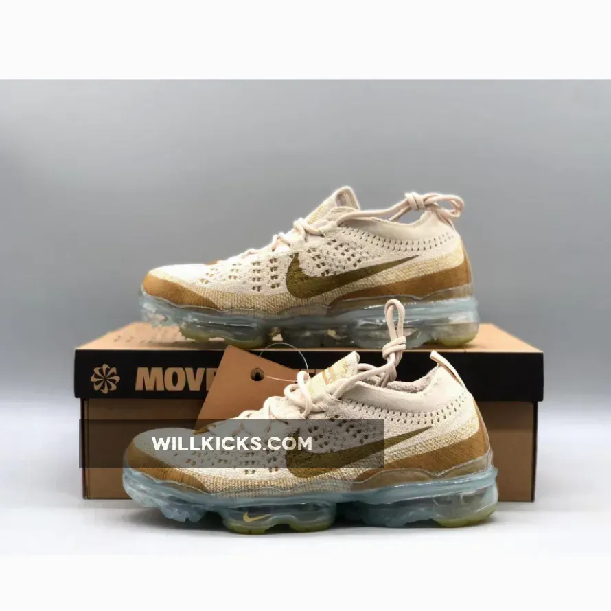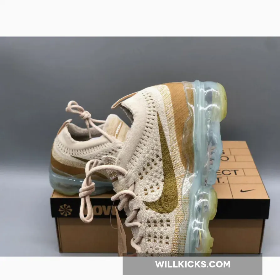 This colourway features a tan Flyknit base with darker tones on the overlays. Gold accents adorn the Swoosh and Flywire cables to complement the colour combination. The transparent full-length Air Max sole unit completes this summer-ready shoe.