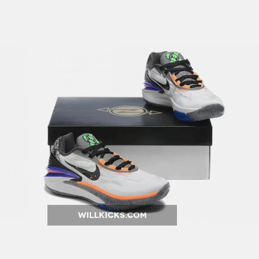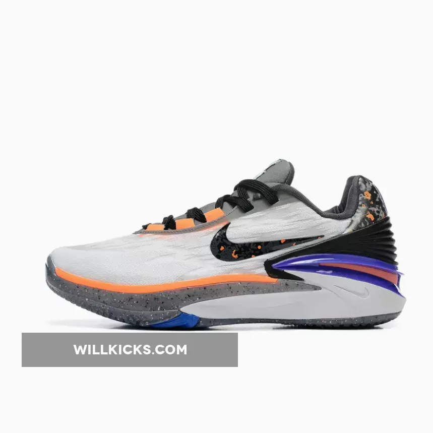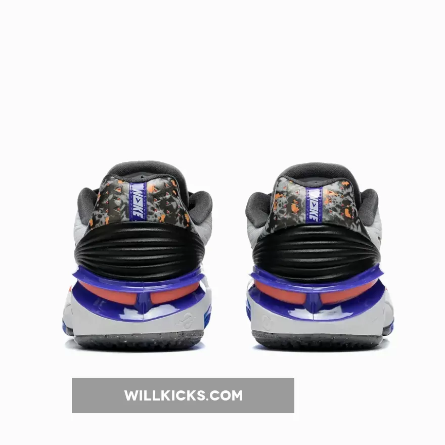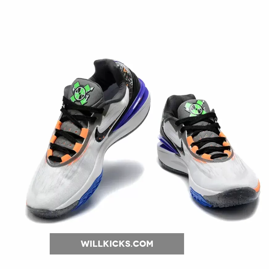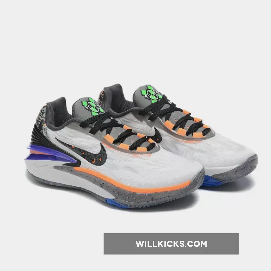 Executed atop a monochrome base, crisp white hues envelop the lightweight upper while contrasting jet-black shades surround the heel clip, laces and burned finish applied to the mid-foot Swooshes and perforated heel tabs. Aside from the shadow grey tongue and partially recycled midsole, the palette shifts to a more titular tone as oranges inject a lively personality within the sole unit and lace loops while a striking violet curtails the heel and lime green fills the appearance of an all-new X-marked insignia.