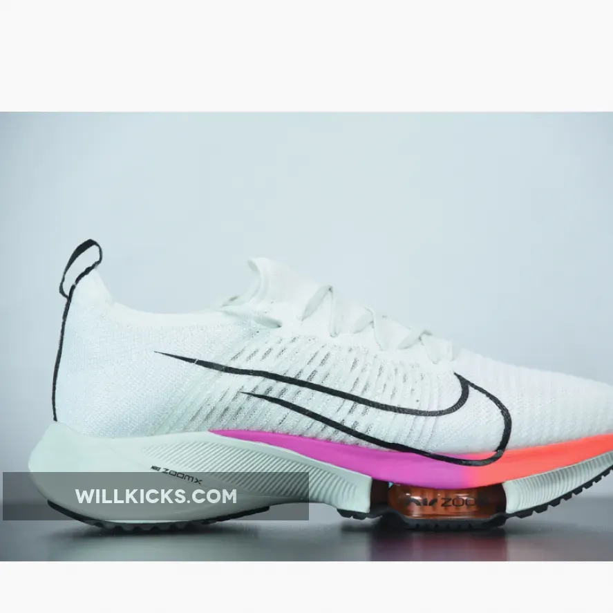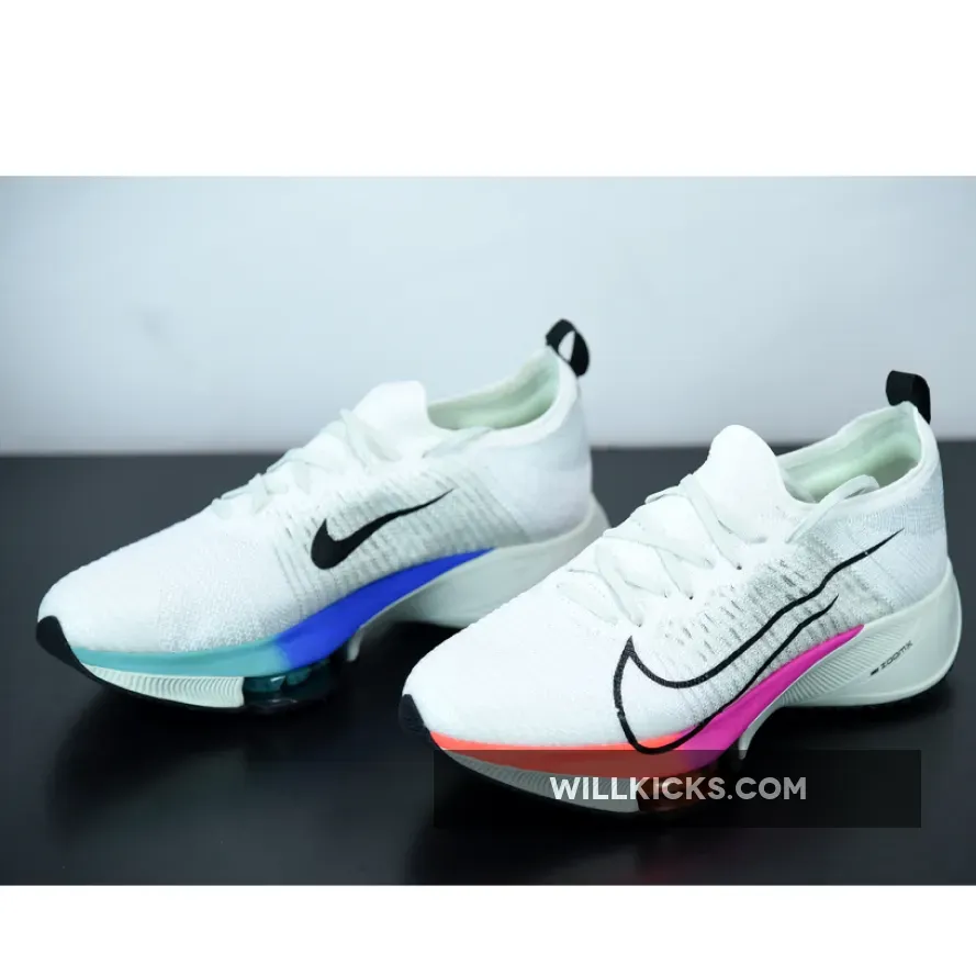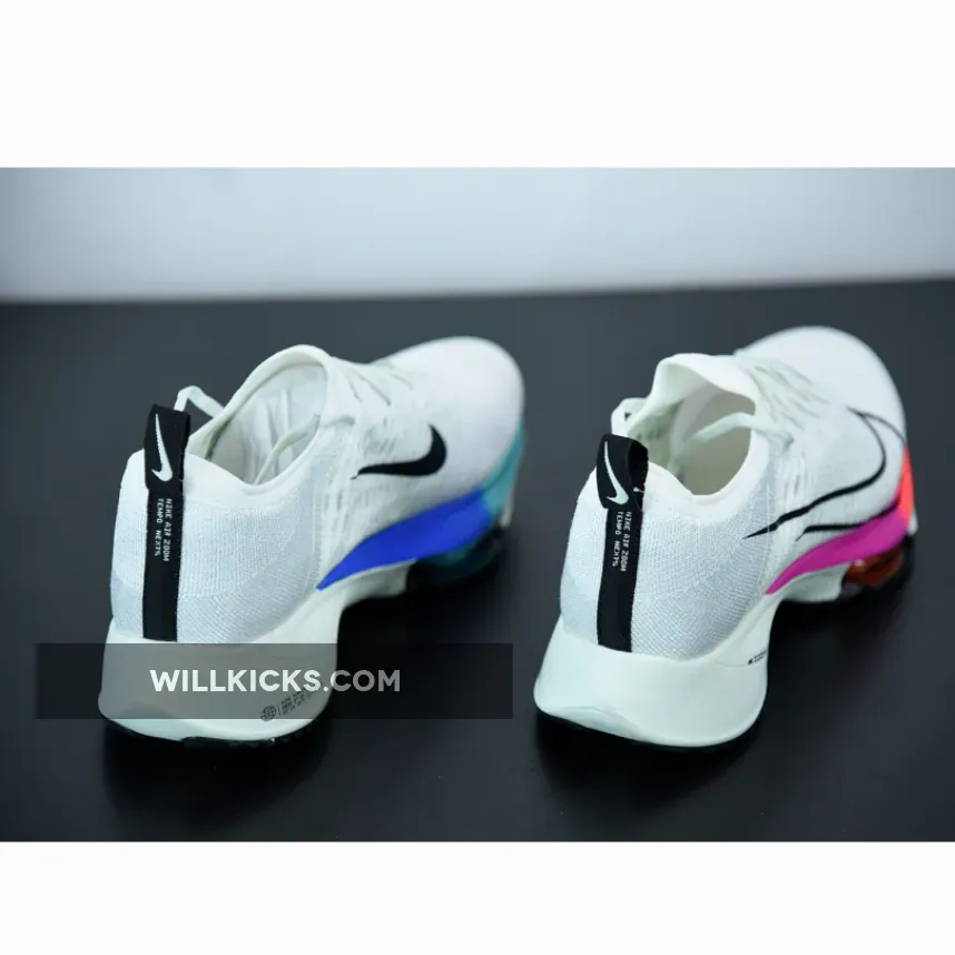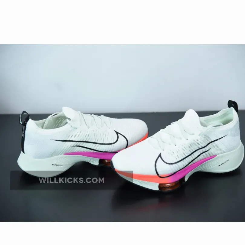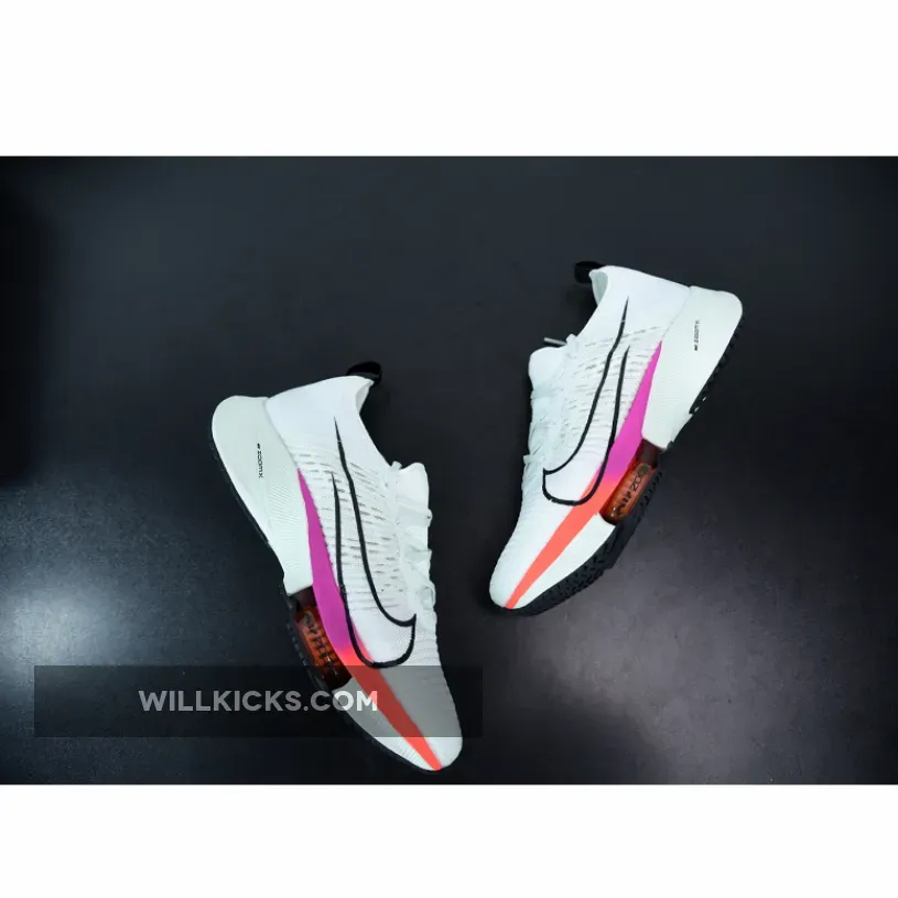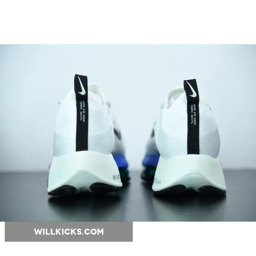 Dressed in a White, Black, Hyper Violet, Flash Crimson, and Spruce Aura color scheme. This Nike Air Zoom Tempo NEXT% features a clean White knitted upper with Black Swooshes on the sides highlighted with alternating gradient midsoles and Zoom Air pods. Its signature Zoom X cushioning completes the design.