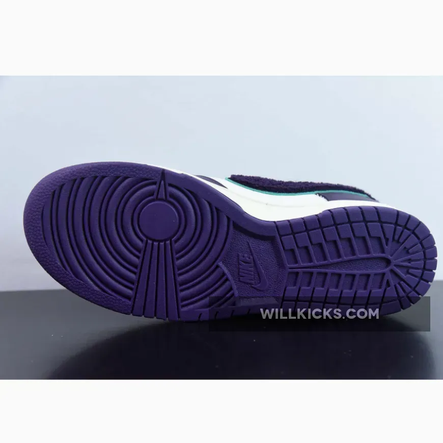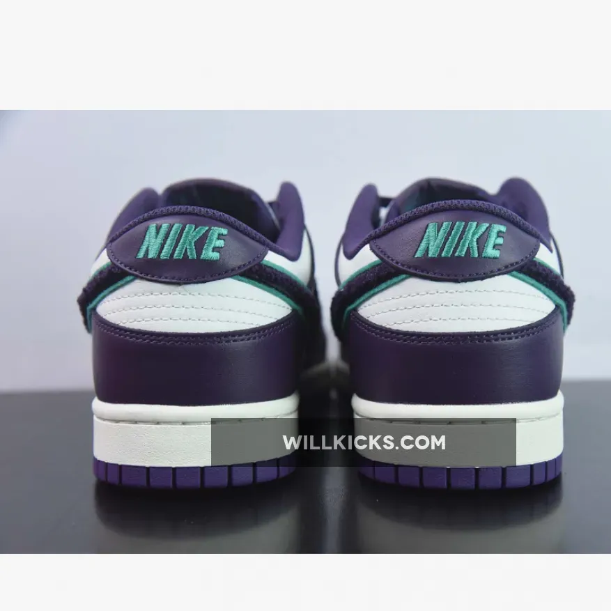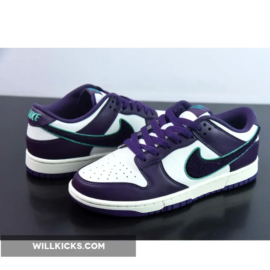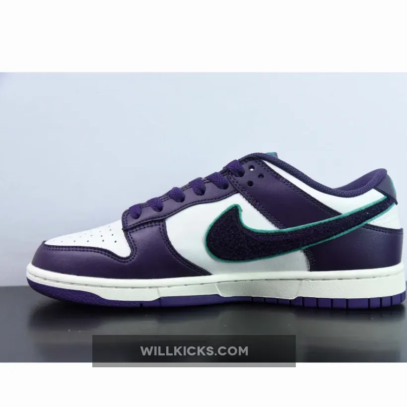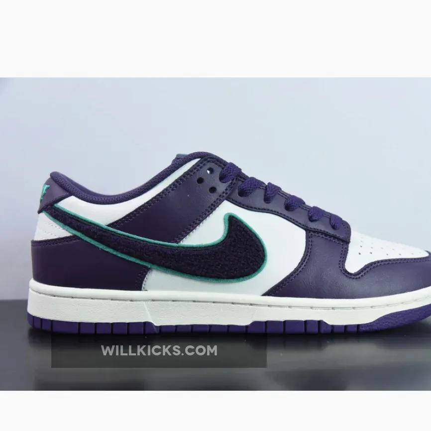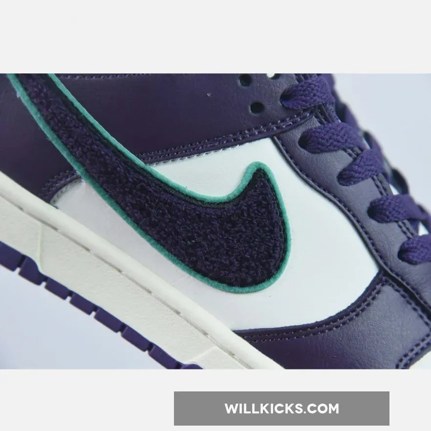 Also said to be part of a larger varsity jacket-themed “University” series, this iteration of the Nike Dunk Low Chenille Swoosh comes dressed in a White leather base contrasted by the Purple leather overlays and Aqua accents throughout. Chenille-textured Nike checks along with the smooth leather overlays, laces and interior liners are all decorated with the titular tone. “Neptune Green” is used as an accenting hue here as it furnishes the Nike branding on the tongues and heels as well as the borders of the aforementioned Swooshes. Breaking up these vivid tones comes simple white finishes atop the toe boxes, quarters and collars.