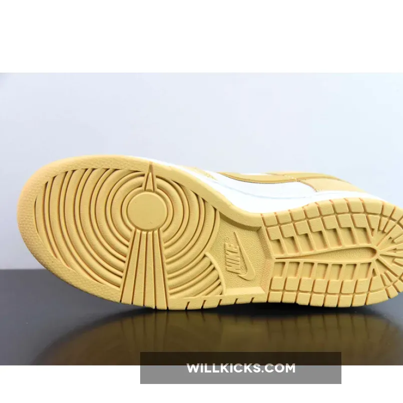 This Nike Dunk Low may be named Gold Suede, but there is more to it than just gold. With the side panel, toe cap and parts of the heel in soft shade of off-white, the gold suede overlays on mudguard, eyestay and heel highlight the construction of the sneaker and allow it to shine. Yellow Gold patent makes an appearance on the iconic Swoosh and the rectangular logo patches on the tongue. A fresh white midsole is stitched to the upper, and grounded by an outsole that perfectly matches the Gold Suede details. The Nike logo is stitched in black on the gold collar patch for maximum effect. Double and triple stitching on the heel emphasise the quasi-artisanal quality of this coveted sneaker.