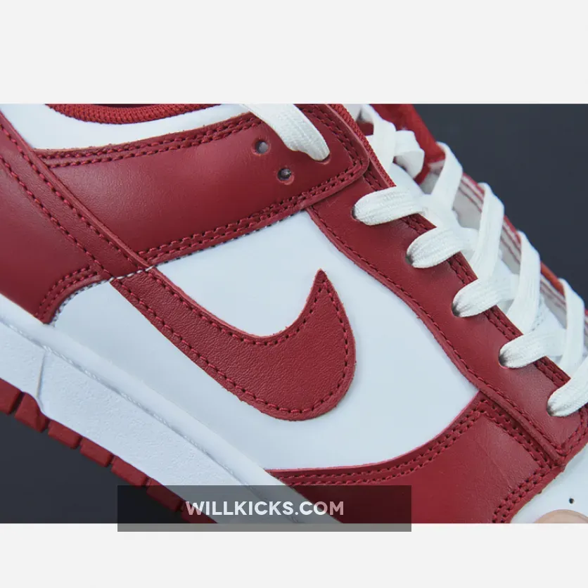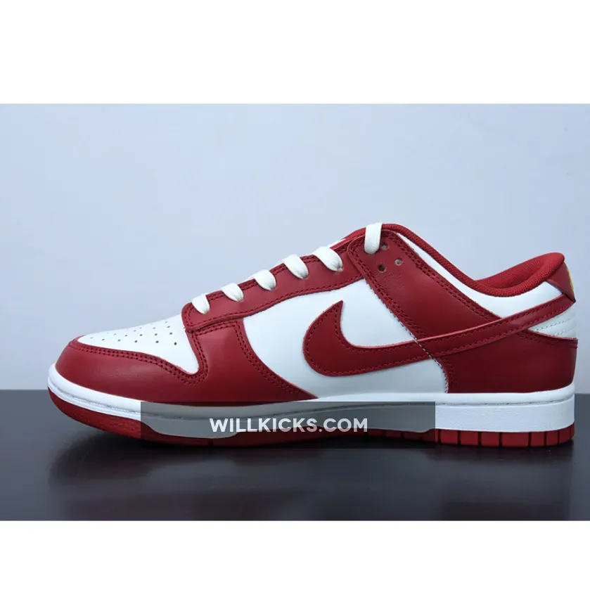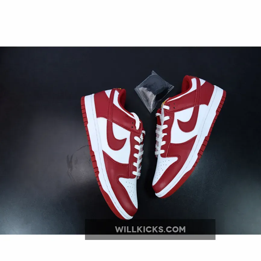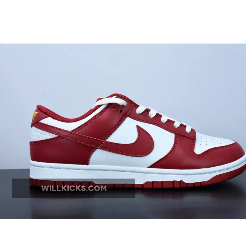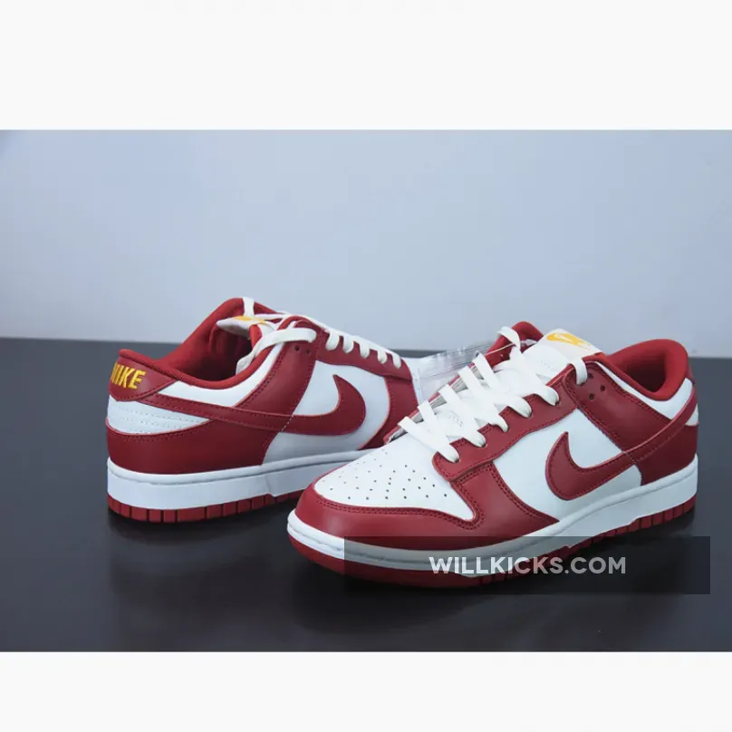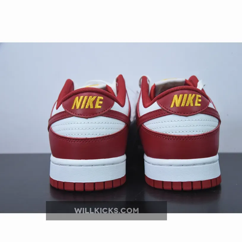 A cool for school pair, the Nike Dunk Low Gym Red pays homage to the University of Southern California by adopting its official colour palette. Similar to the original Dunk, this iteration showcases a classic colour blocking, with the smooth white leather base acting as the blank canvas for bright red leather overlays and Swooshes to take the vanguard. This shoe sports the class two-tone colour scheme of the Dunk Low, but this time the overlays and the profile Swooshes along the quarters are in a bold and dramatic Gym Red. The base is the blank canvas in smooth and perforated white leather. A pop of yellow adds another dimension of interest to this pair. The Nike branding on the white nylon tongue is golden yellow. This same yellow appears once again as the Nike branding on the all-red insole.
