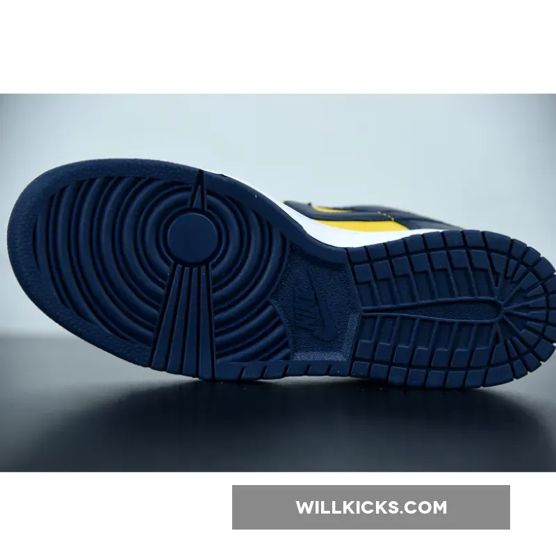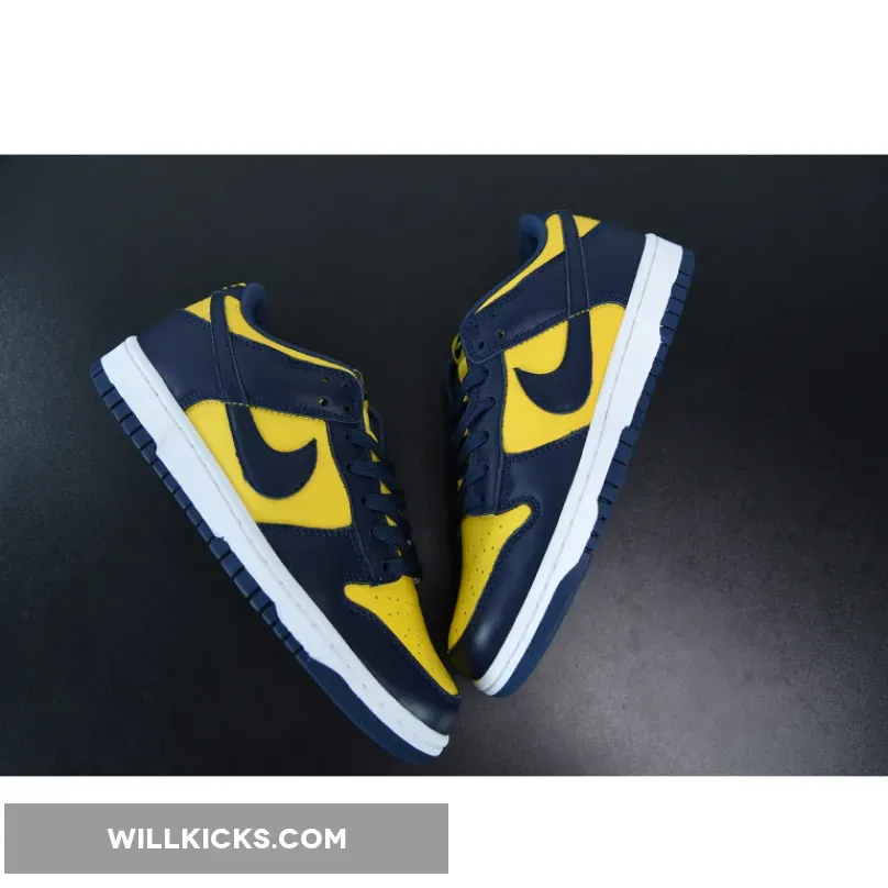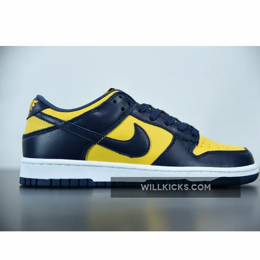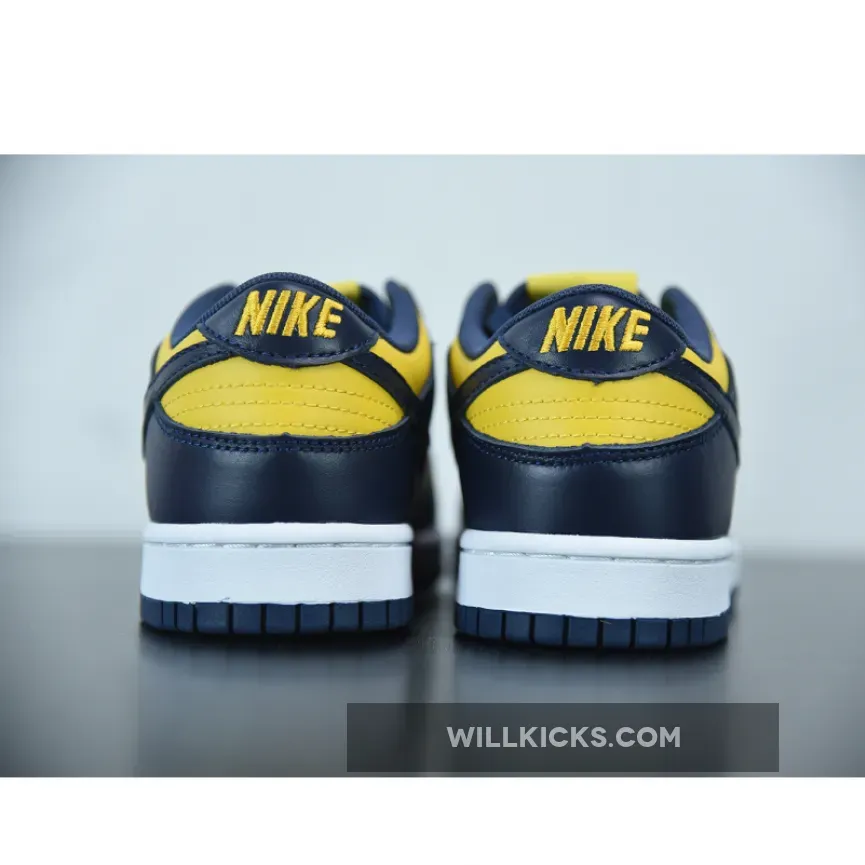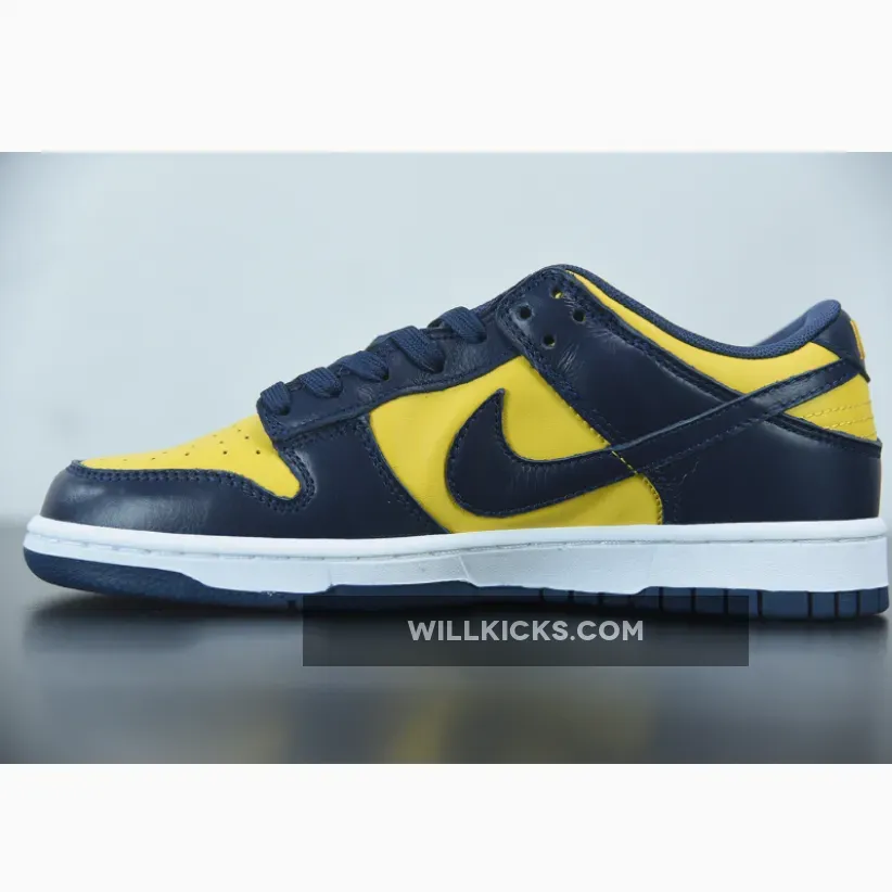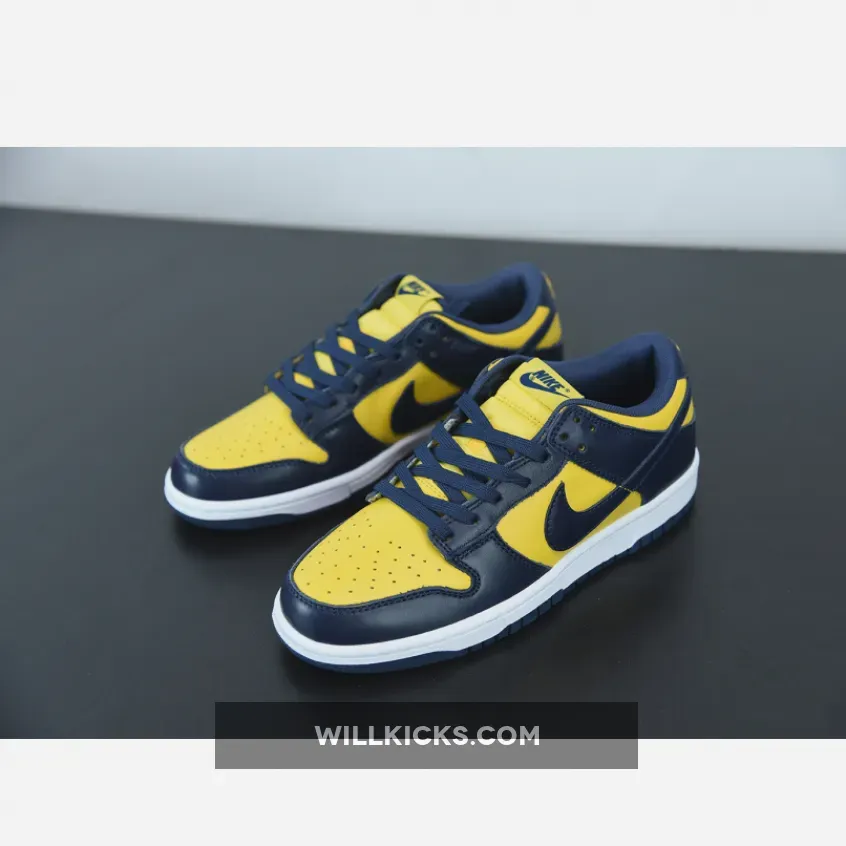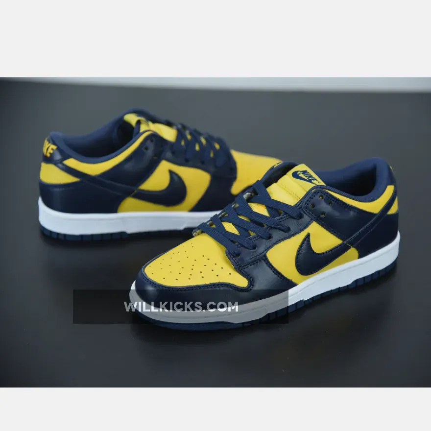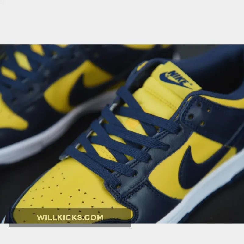 This offering of the Nike Dunk Low features a Varsity Maize smooth leather upper with a signature perforated toe box and Midnight Navy overlays and Swoosh logos. Navy continues on the inner lining, laces, Yellow tongue tags, heels, and rubber outsole atop a White midsole to complete the design.