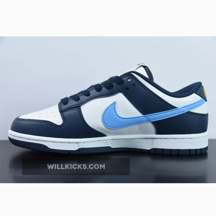 This low-cut Dunk has a smooth leather base in pristine white. The leather overlays on the toe cap, mudguard, eye stay panel, foxing and heel tabs are all in a dark navy blue, matching the tongue lining, mesh sock liner, tongue branding and insoles. “University Blue” is then applied to the Swoosh as well as the logo hits atop the insoles, while orange threads highlight the “NIKE” embroidery stitched into the heel tab. A white midsole and a navy rubber outsole finish off the look of this sneaker.