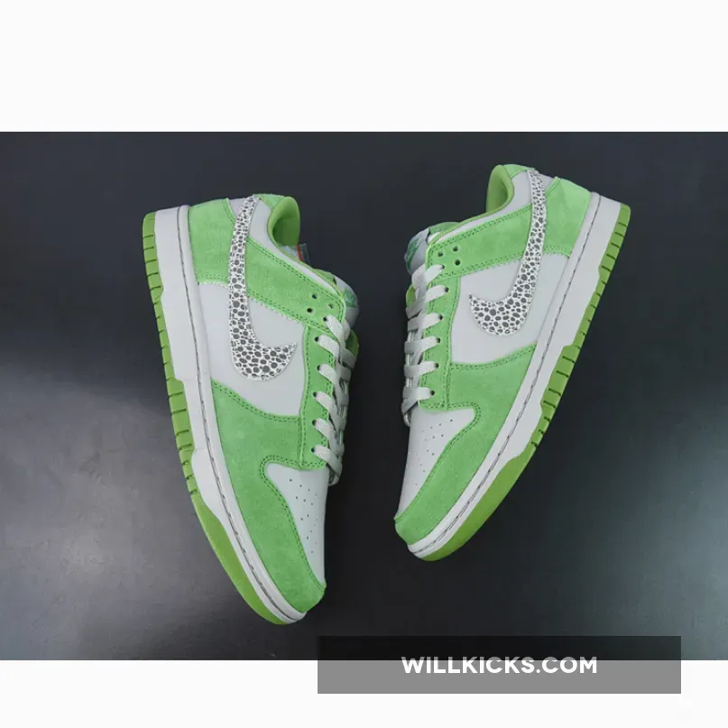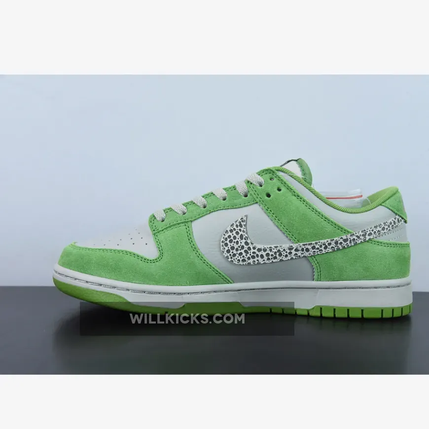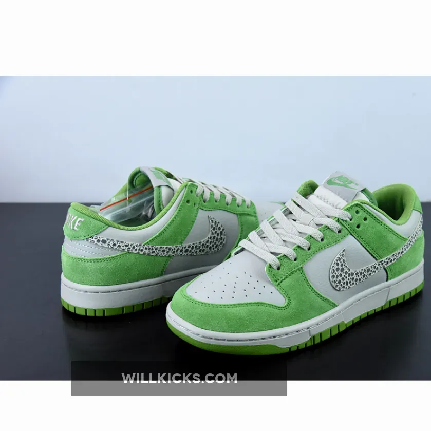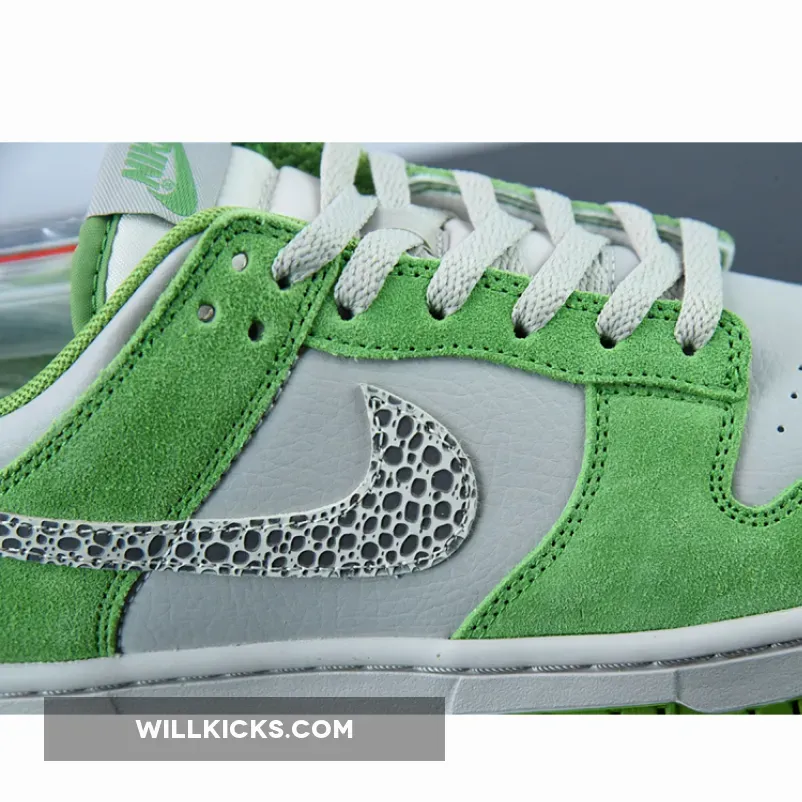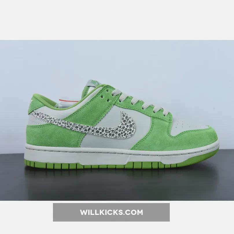 The Nike Dunk is getting a green makeover with a wild twist. Meet the Nike Dunk Low Chlorophyll that, unlike the SB Dunk Low Chlorophyll, is an unashamed celebration of the colour green.As part of the ‘Safari’ pack, this Dunk Low is decorated with a leopard print Swoosh. Suede overlays appear in the titular green colouring, dressing the toe cap, eyelets, ankle and heel.