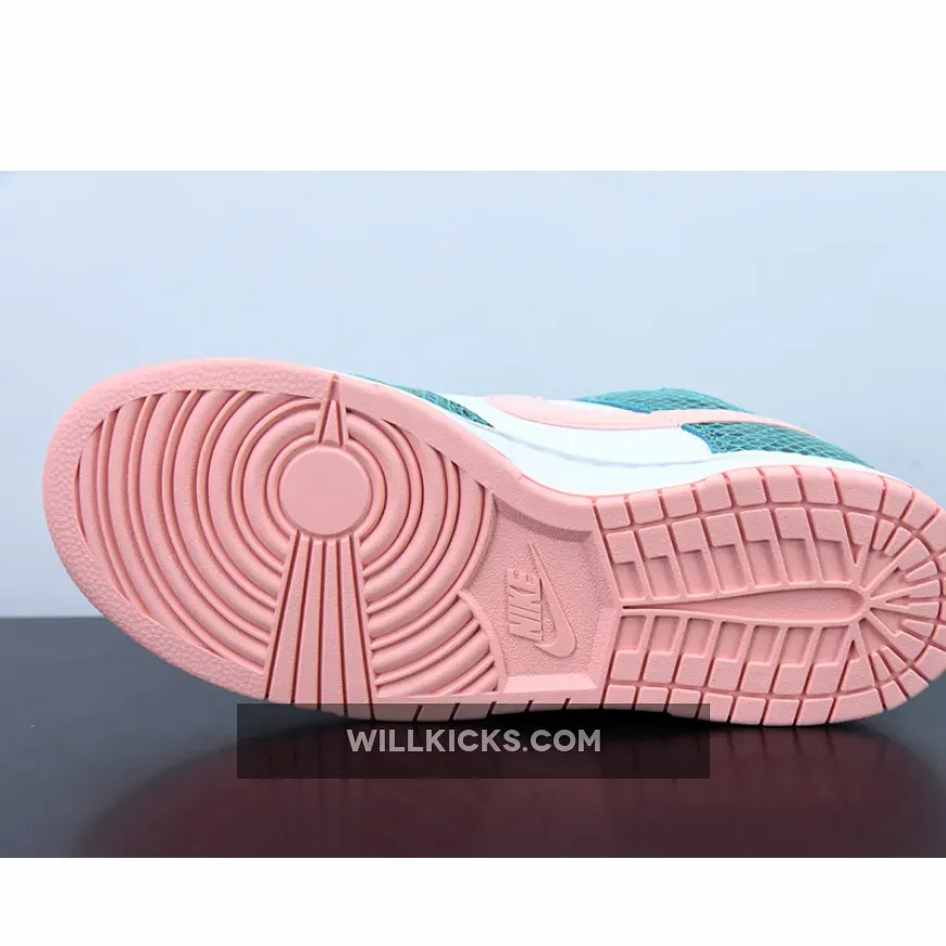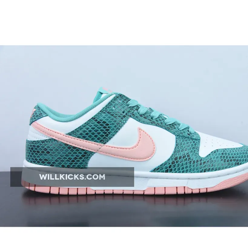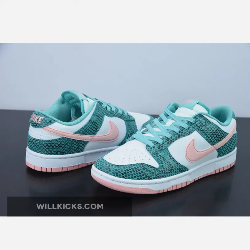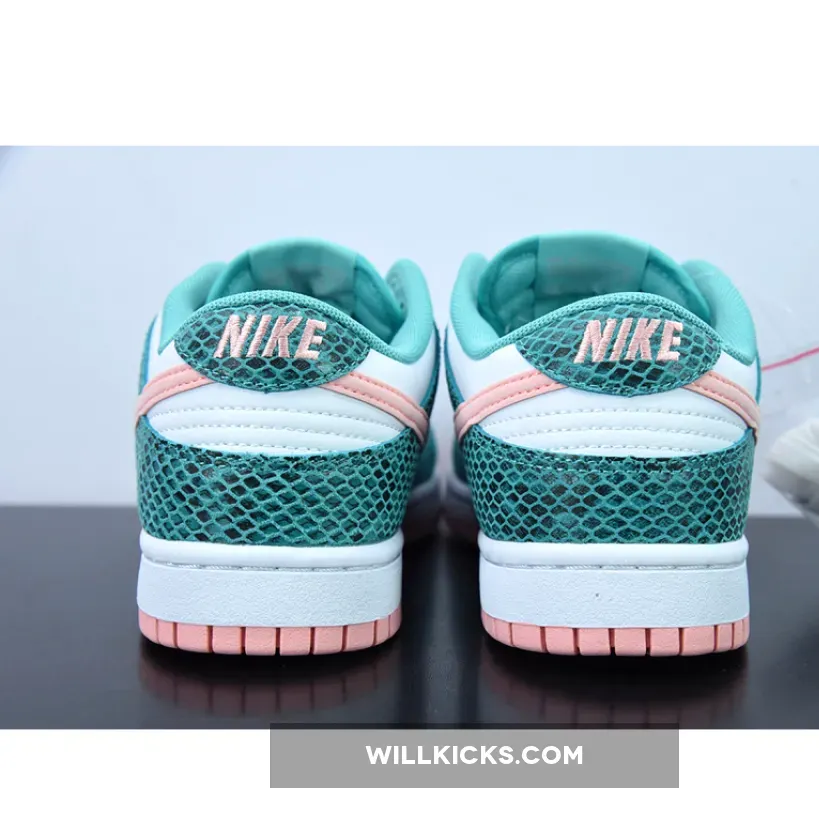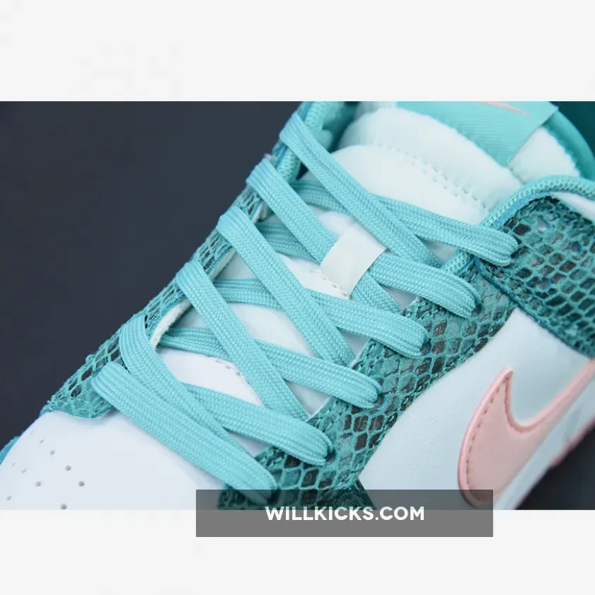 The Nike Dunk Low adds a touch of exoticism to its latest variant, the Nike Dunk Low Snakeskin. The teal green hue continues onto the laces, the tongue tab and the mesh sockliner. A pop of pink adds more character to the shoe on the signature profile Swooshes.