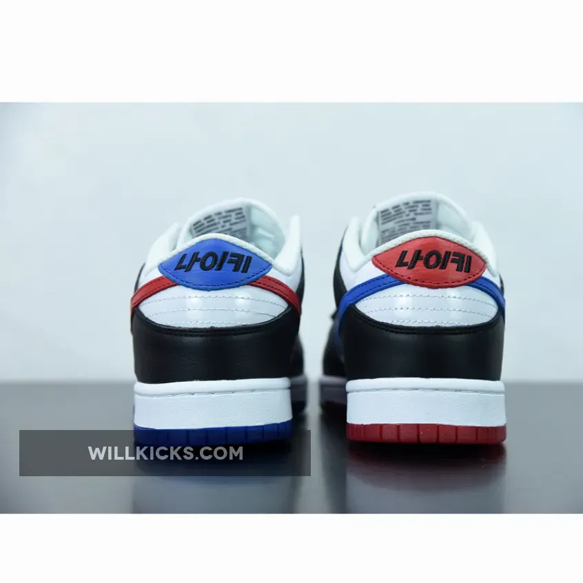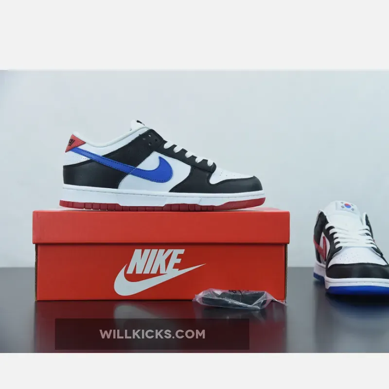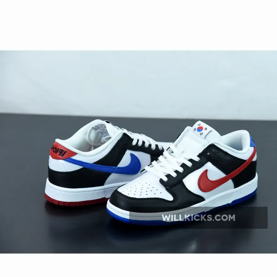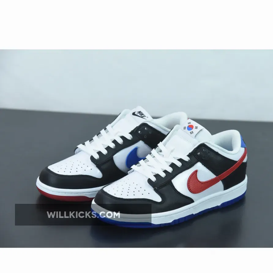 As you can see, this Nike Dunk Low features colors that are taken from the Korean flag, which also lands on the left tongue. Next, White leather lands on the base while Black adorns the overlays. We then have mismatch Red and Blue Swoosh logos along with a translucent outsole. Lastly, Korean characters land on the heel, and White covers the midsole to finish the look.