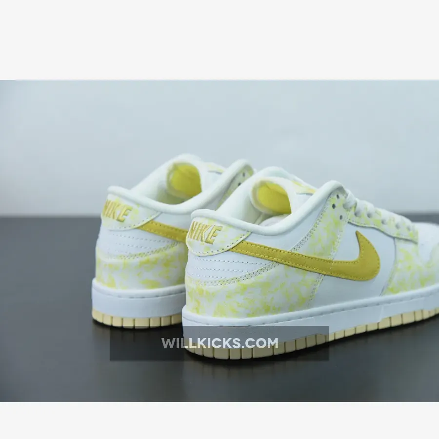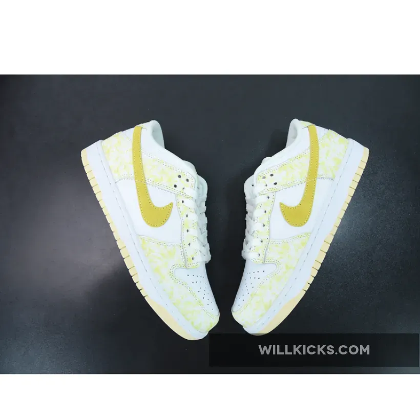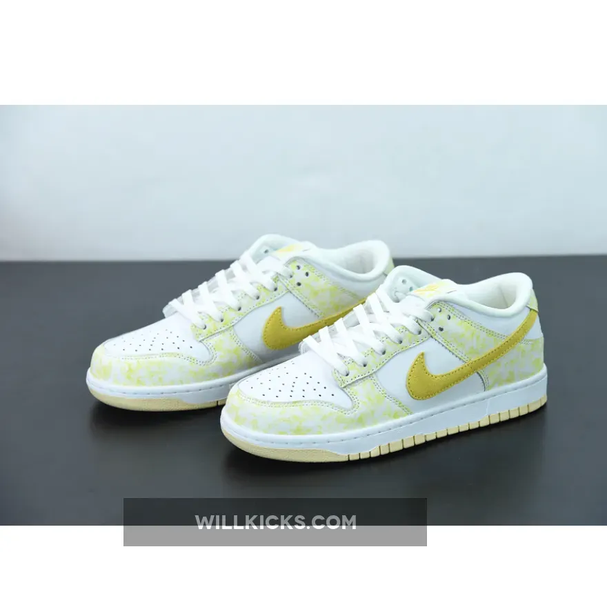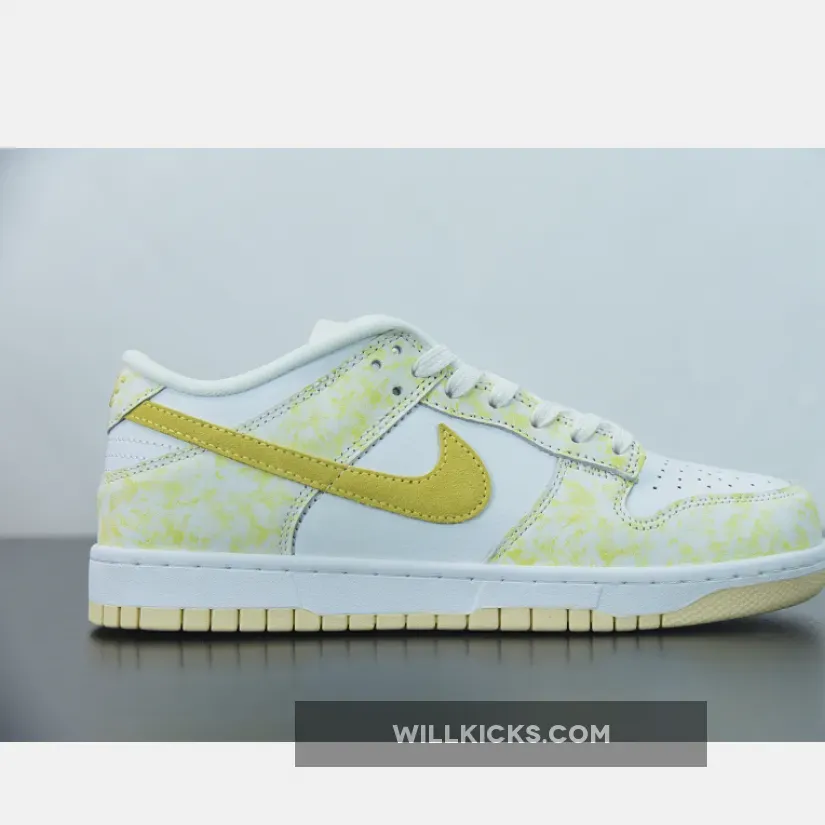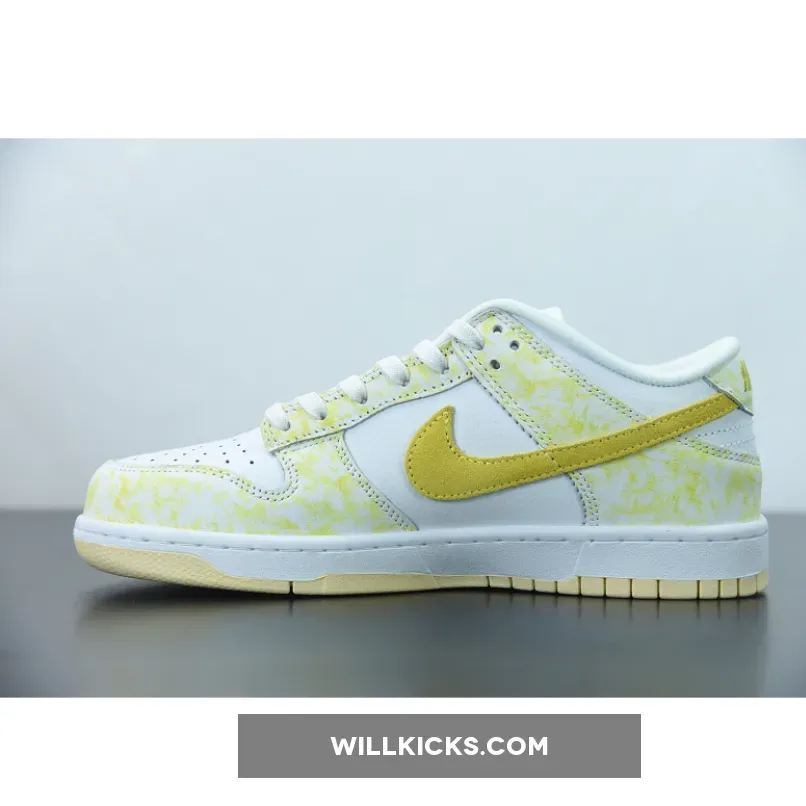 this Nike Dunk Low comes dressed in a Yellow Strike and White color combination. Looking closer, the pair features an acid wash-like upper that mixes White and Yellow on the overlays and tongue label. Next, Yellow suede adorns the Swoosh logos, tongue and heel branding, insoles, and a pastel hue on the outsole. Finally, a White midsole finishes the look.