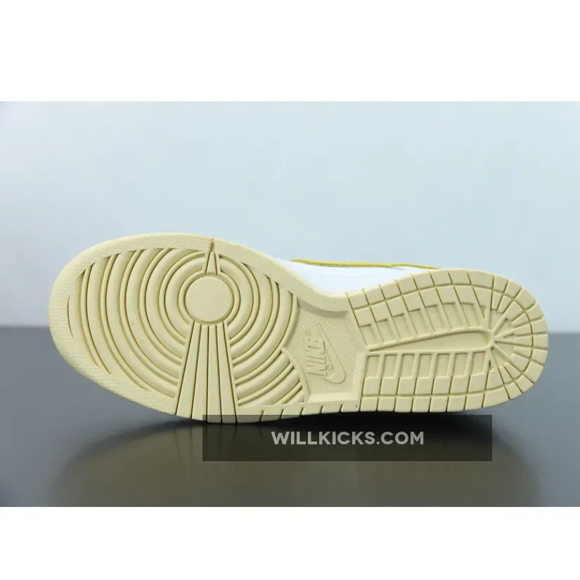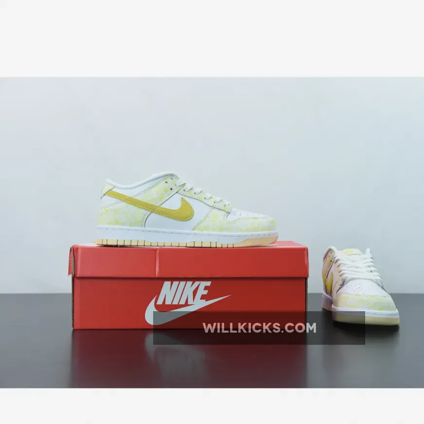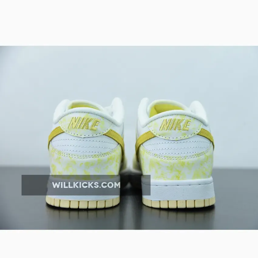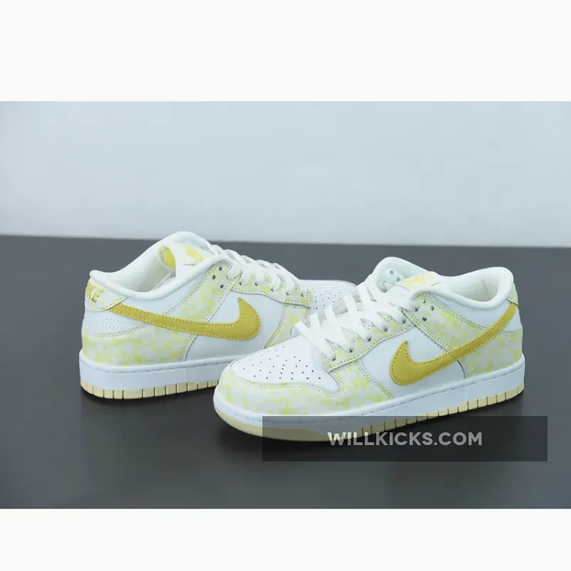 this Nike Dunk Low comes dressed in a Yellow Strike and White color combination. Looking closer, the pair features an acid wash-like upper that mixes White and Yellow on the overlays and tongue label. Next, Yellow suede adorns the Swoosh logos, tongue and heel branding, insoles, and a pastel hue on the outsole. Finally, a White midsole finishes the look.
