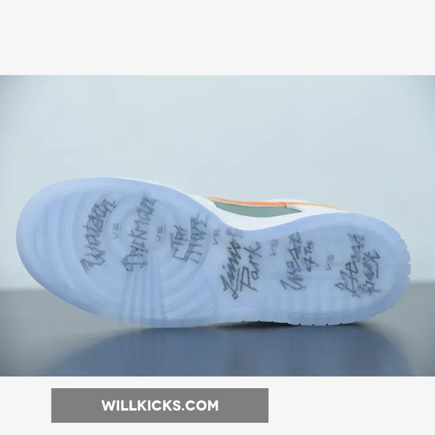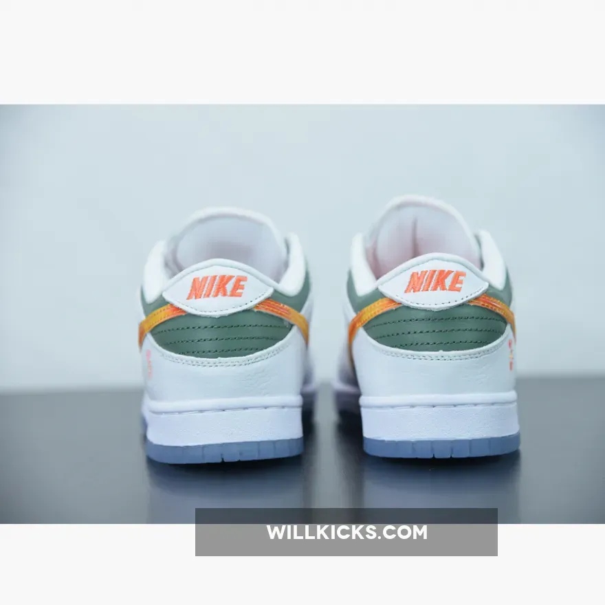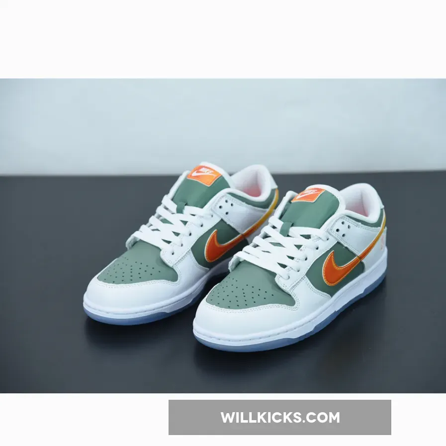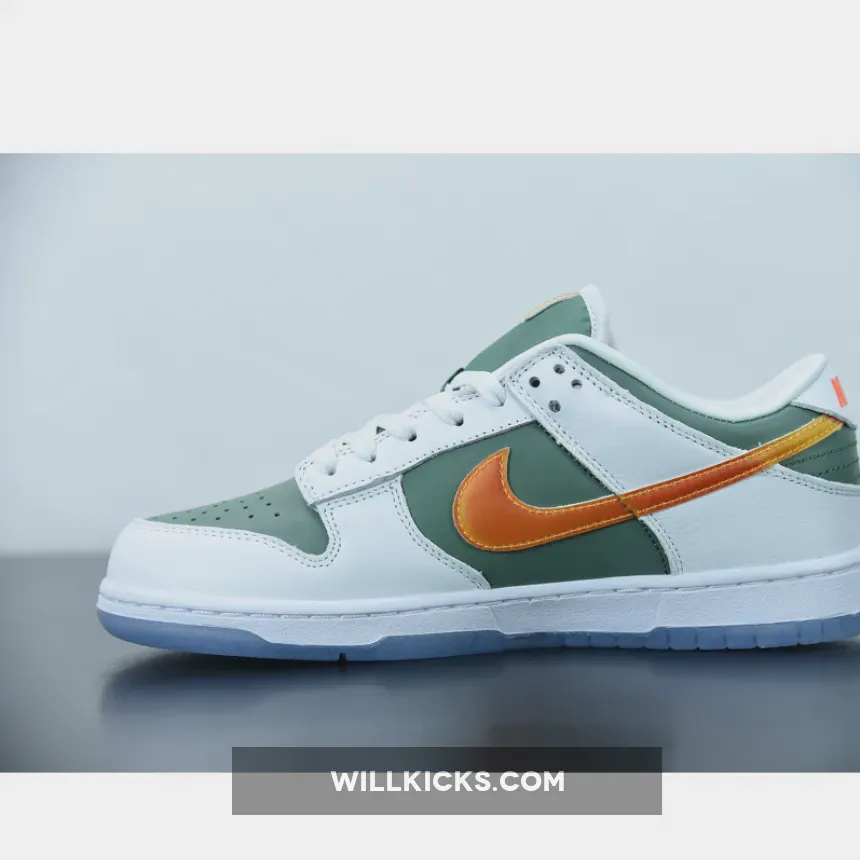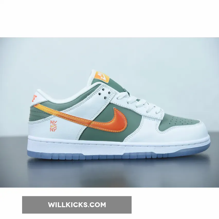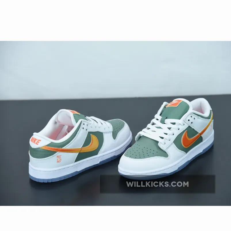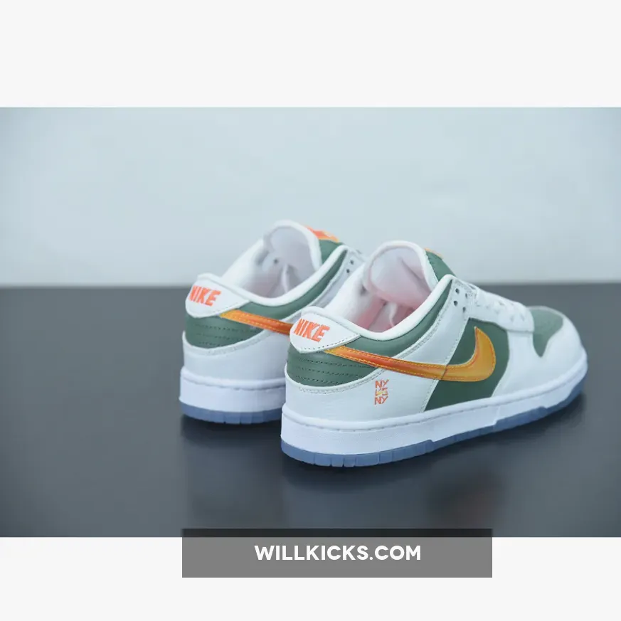 Solid color scheme on the Nike Dunk Low “NY vs NY.” The combination of Sage Green and White with Orange accents pops. Comfortable and stylish, perfect for streetwear.
