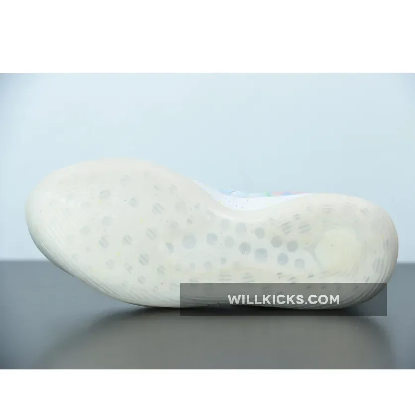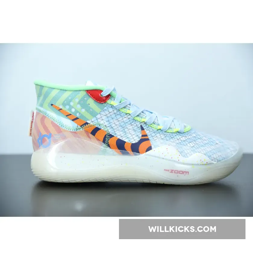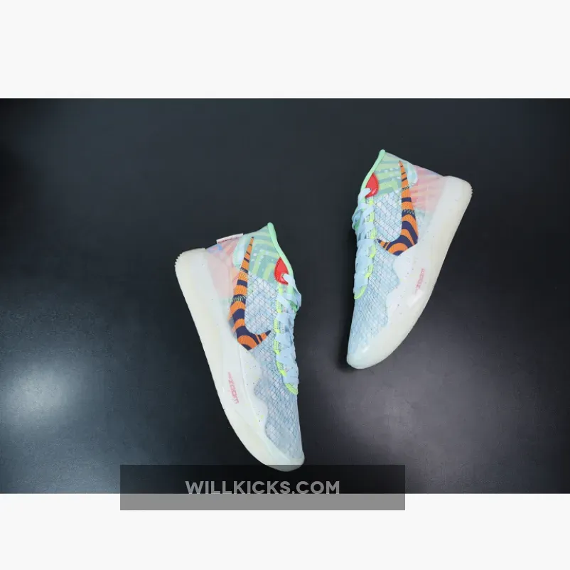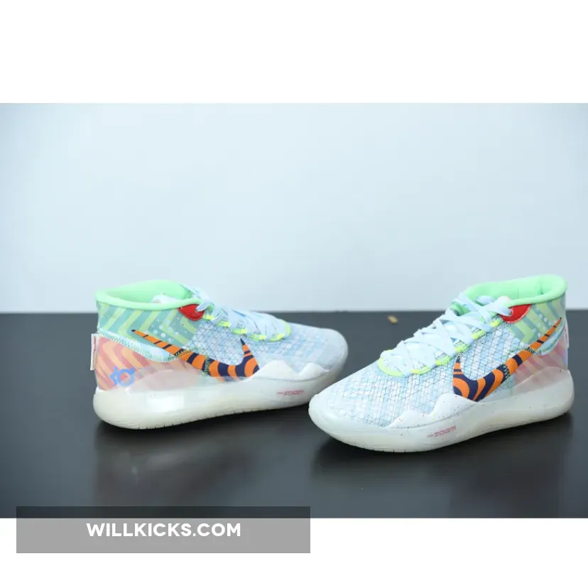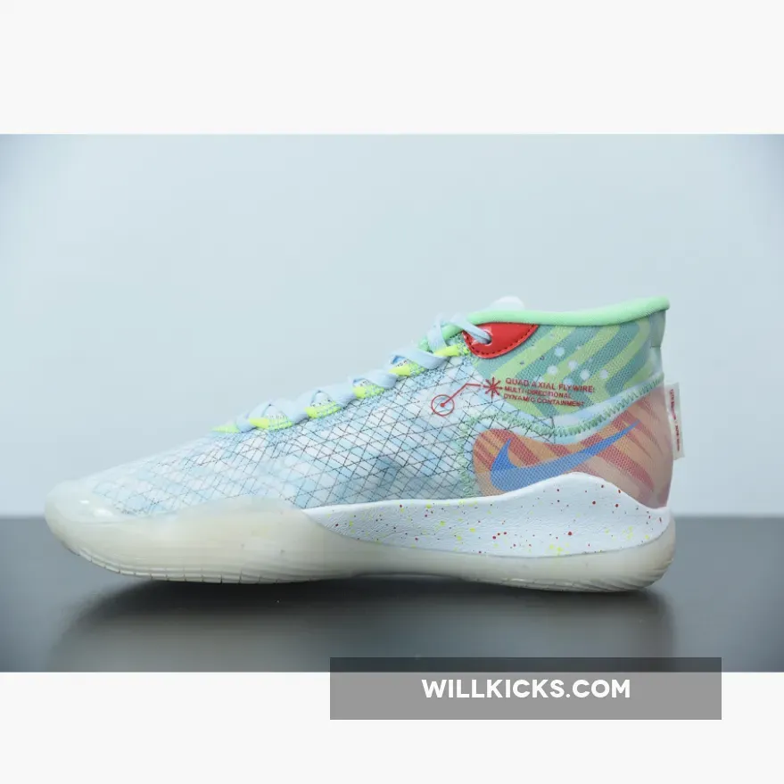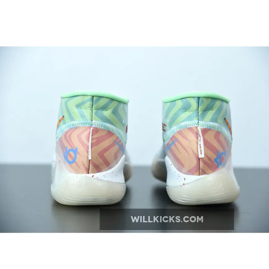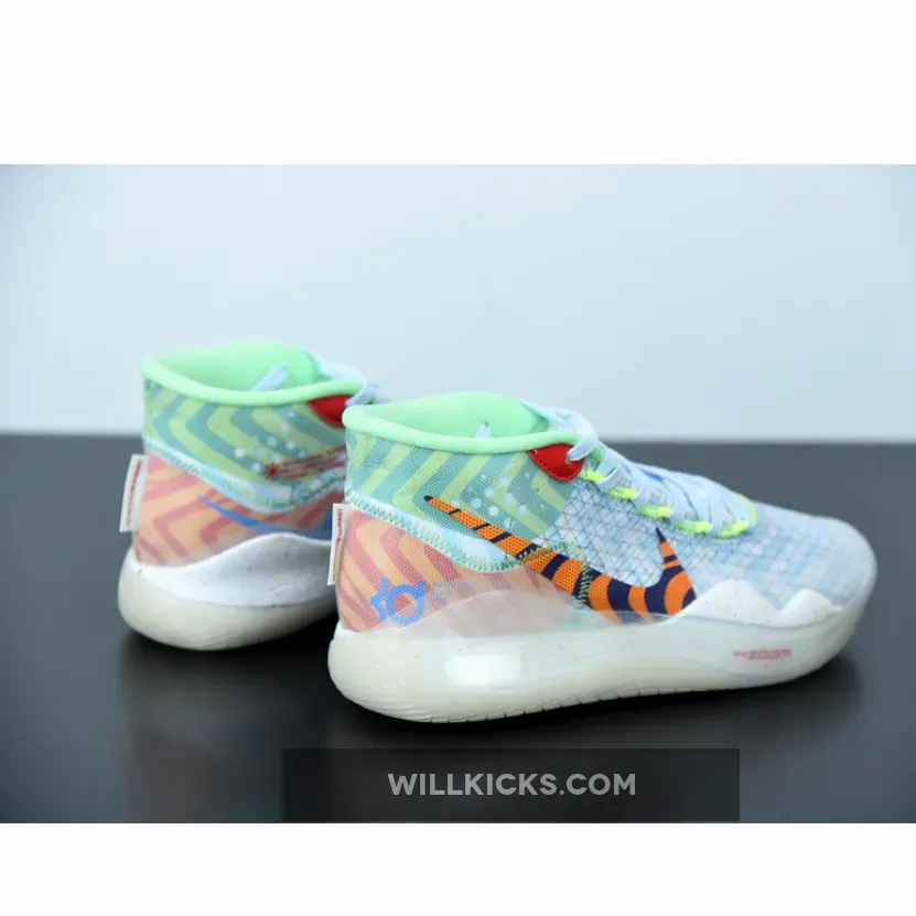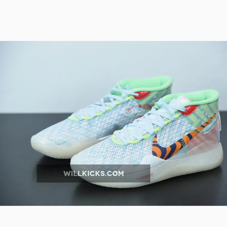 It’s easy to see hos this Nike KD 12 “Wavvy” gets its nickname, with each panel of the upper arriving with rippling detail; Sky Blue uppers come paired with White, green collars with yellow, and orange heels and Swooshes in orange and red. The barely-blue midsole comes flecked with yellow and red for a very-90s effect, while it all comes wrapped in a milky-white translucent sole unit. The visible QuadFit Mesh arrives in red — as do the boldly-colored upper eyelets, and the pair is complete with lime green liners, wavy blue tongues, and green and gold lacestay lining.