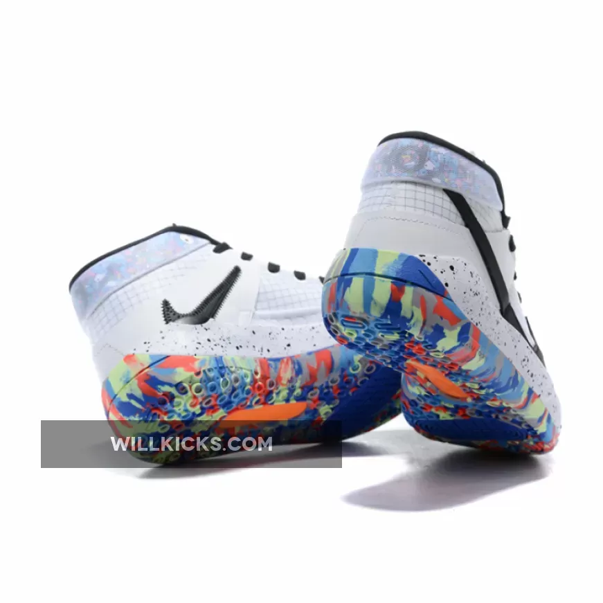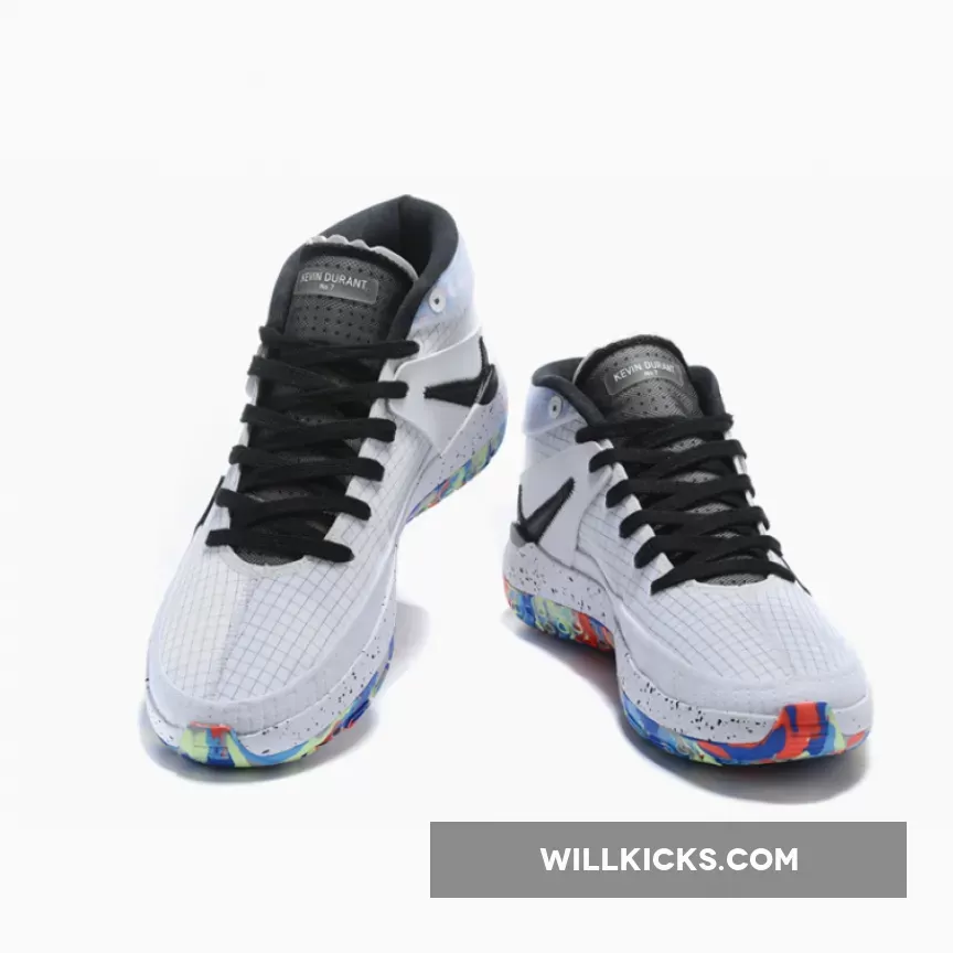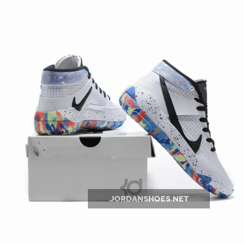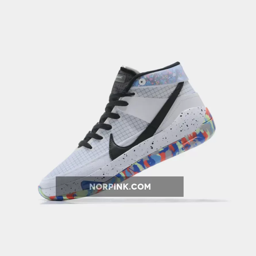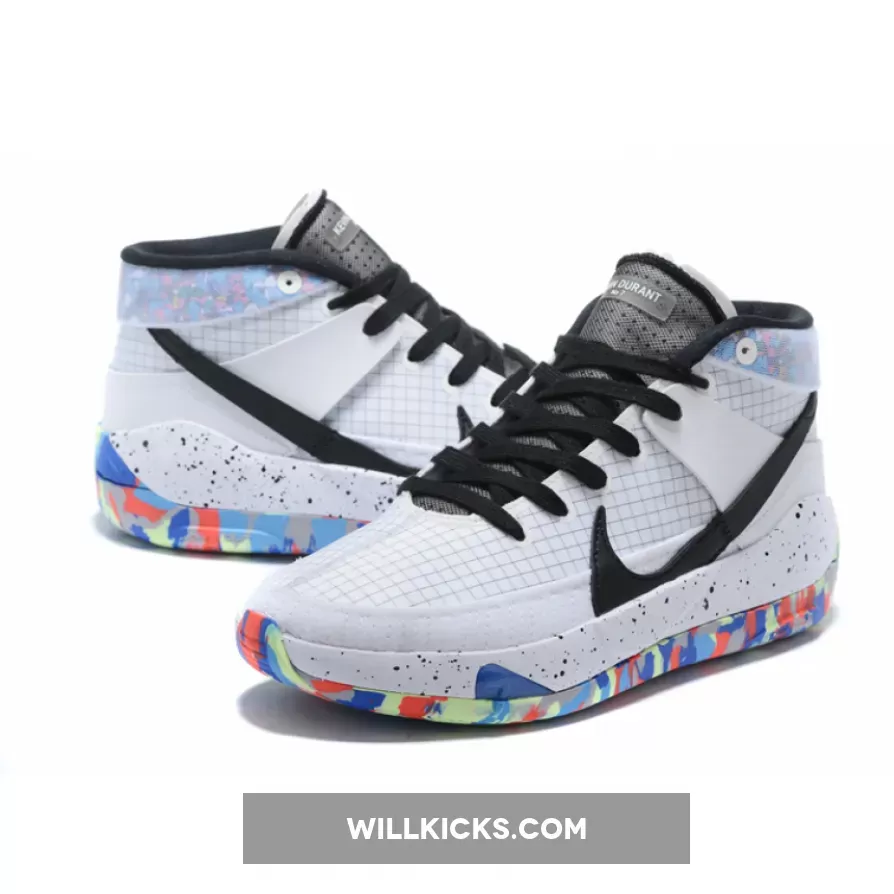 This Nike KD 13 comes dressed in a Multi-Color, Racer Blue and Smoke Grey color combination. Highlighted with White on the base while a Black grid runs across the base. The same shade then lands on the tongue, laces, Swoosh logo and speckled midsole. Completing the look is Multicolor camouflage graphic on the heel and rubber outsole.