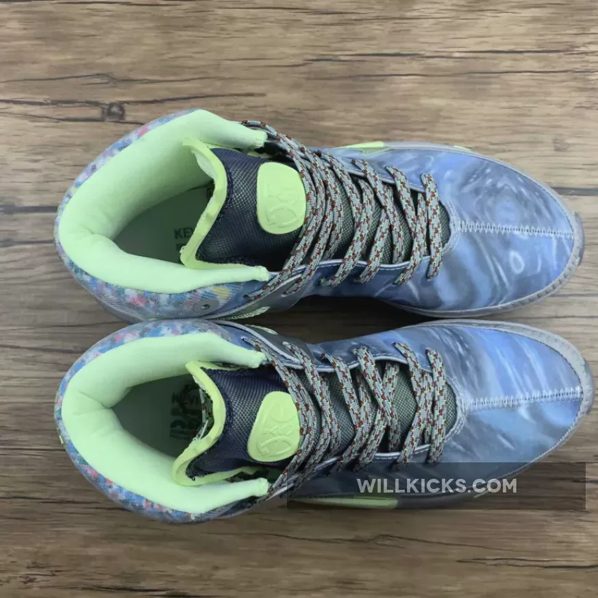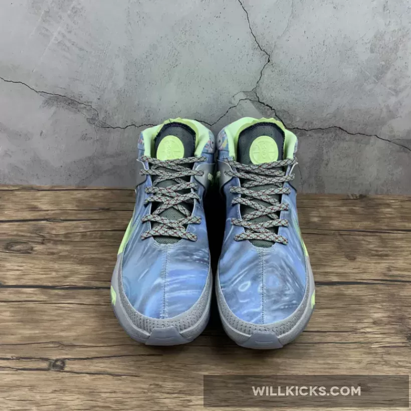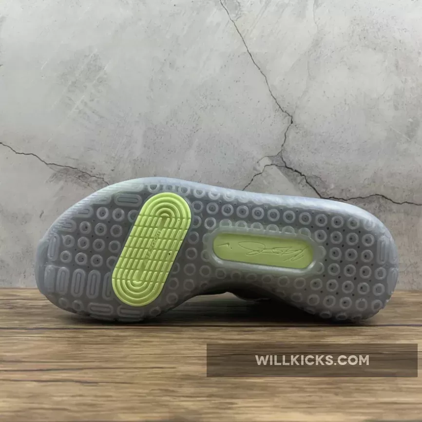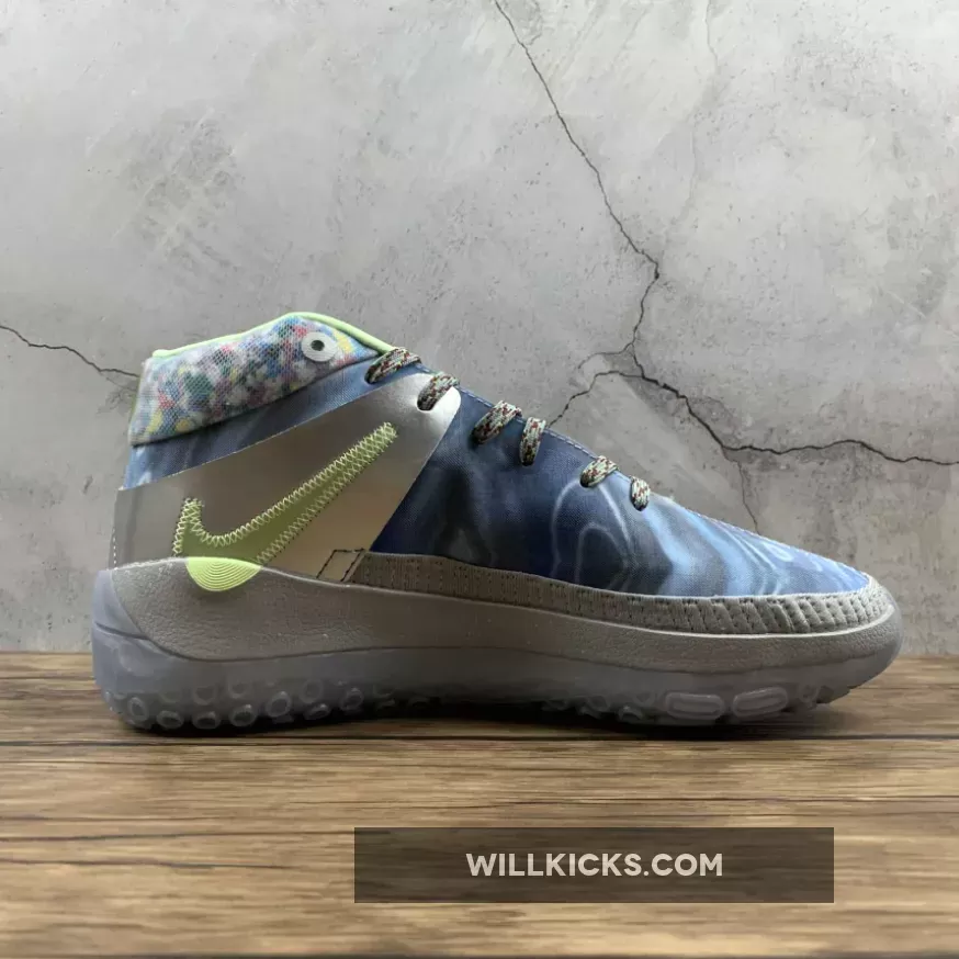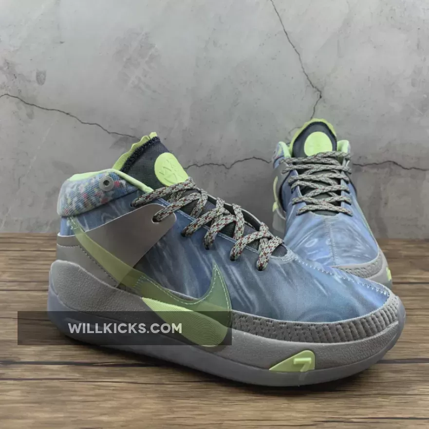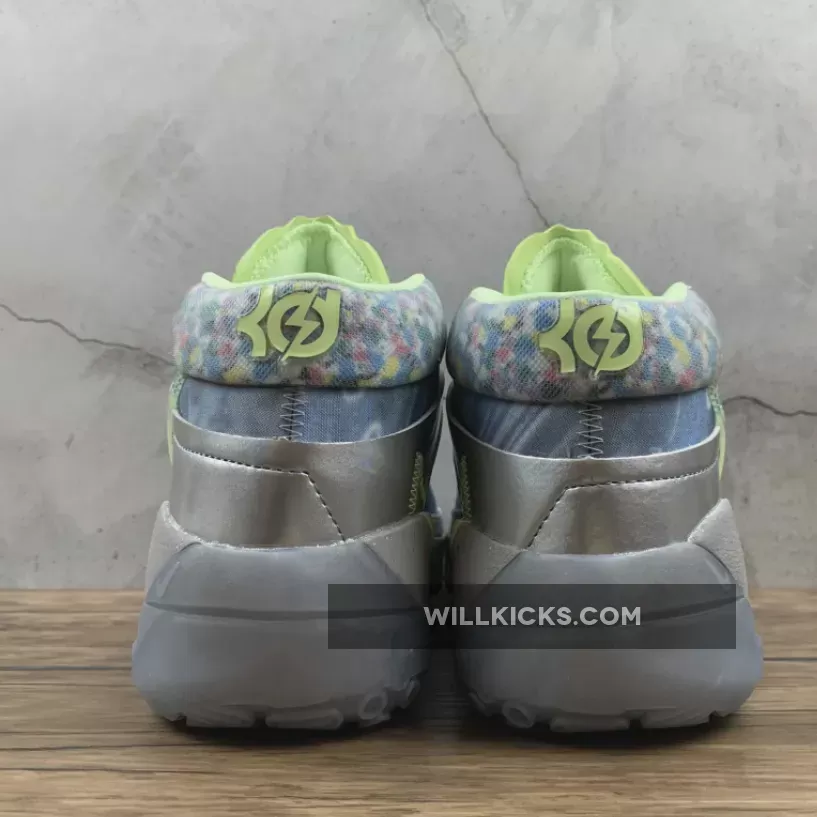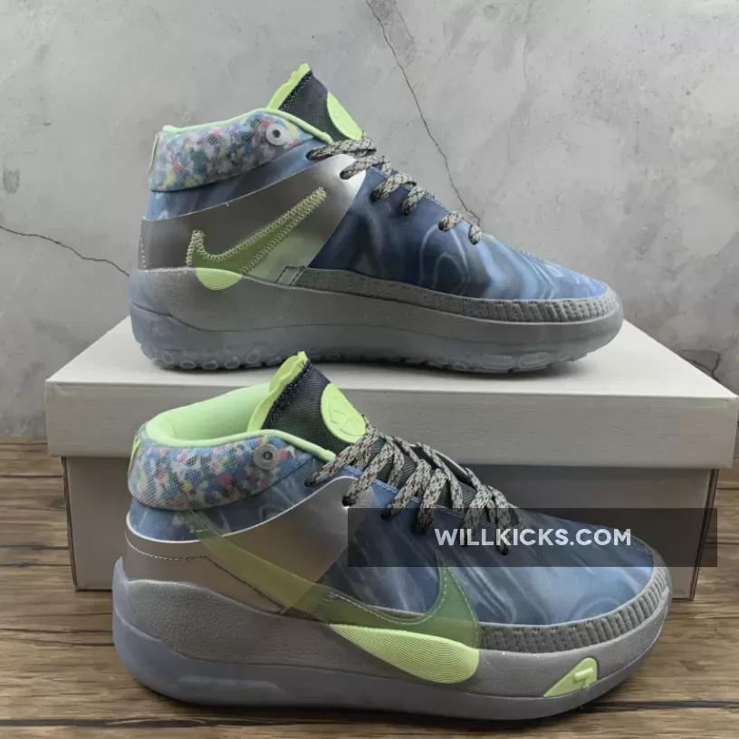 Dressed in a Platinum Tint and Barely Volt color scheme. This Nike KD 13 features a Platinum-colored upper detailed with Multicolor patterns and graphics. Iridescent flaps, Volt accents on the Swooshes, lining, and tongue emblems with recycled materials used on the padded collars atop a translucency outsole completes the design.