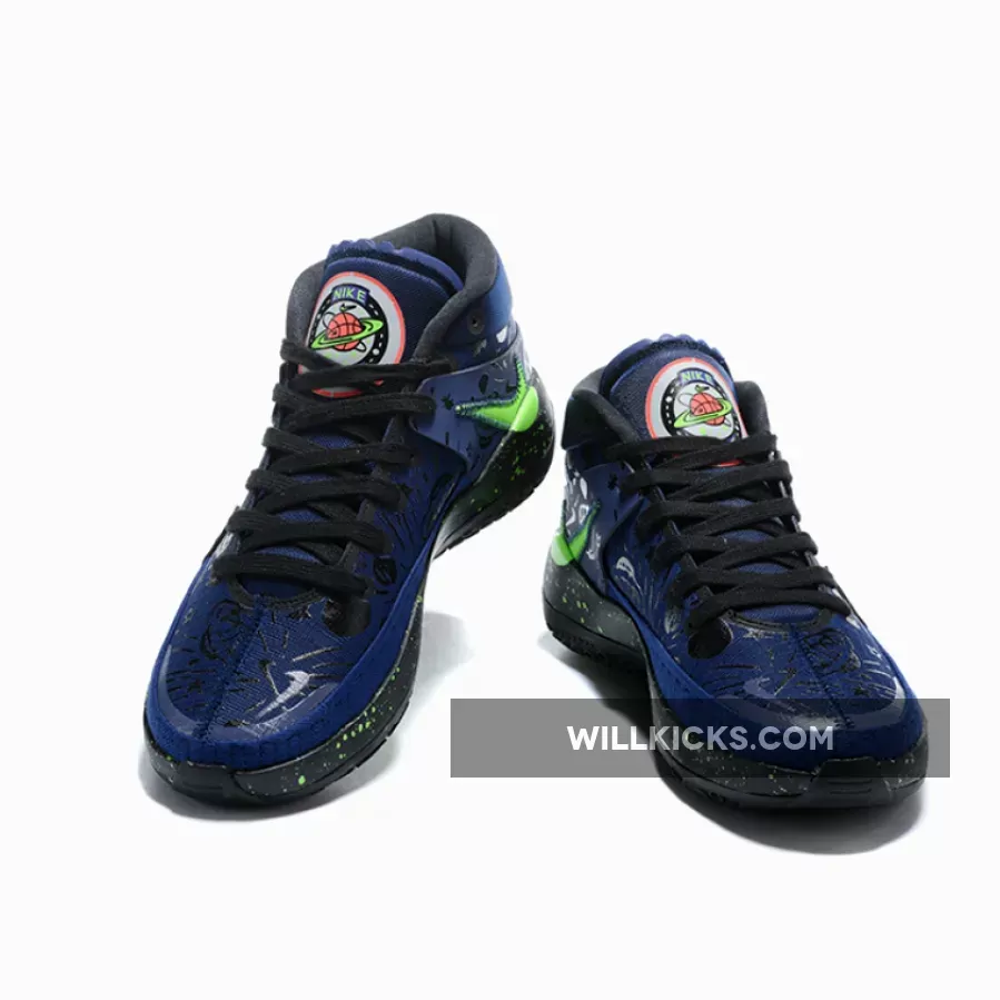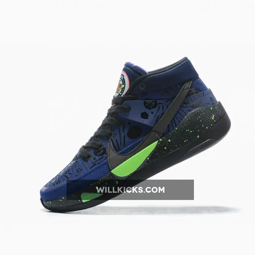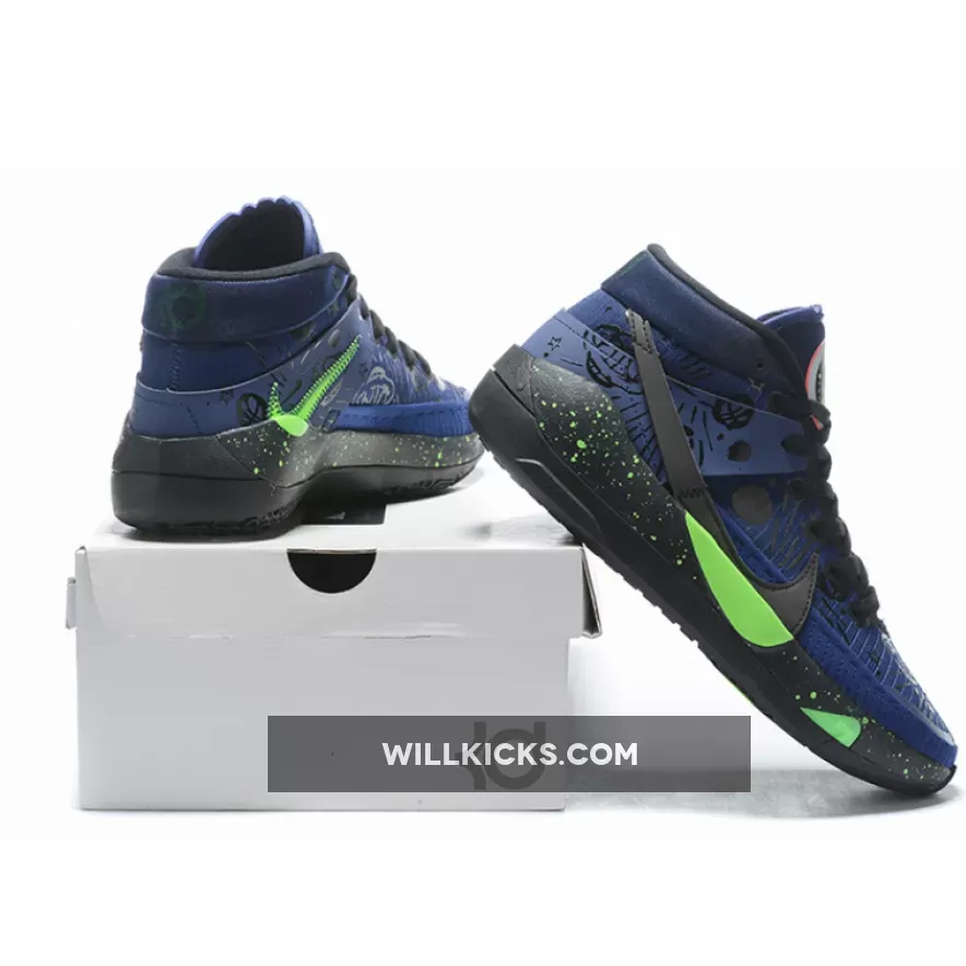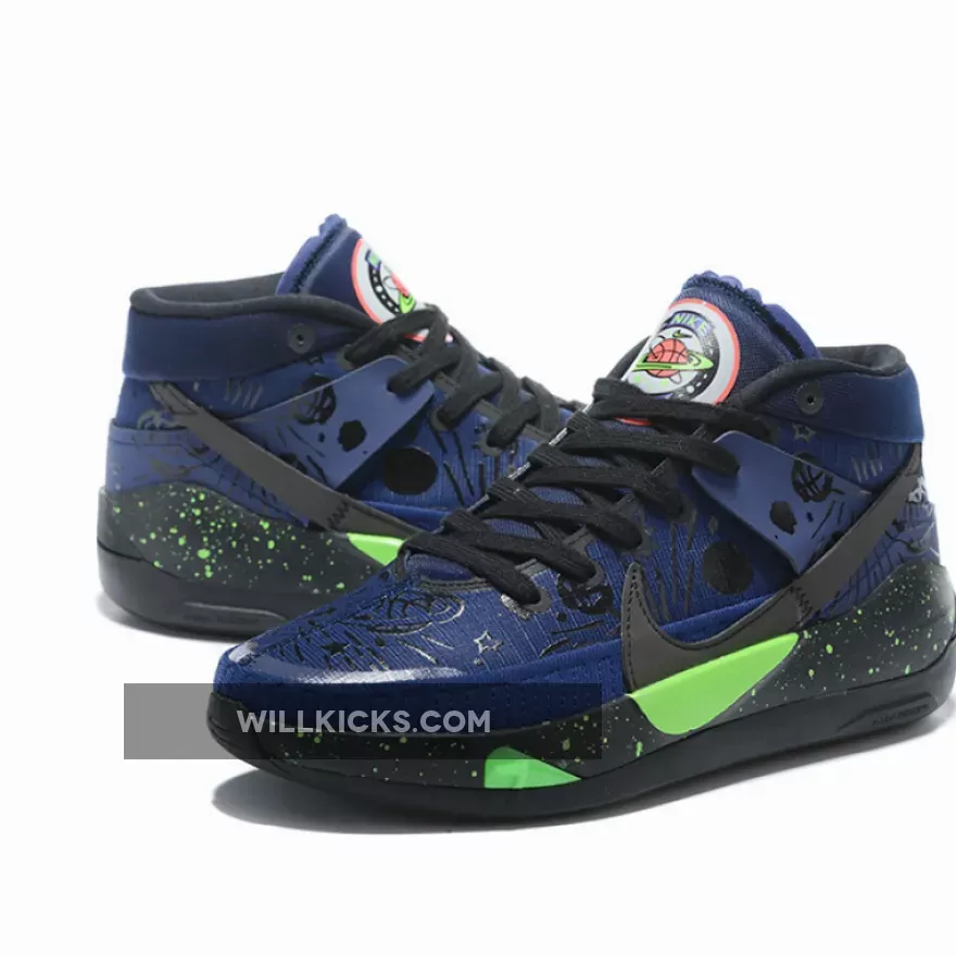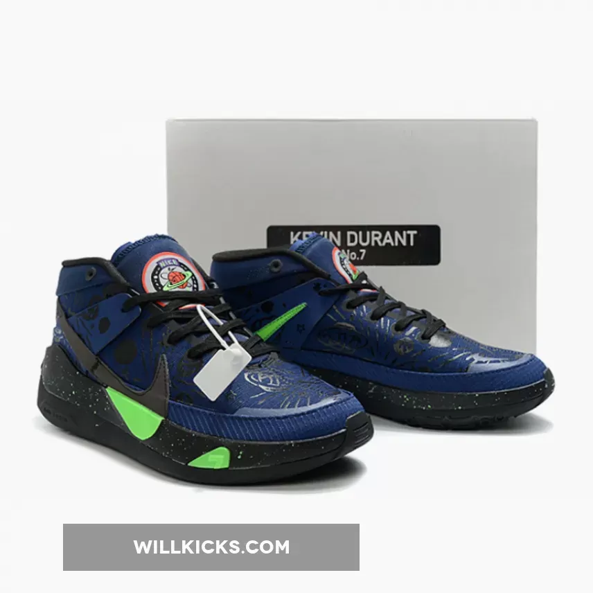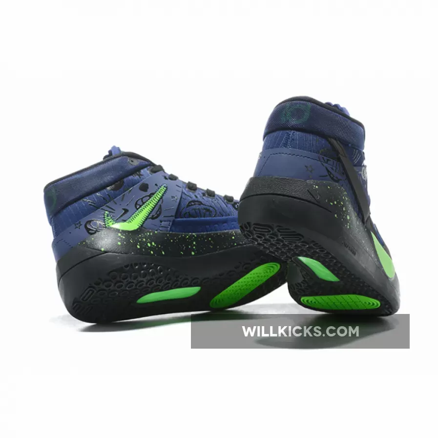 this pair features Blue throughout the upper while using an intergalactic theme. Following we have subtle graphics throughout which furthers the theme between space and basketball. Following we have Neon Green on part of the midsole, insoles and KD branding on the heel. Other details includes ‘Just Do It’ patches on the tongue while Black runs across the Air Zoom midsole with Neon speckled detailing.