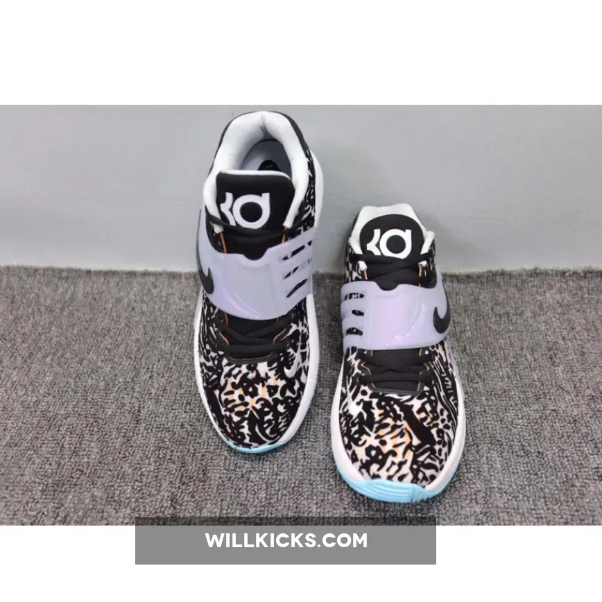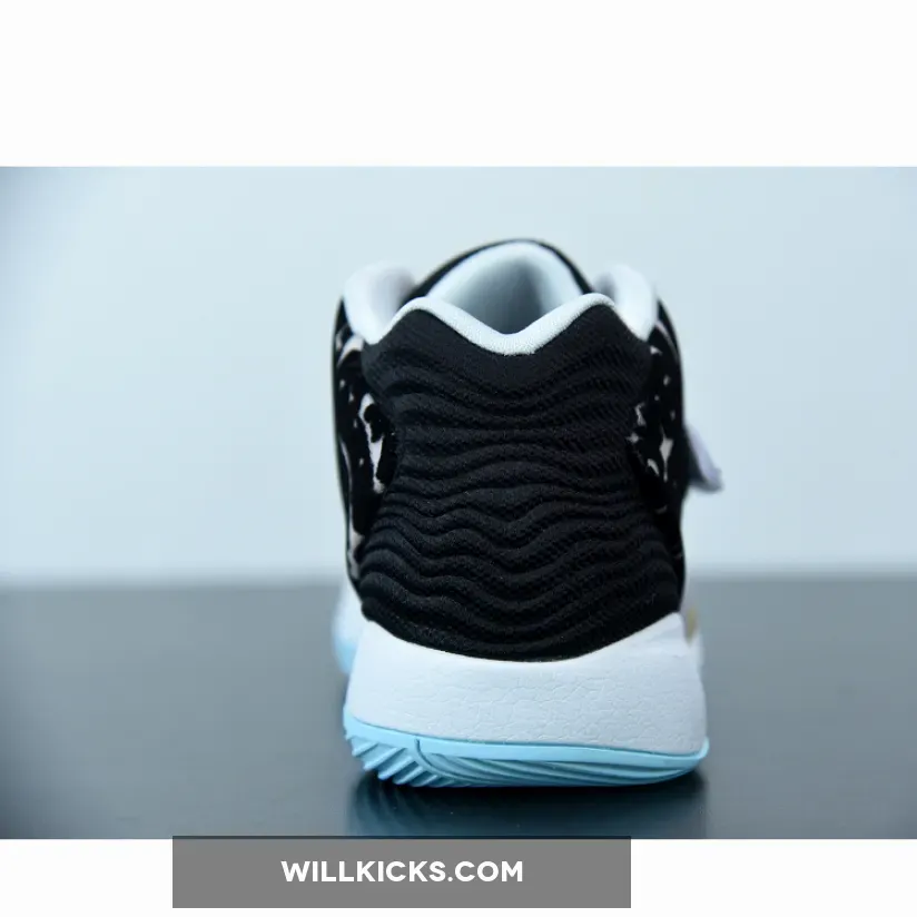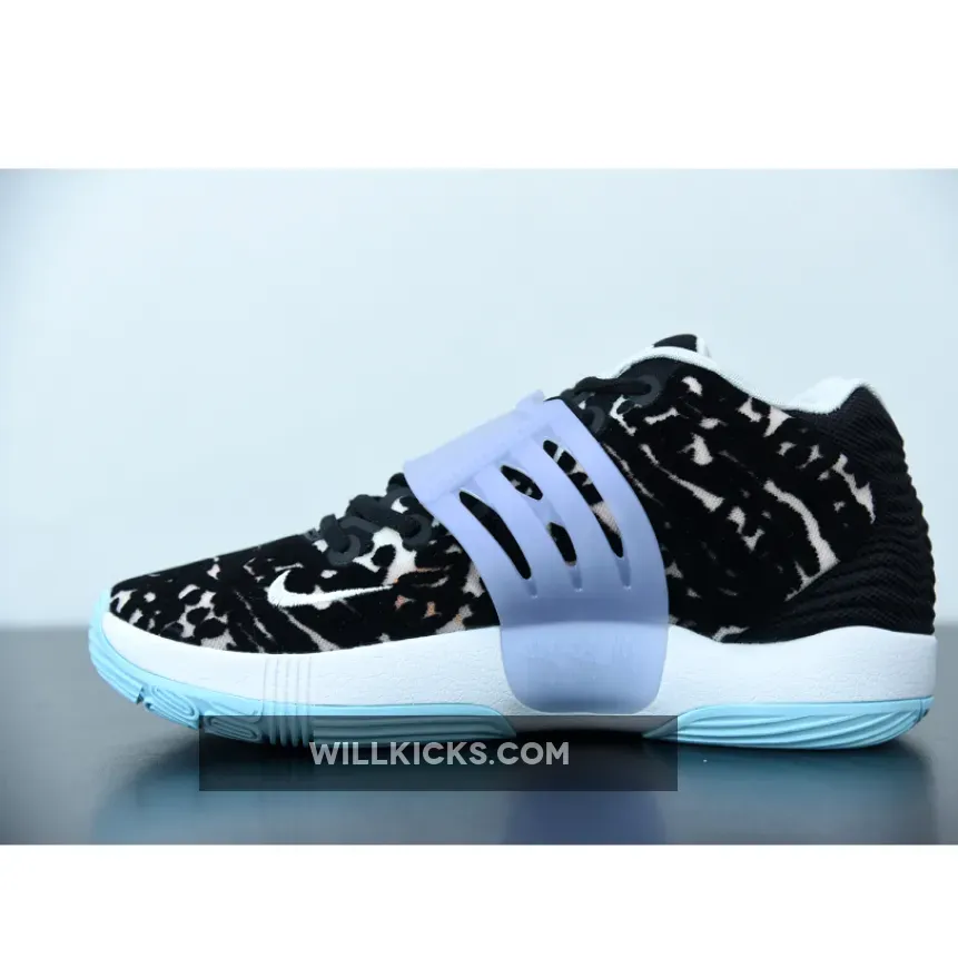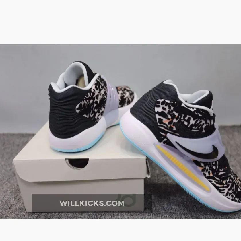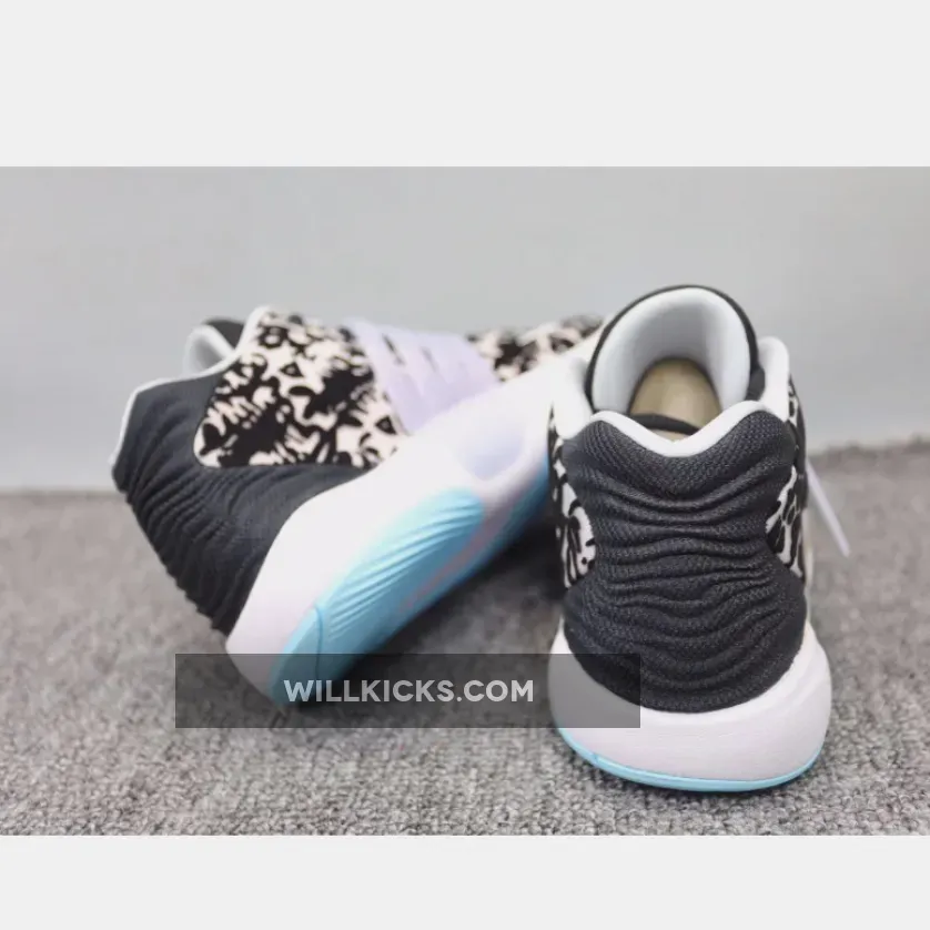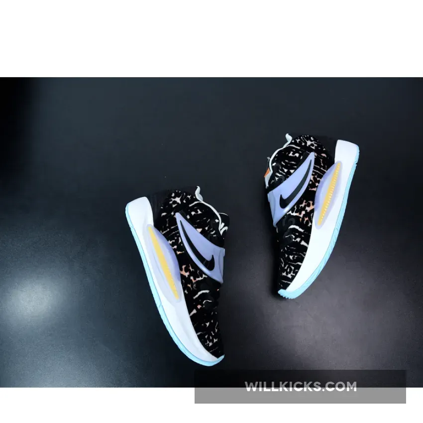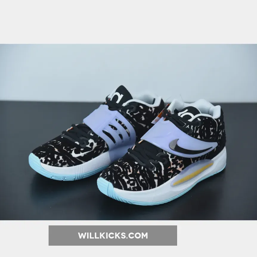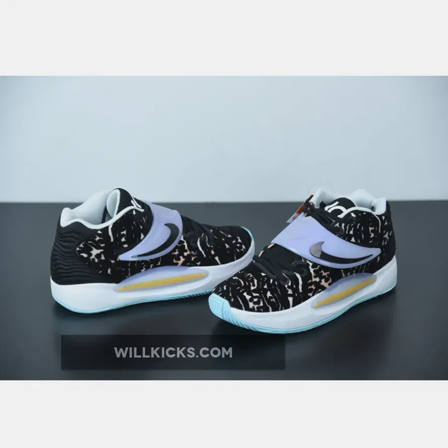 The Nike KD 14 Floral showcases three prominent hues: gentle shade of blue, an organic white tone, and a deep black shade.