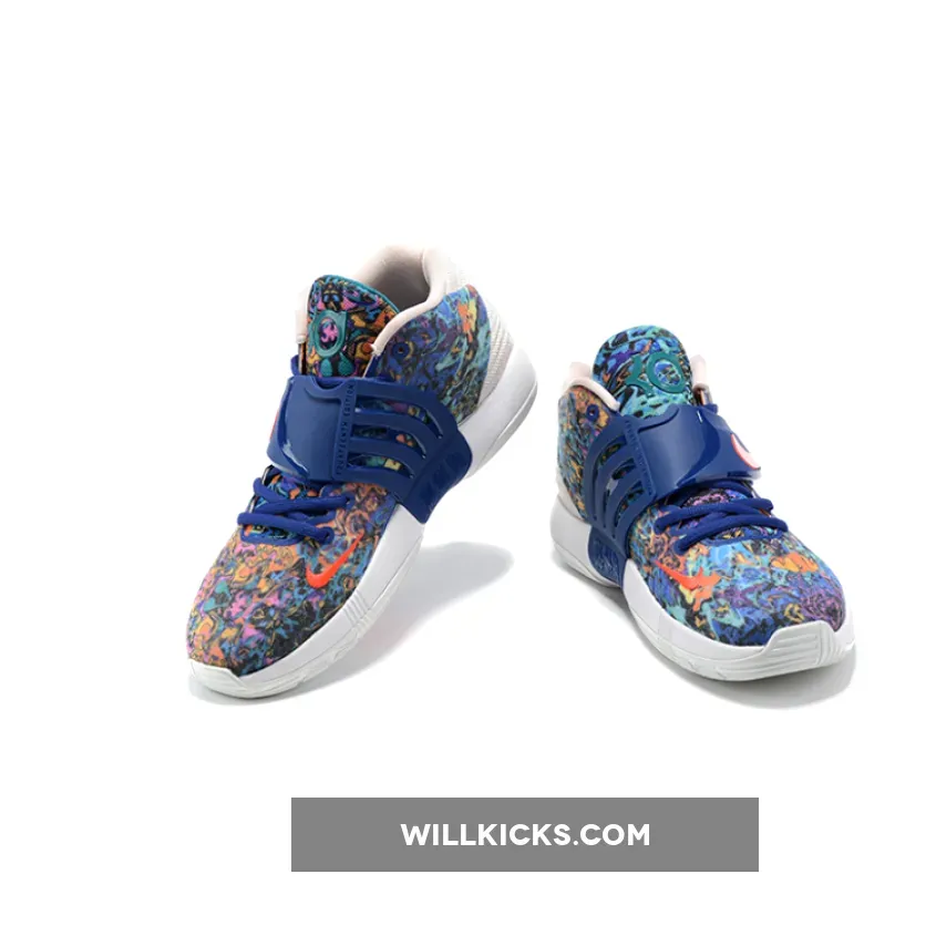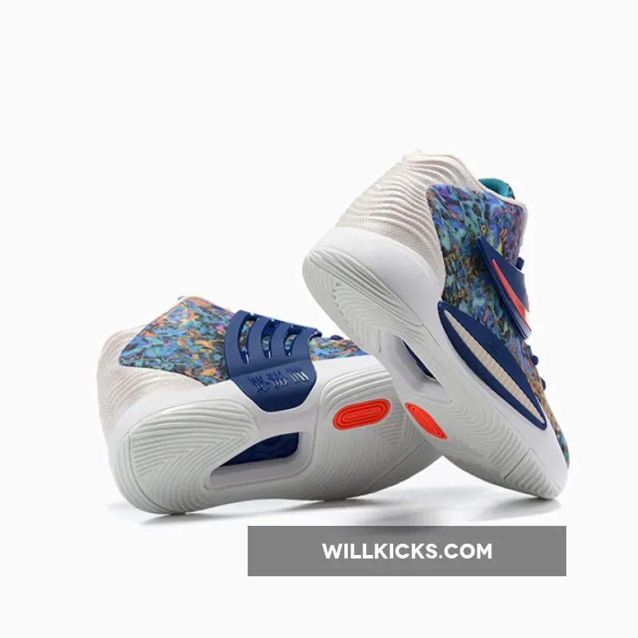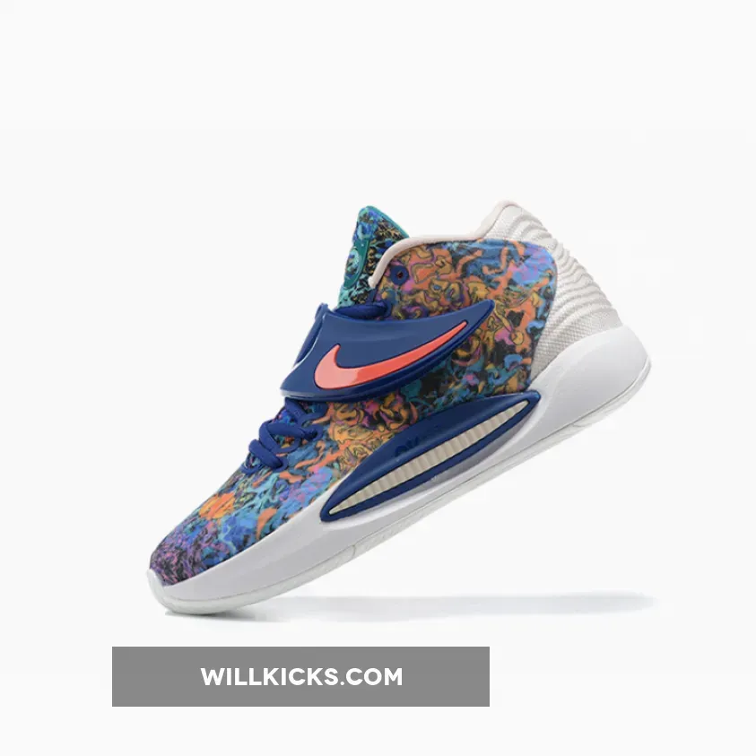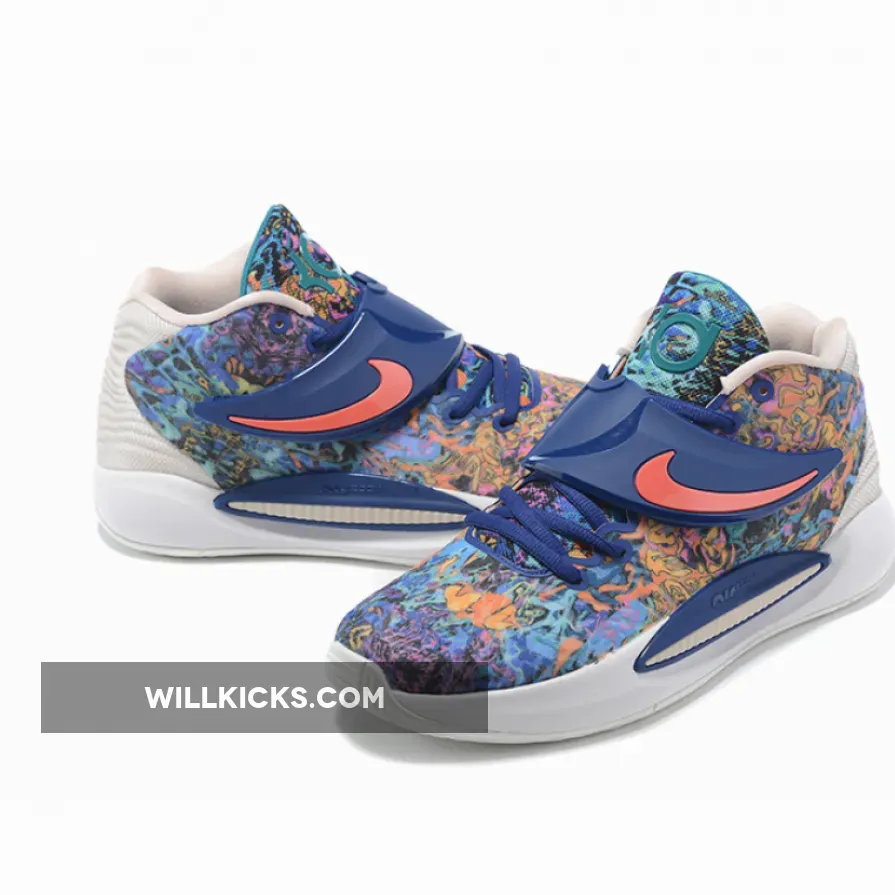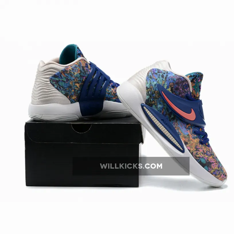 Dressed in a Deep Royal Blue, Pale Coral, and Coconut Milk color scheme. This Nike KD 14 is highlighted with a psychedelic graphic print covering majority of its upper and tongue. Other details includes a Royal Blue cross strap at the midfoot with a Crimson Swoosh to match the embroidered Swoosh on the medial forefoot.