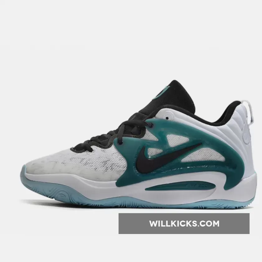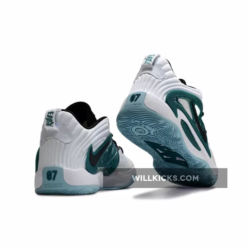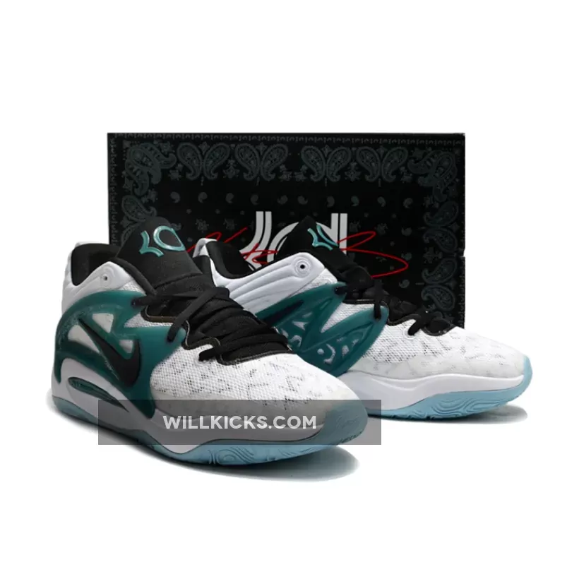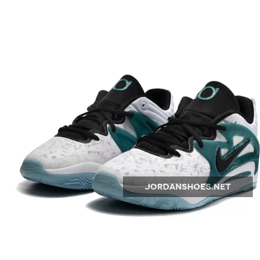 This flavor of the KD 15 features a combination of White and Light Grey throughout the multi layered mesh construction on the upper which is then contrasted by Black and Teal accents on the cage overlay, tongues, laces, inner liner, and the KD and Nike branding throughout.