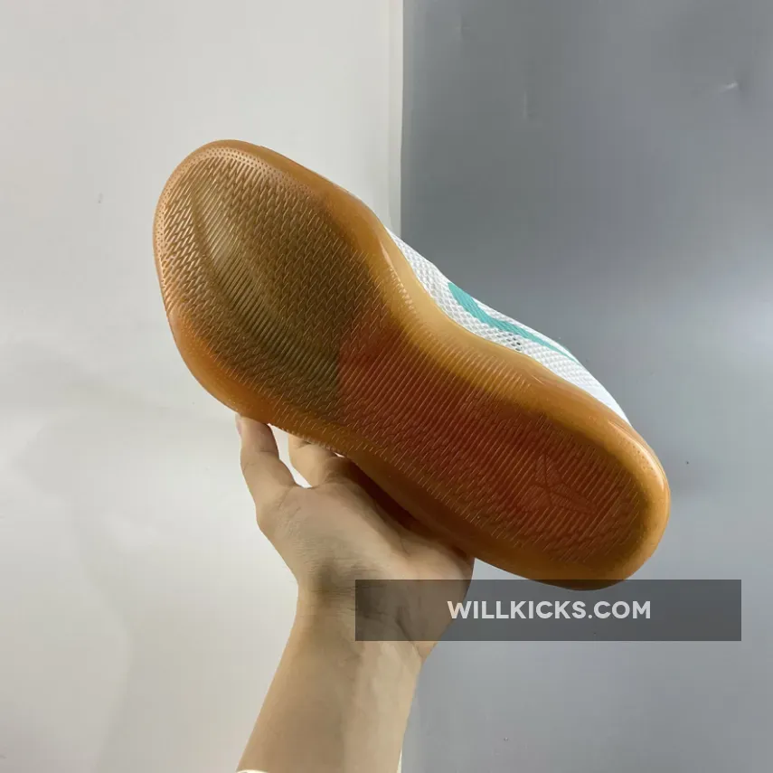 this pair adds teal and crimson accents to a white Engineered Mesh upper. The shoe rides atop a season-appropriate gum rubber outsole.