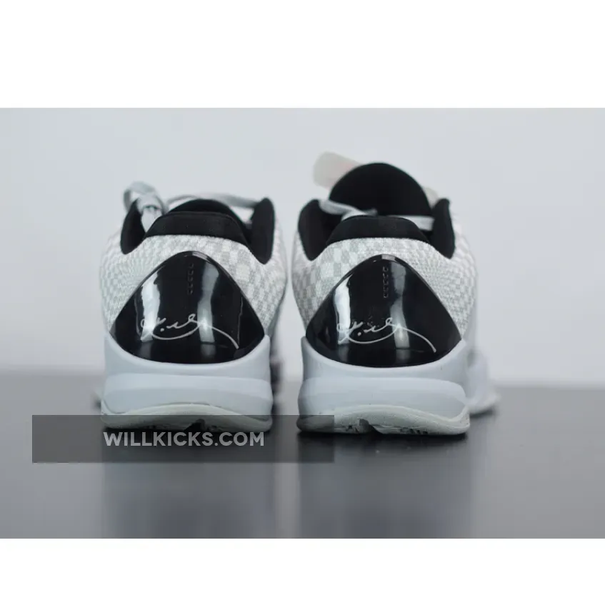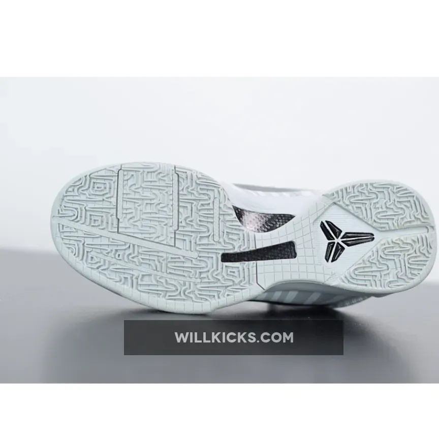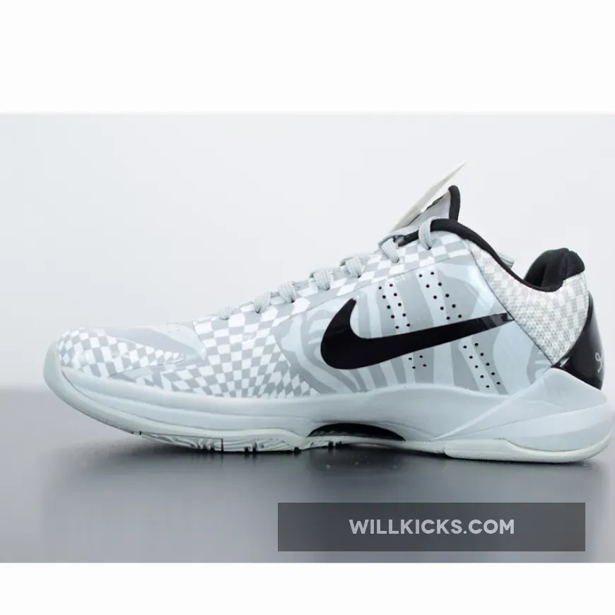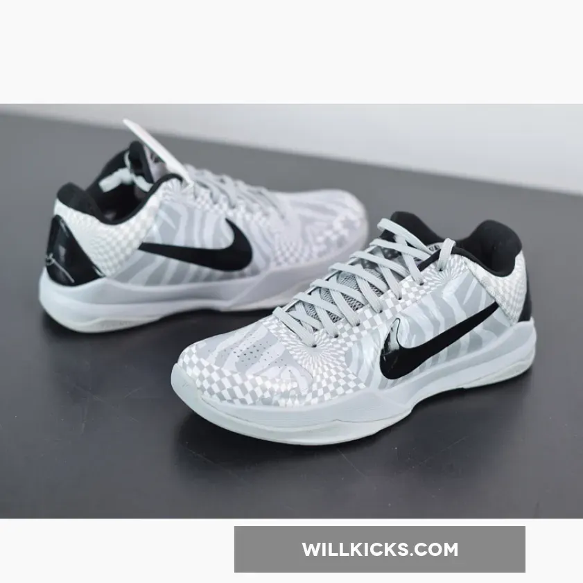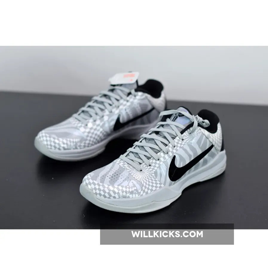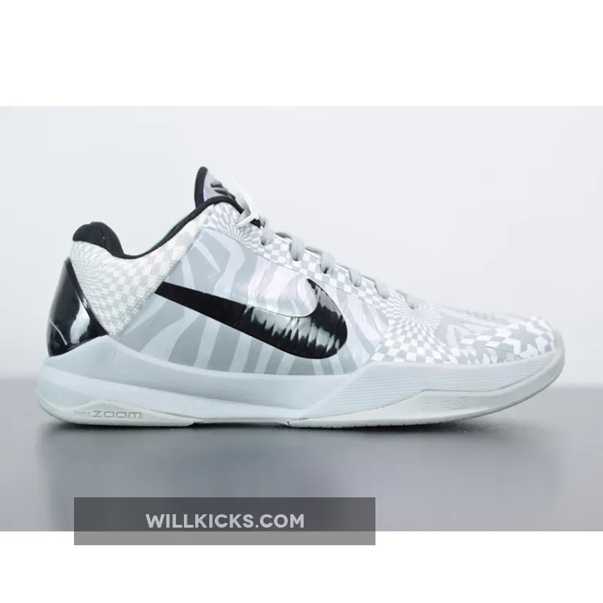 Dressed in a Wolf Grey, White, and Black color scheme. This Nike Kobe 5 sports the Spurs team colors featuring zebra-print on the toe box and quarter panels, while a hypnotic checkerboard print is used on the overlays. Black Swooshes, heel counter and inner lining atop a Grey rubber sole completes the design.