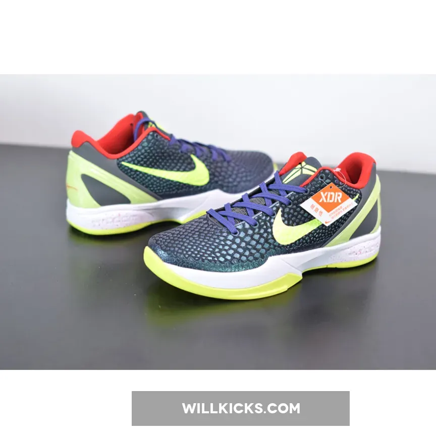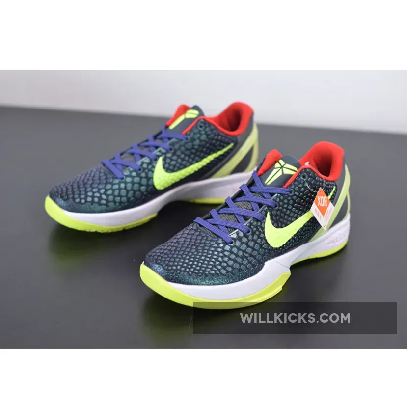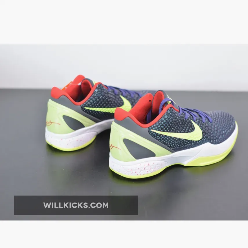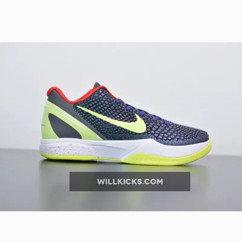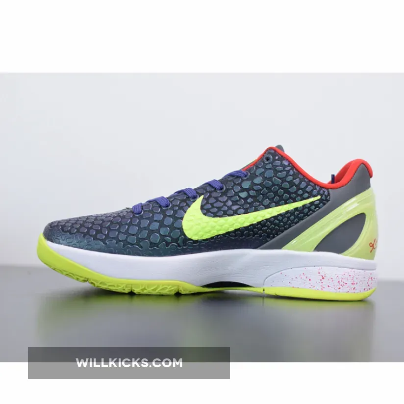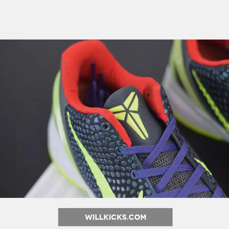 Inspired by DC Comics villain The Joker, the “Chaos” edition of the Nike Kobe 6 Protro features a snakeskin-textured upper with a chameleon finish and Purple laces. Volt Green accents on the Swoosh, Kobe tongue logo and outsole, with Red appearing on the liner and speckling at the White midsole completes the design.