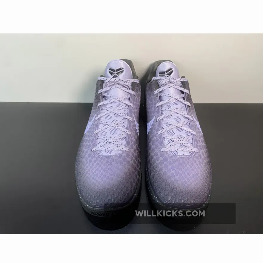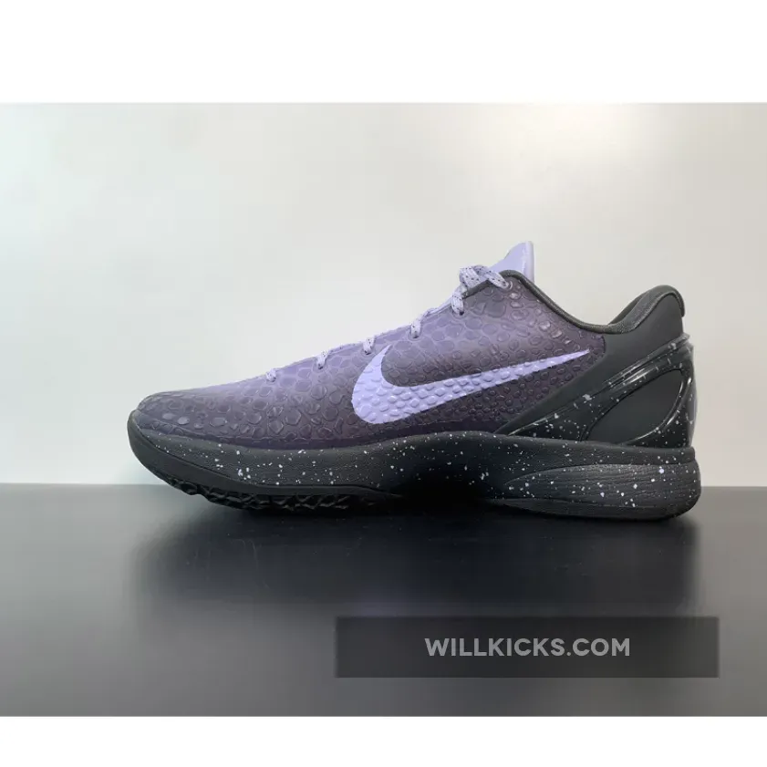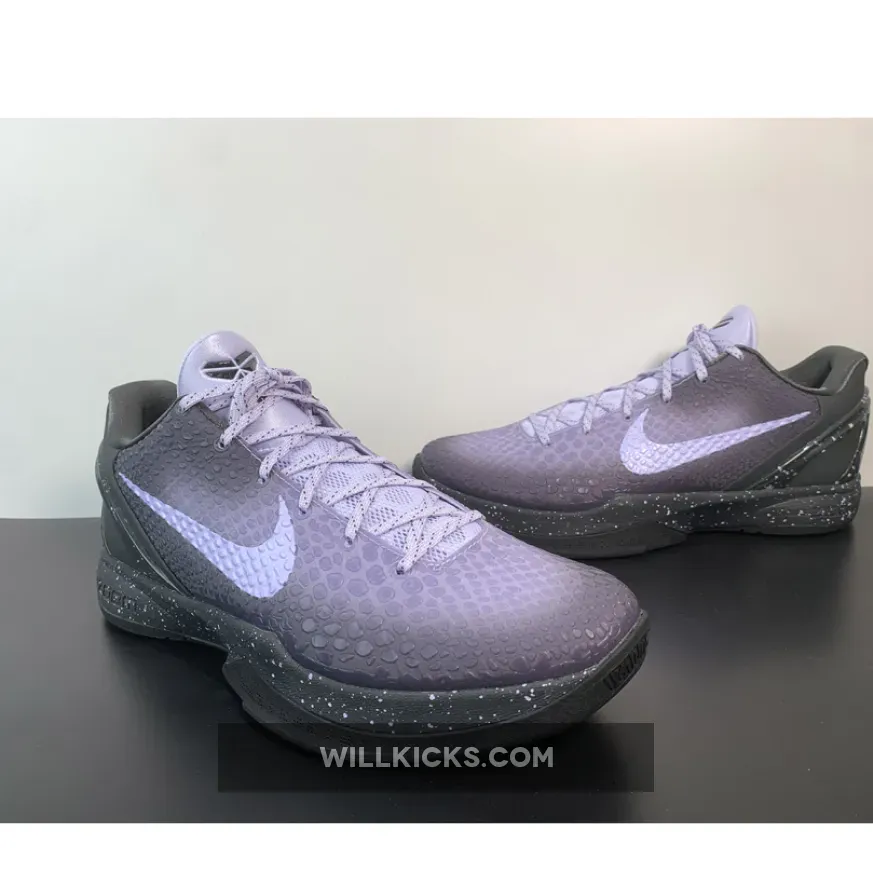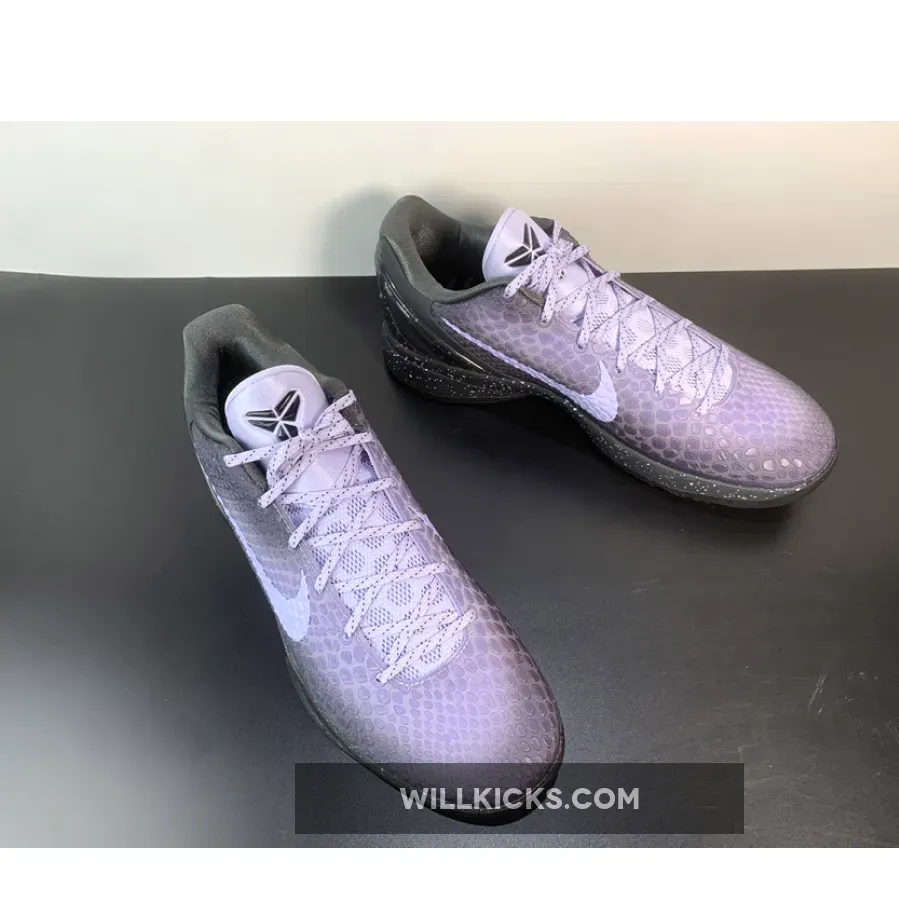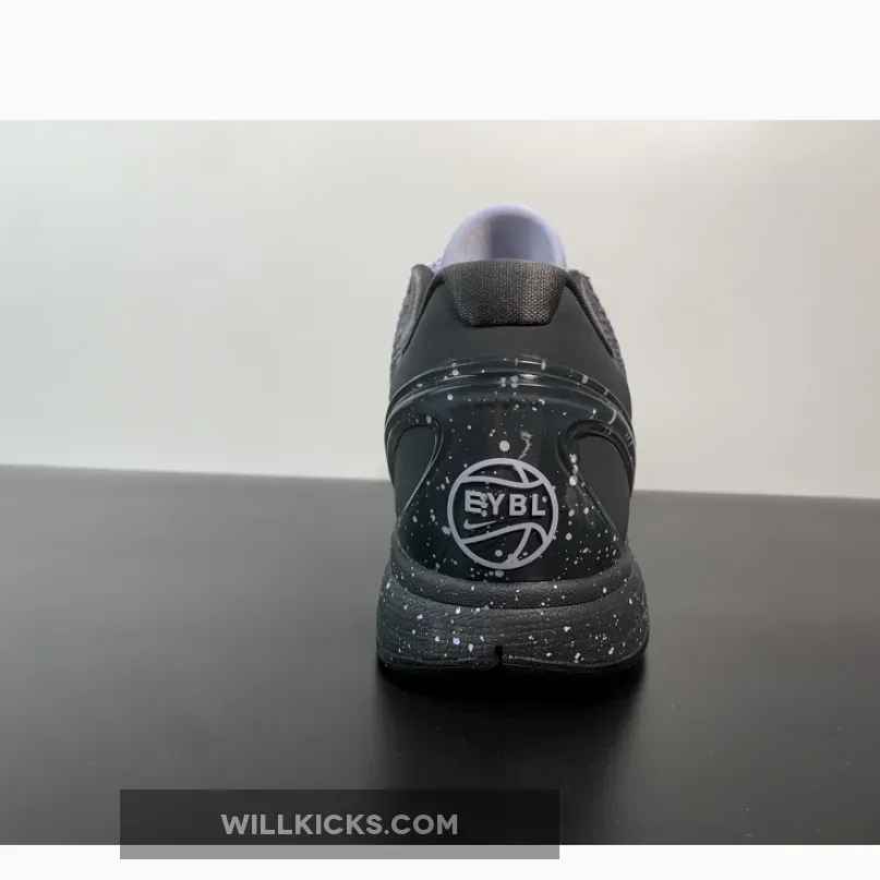 the colorway picks up where the series left off, opting this time for shades of deep purple and black. The latter dyes the entirety of the heel clip and midsole, speckled with splatters of grey all throughout. Above, the Swoosh opts for a white neutral, its scales lightly tinted with the purple that air brushes behind in varying levels of intensity. Kobe’s logo, then, outfits the tongue, placed opposite to the EYBL insignia that dresses the heel in what looks to be reflective paint.