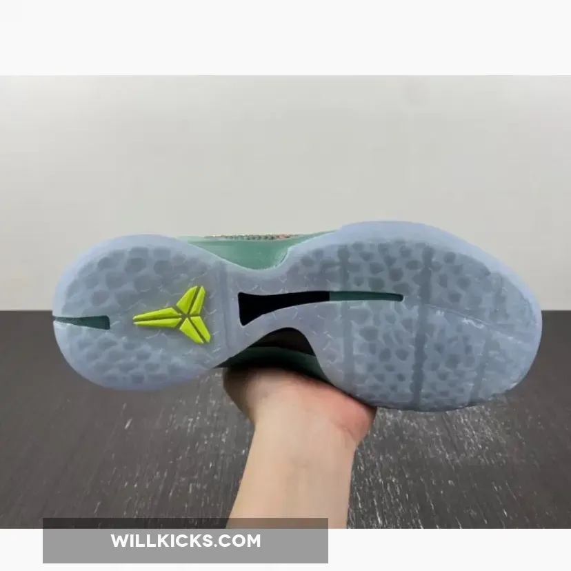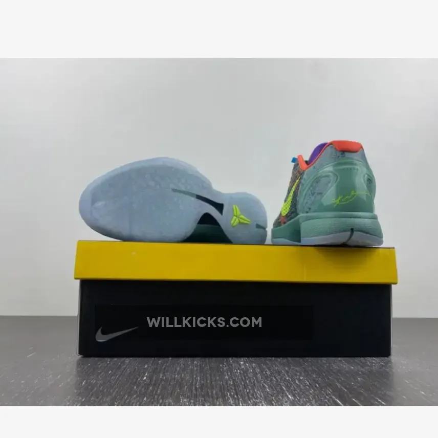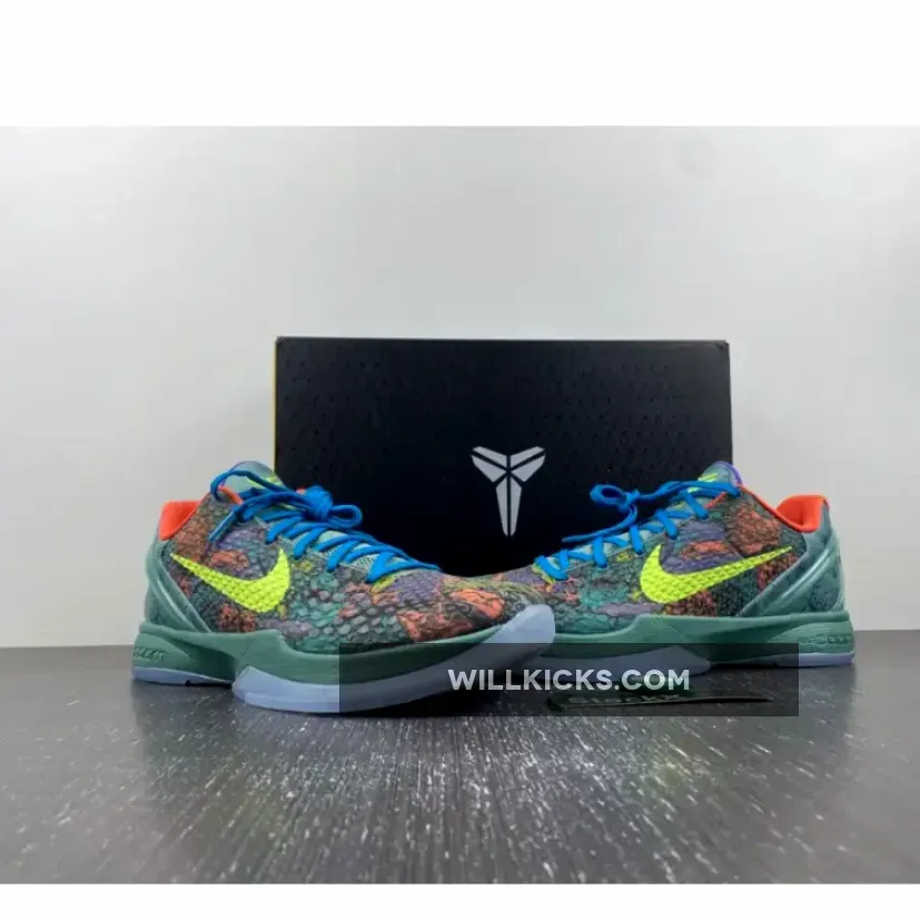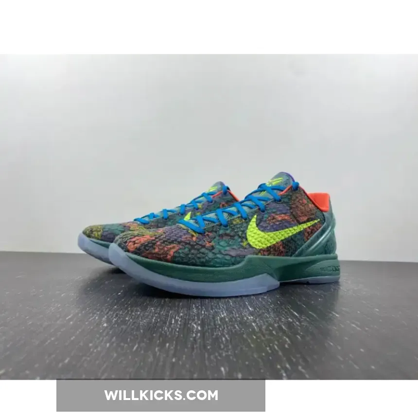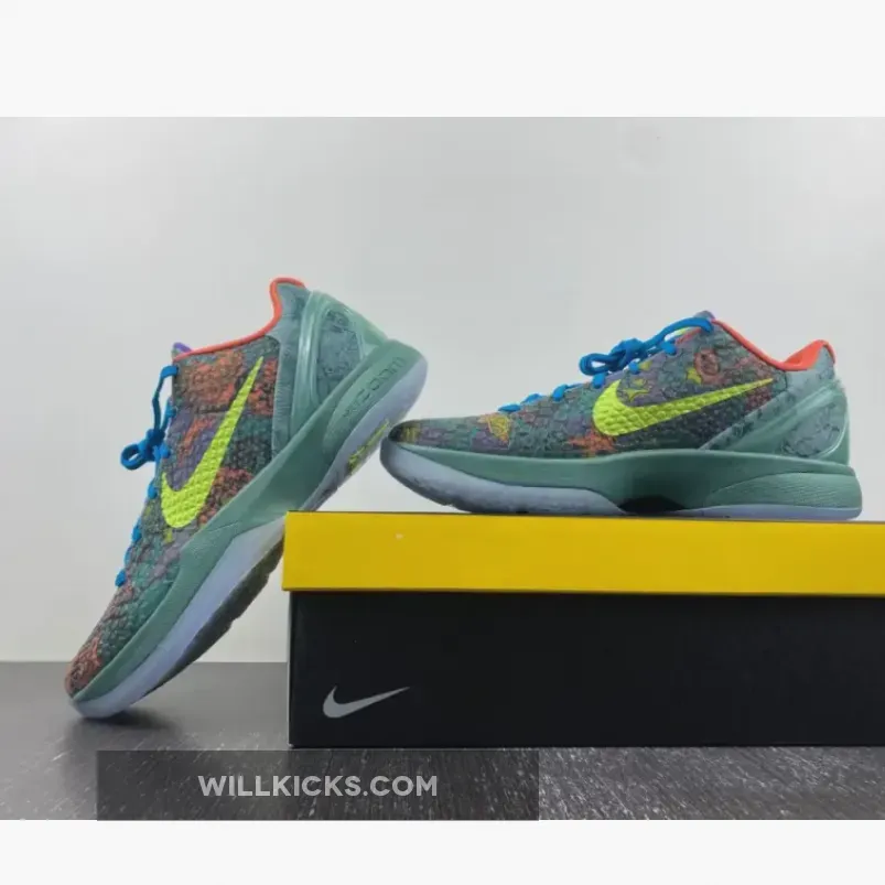 The Kobe 6’s signature snake-like upper is coated in a multicolor look with graphics and feature the ocean, fish, octopus, and sharks. Same animal, different beast and split by bold volt branded hits. Though its look is nearly identical to the 2012 release, it features updated Protro construction with an upgraded last, softer midsole foam, a larger Zoom Air cushioning unit in the forefoot and an outsole pattern with an increased surface area for better grip.