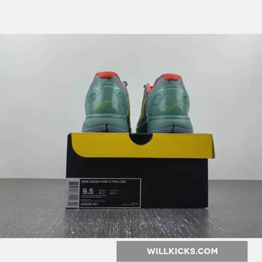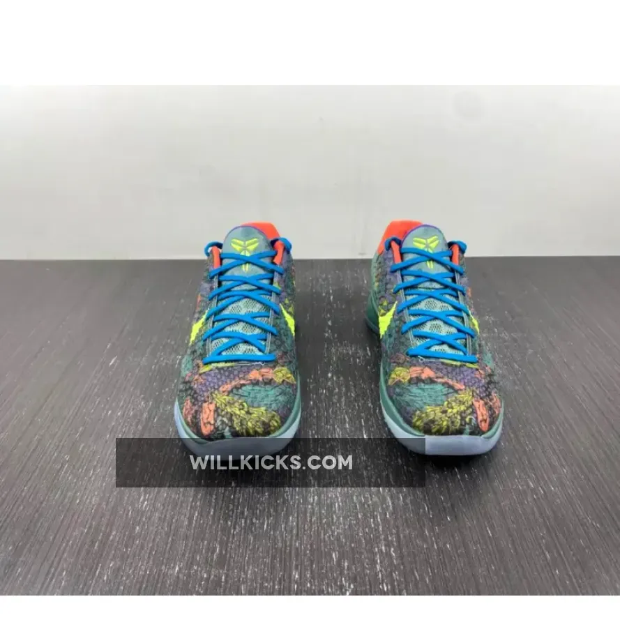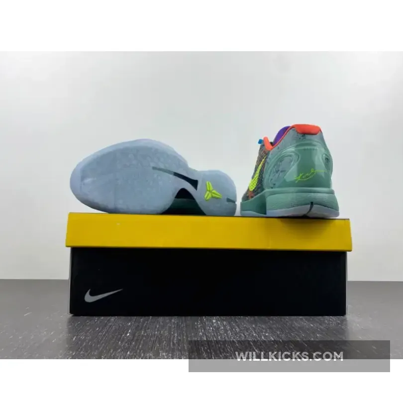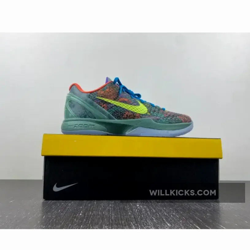 The Kobe 6’s signature snake-like upper is coated in a multicolor look with graphics and feature the ocean, fish, octopus, and sharks. Same animal, different beast and split by bold volt branded hits. Though its look is nearly identical to the 2012 release, it features updated Protro construction with an upgraded last, softer midsole foam, a larger Zoom Air cushioning unit in the forefoot and an outsole pattern with an increased surface area for better grip.
