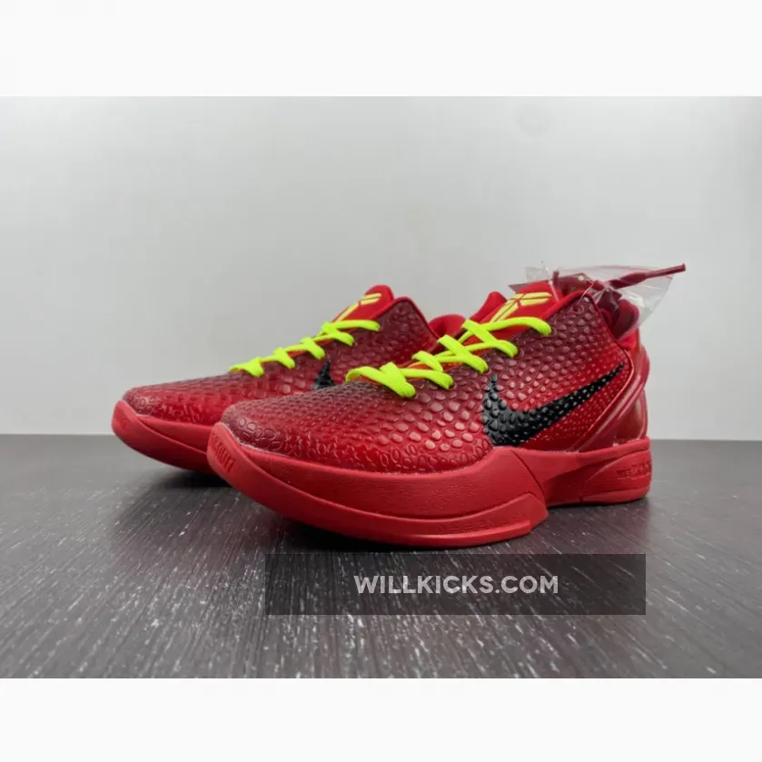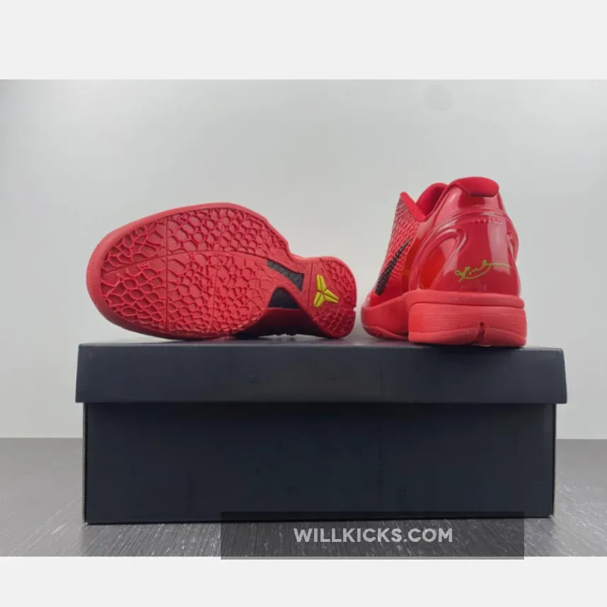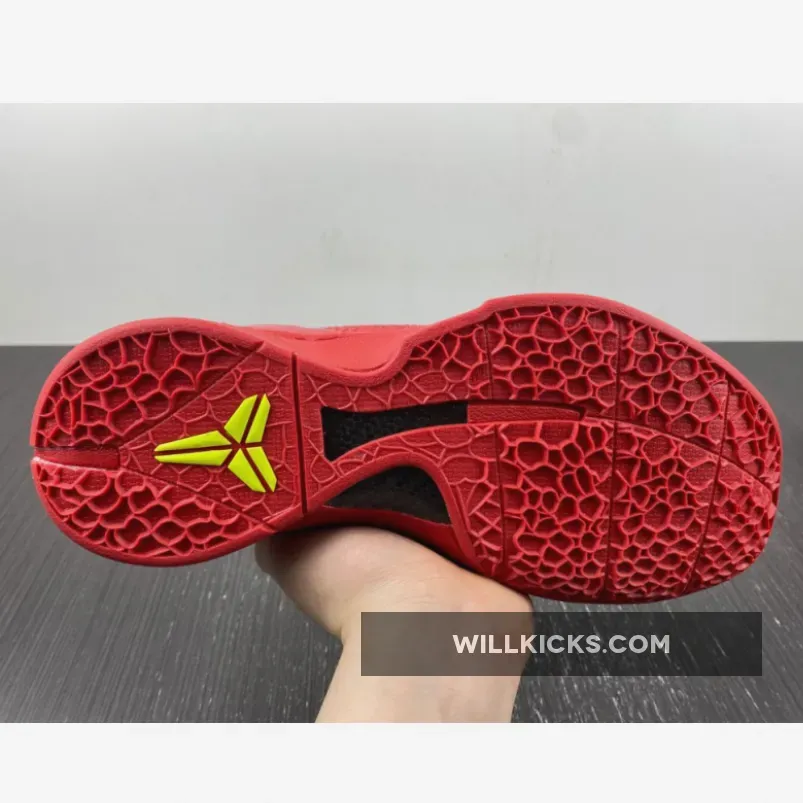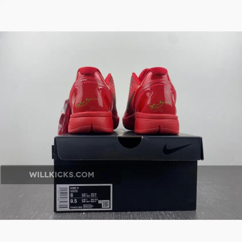 It features a Crimson snakeskin textured upper with Black Swooshes. The laces stand out in “Electric Green,” inspired by the Grinch’s shaggy fur. The Kobe logo on the tongue follows suit, while the midsole and heel counter blend in with “Bright Crimson.” A Bright Crimson rubber sole completes the design.