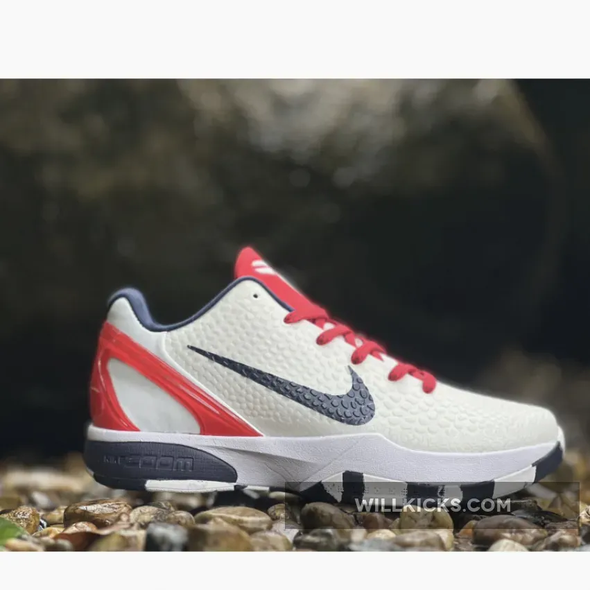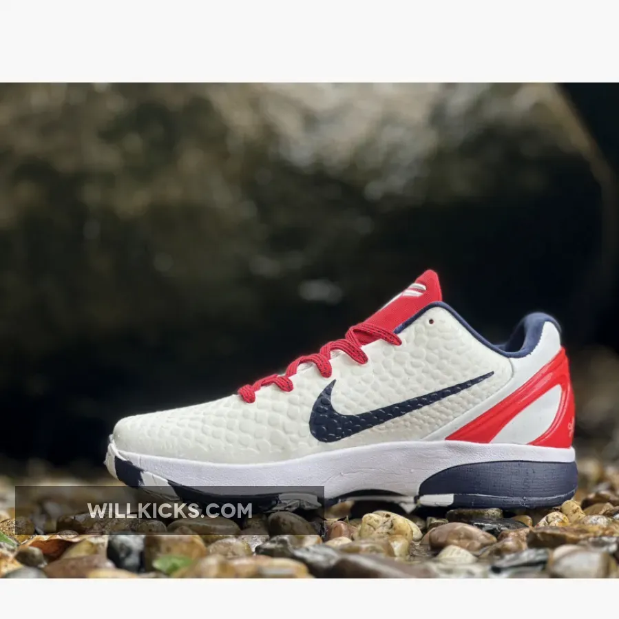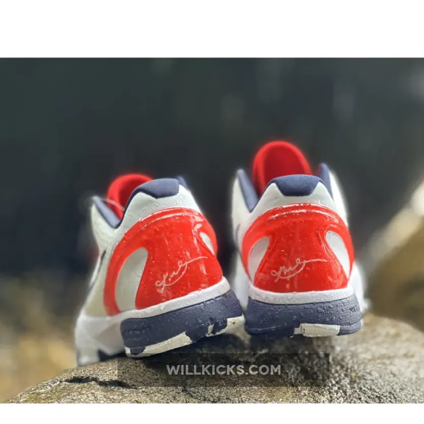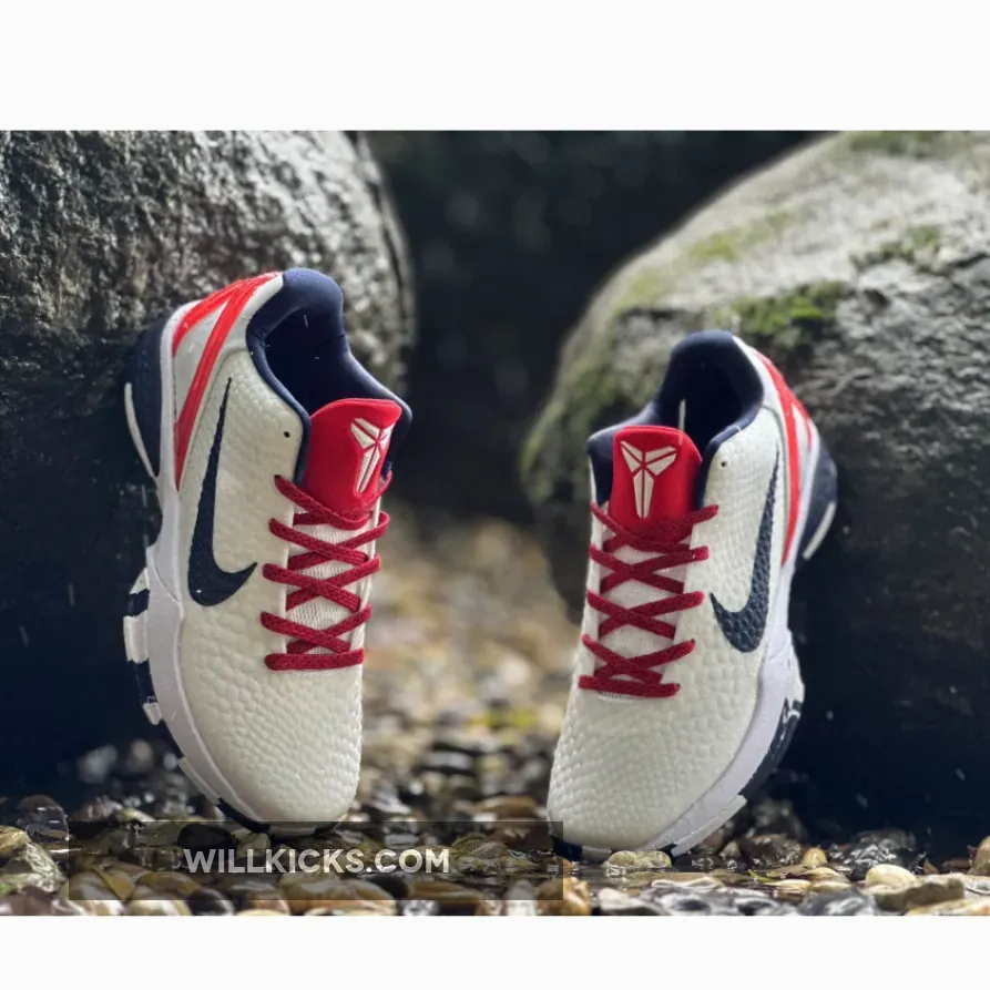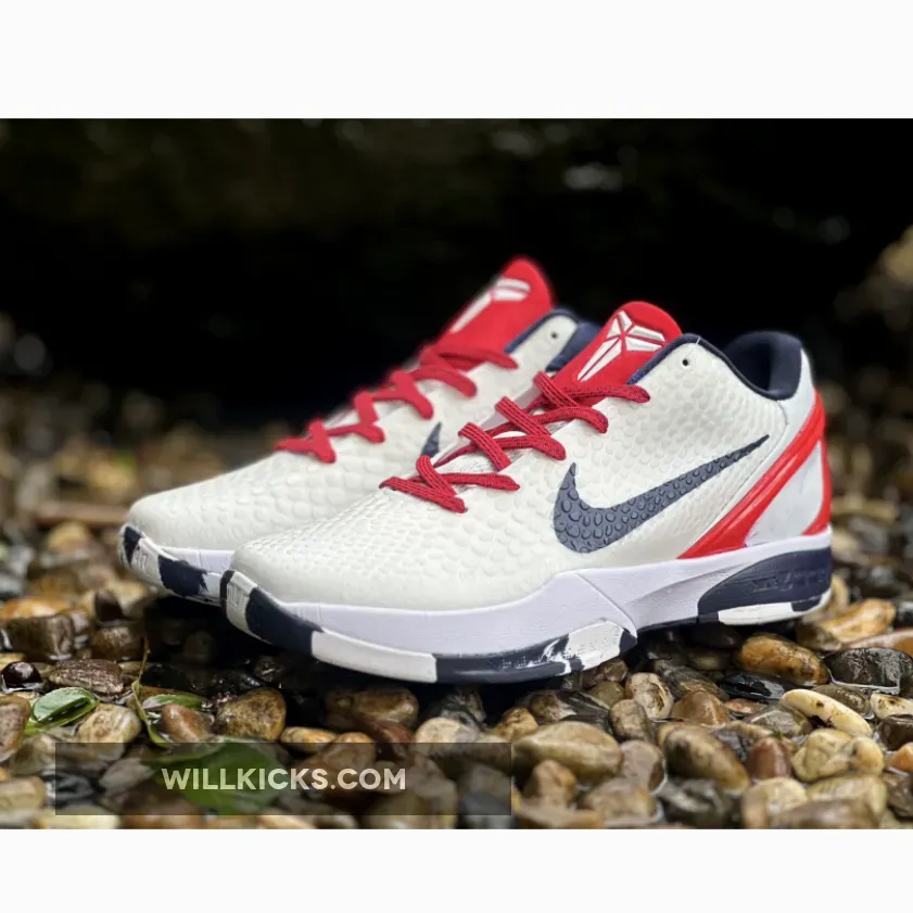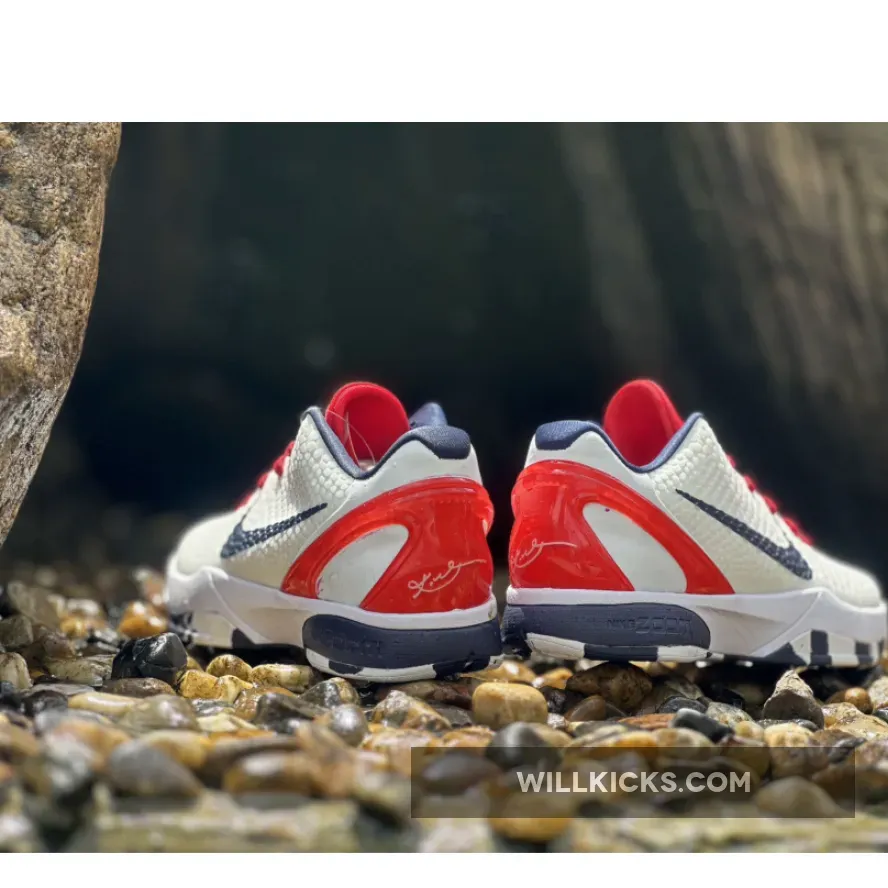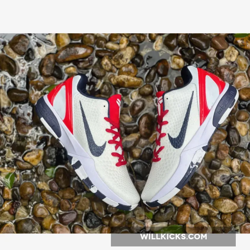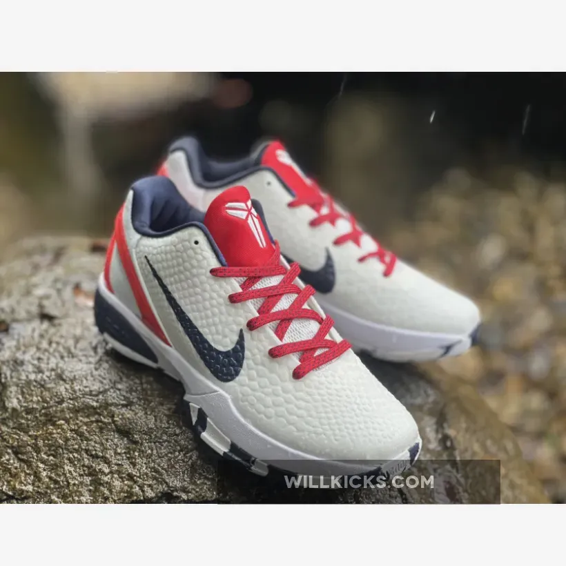 The first pair’s upper is predominantly decked in White with Navy Blue accents on the Swooshes, the sockliner, with both working in tandem over the sole unit. The second contrasts this with a Navy Blue base layer with White accents on the Kobe logo, Swooshes, midsole, and heel overlay. Both pairs are imbued with with Red accents to complete the trifecta of colors that form the Stars and Stripes. They’re finished off with a polished White midsole and an eye-catching Navy and Red marbleized outsole.