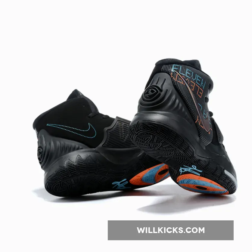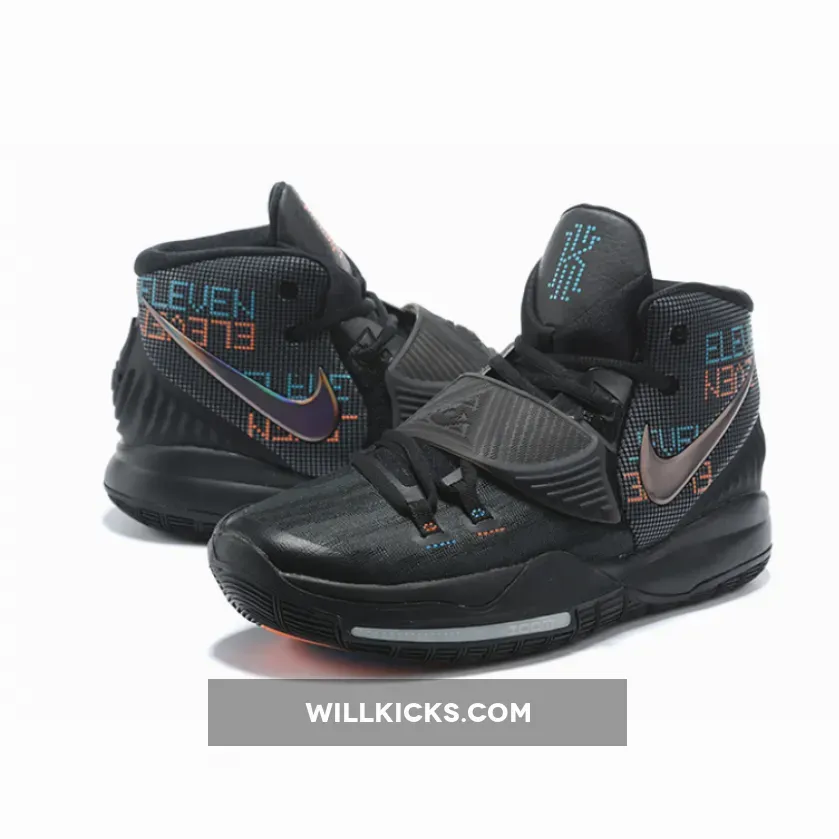 Since most of the shoe is cloaked in matte black, it’s the colored accents that purloin most of the attention here. The rear panels which have been materialized with dotted textures feature digital-esque text hits that spell out “Eleven” as a nod to the Brooklyn Nets point guard’s jersey number. In likeness to the forefoot stitching and tongue logos, each alternates between vibrant orange-red and blue tones. Additionally, the lateral/medial Swooshes mismatch in appearances as the former is given a metallic and iridescent finish, while latter deviates with a dotted silhouette.