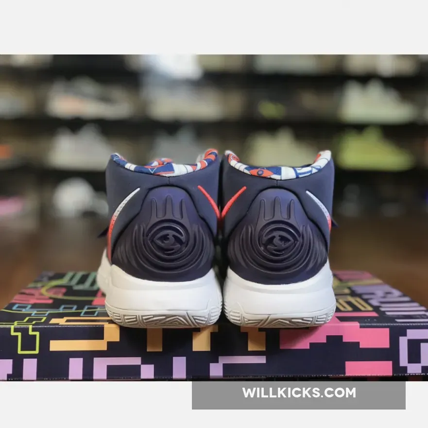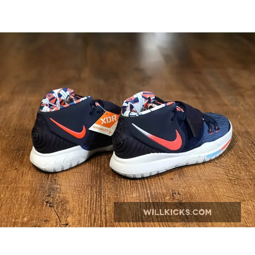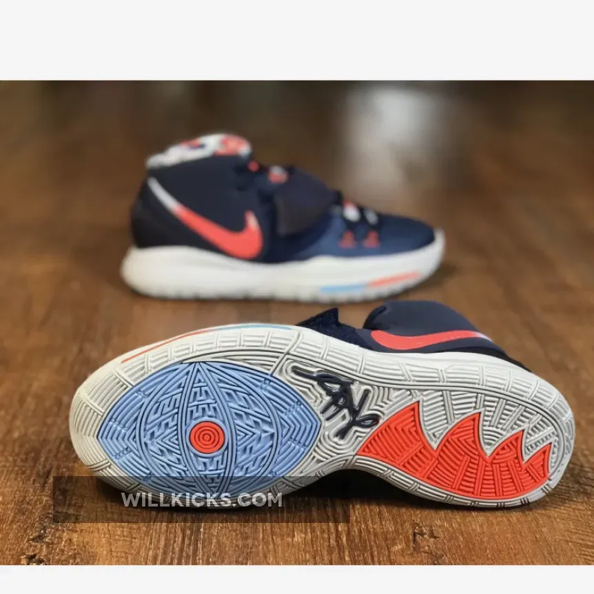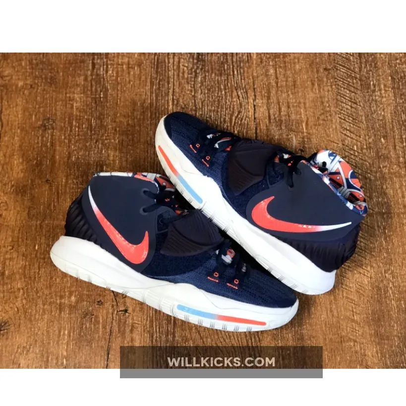 The Nike Kyrie 6 ‘USA’ showcases a patriotic color scheme, highlighted by a Midnight Navy finish on the mixed-material upper. The sneaker’s lining is covered in an intricate multi-hued print that incorporates Kyrie Irving’s all-seeing eye logo, which also appears on the adjustable midfoot strap and molded heel piece. The mid-top rides on a lightweight foam midsole, fitted with a large Nike Air Zoom Turbo unit in the forefoot for responsive cushioning.