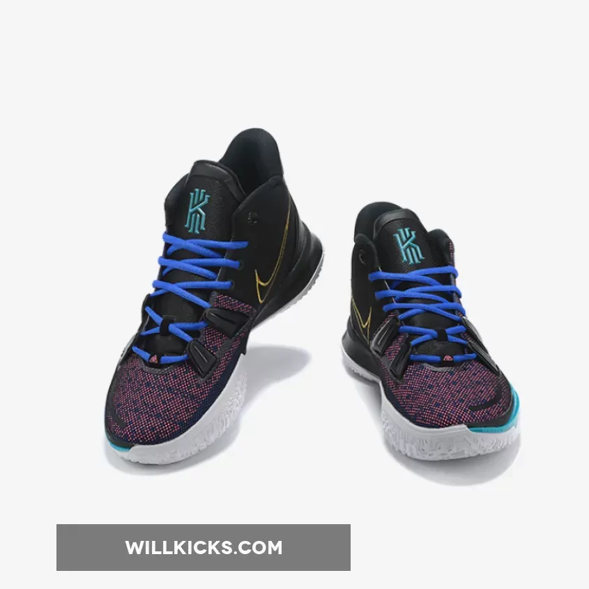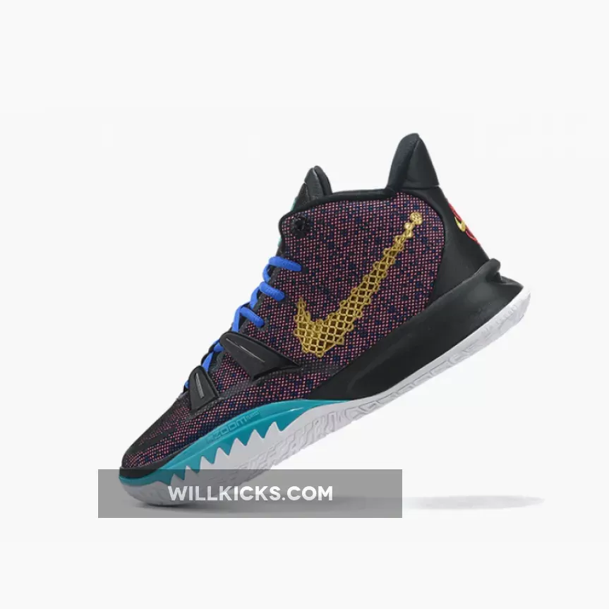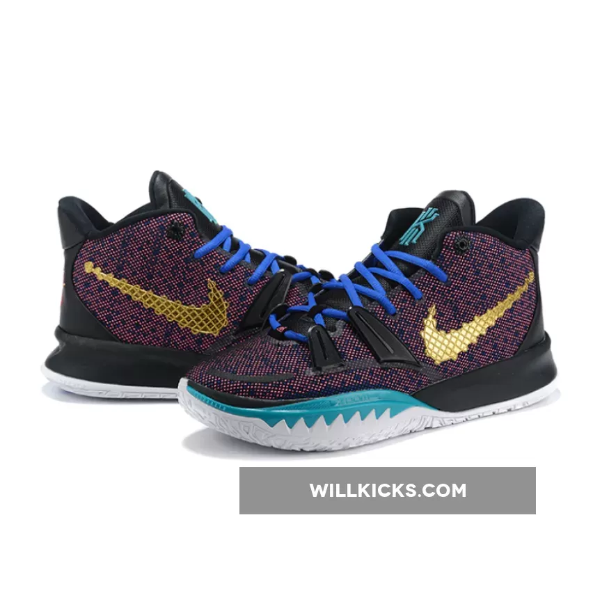 This offering of the Nike Kyrie 7 features a Pink printed upper paired with Blue laces and Teal tongue branding and lateral forefoot overlays on the White midsole. Highlighting the shoe is a Gold sculpted ornate-like Swoosh logo on the lateral with embroidery branding appearing on the heels.