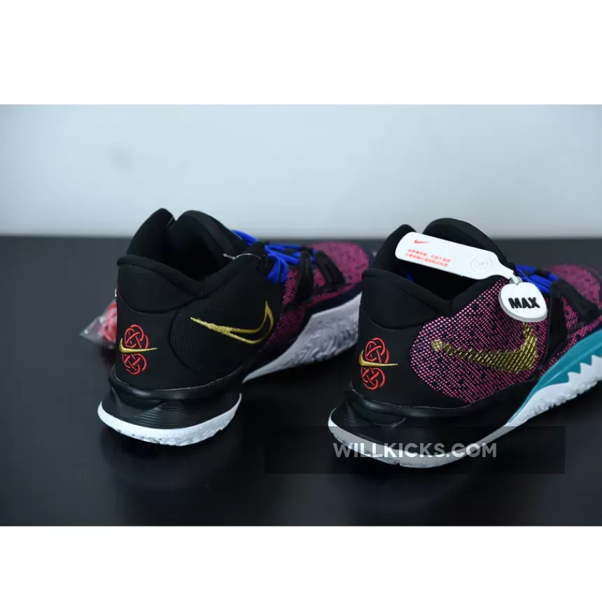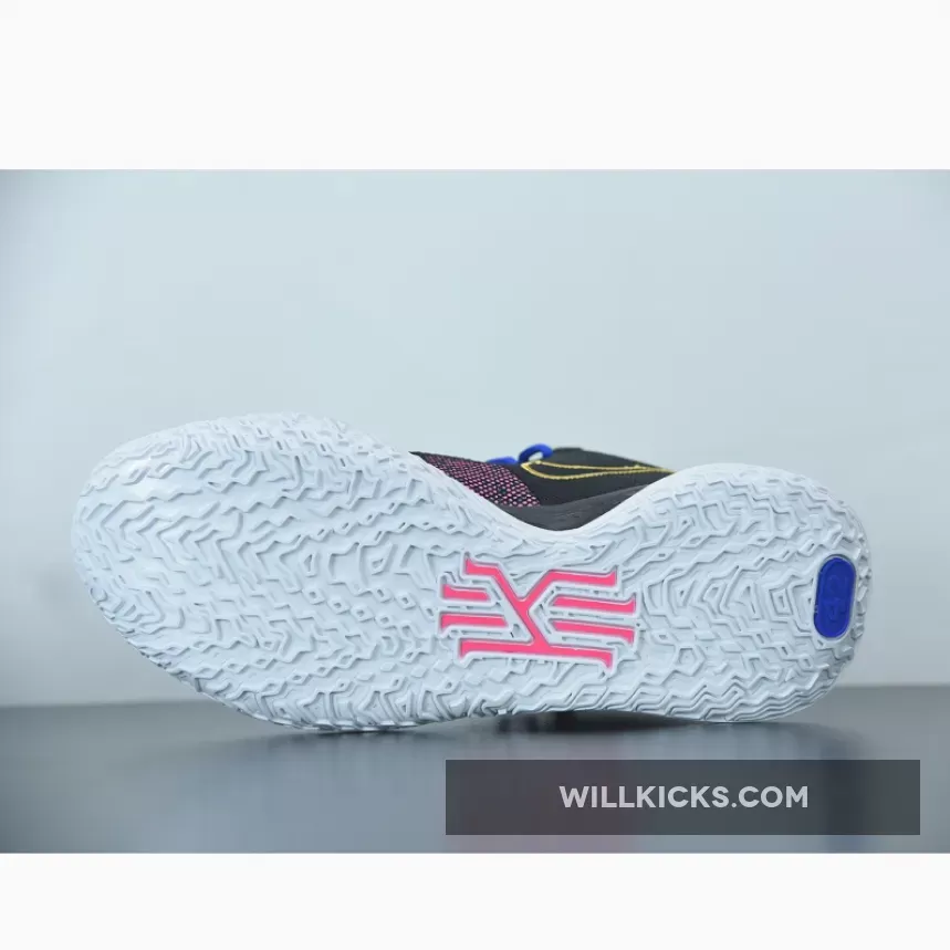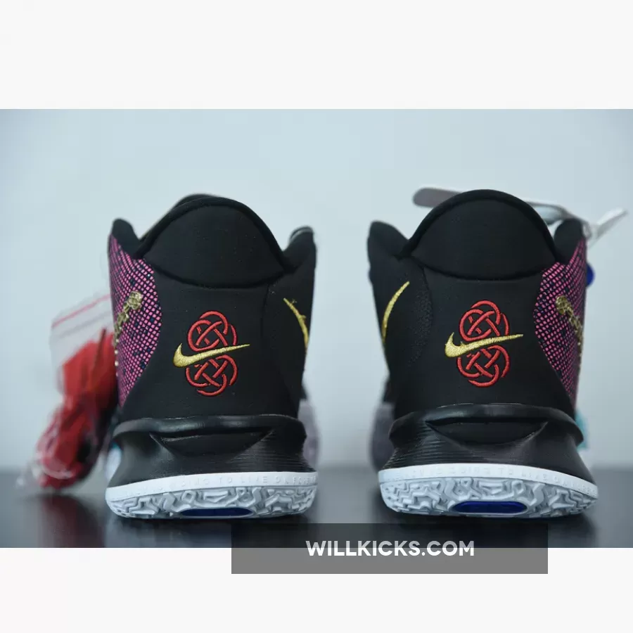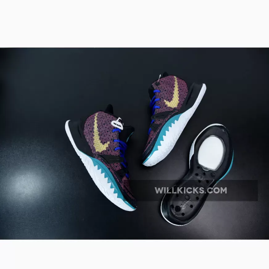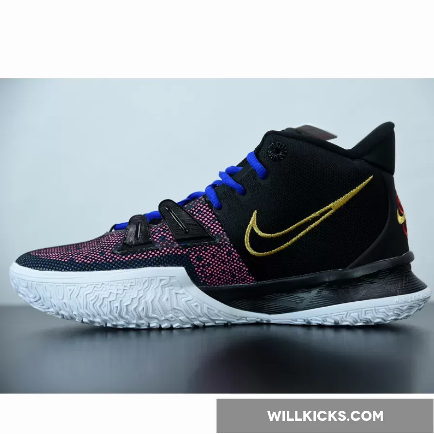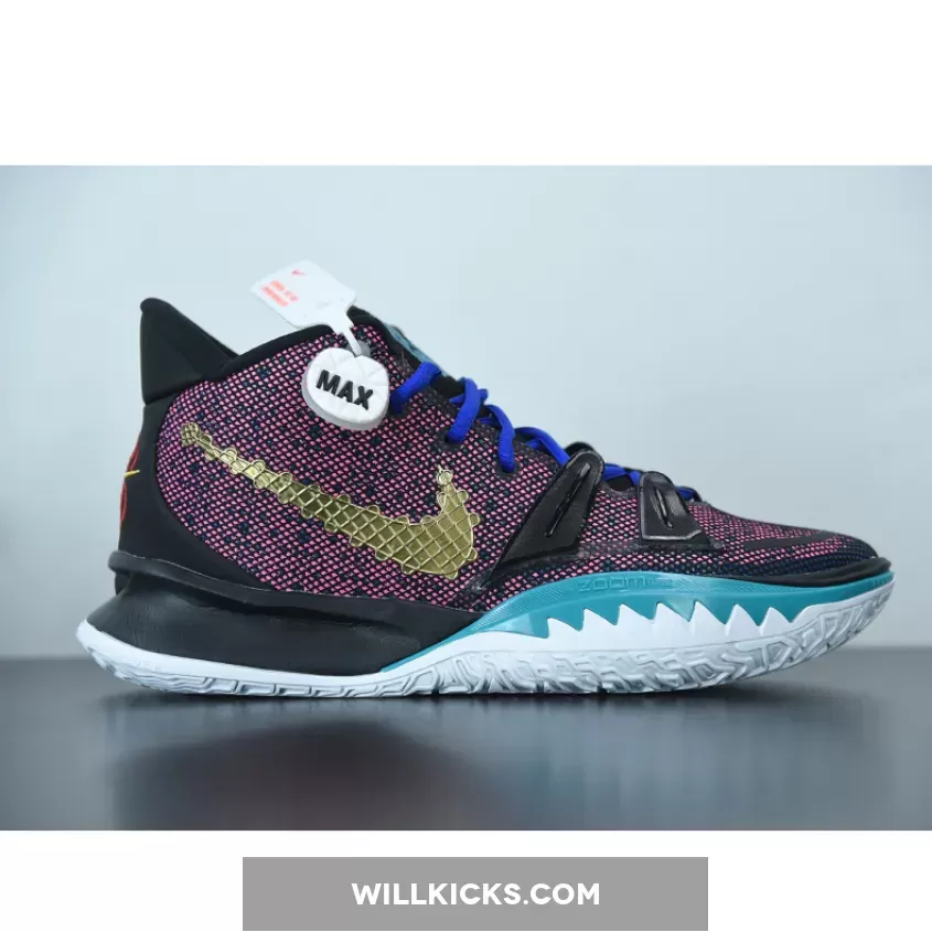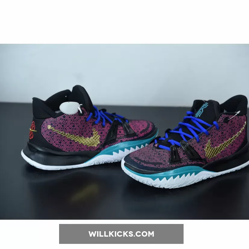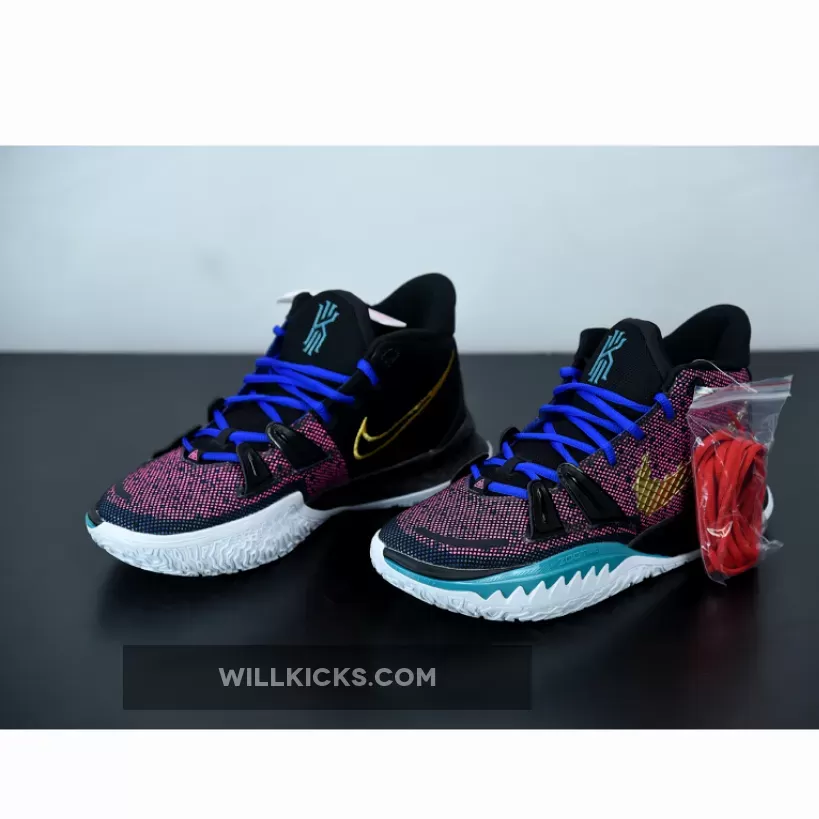 this Nike Kyrie 7 comes with Pink on the upper along with Black, while the Pink resembles a digital bit. Next, we have Teal on the branding and lateral forefoot overlays, Blue adorns the laces, and White runs across the midsole. Furthermore, Gold lands on the sculpted Swoosh logo on the lateral side while embroidered on the medial side and heel. Finally, a White sole with Red Kyrie branding finishes the look.