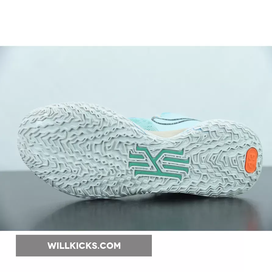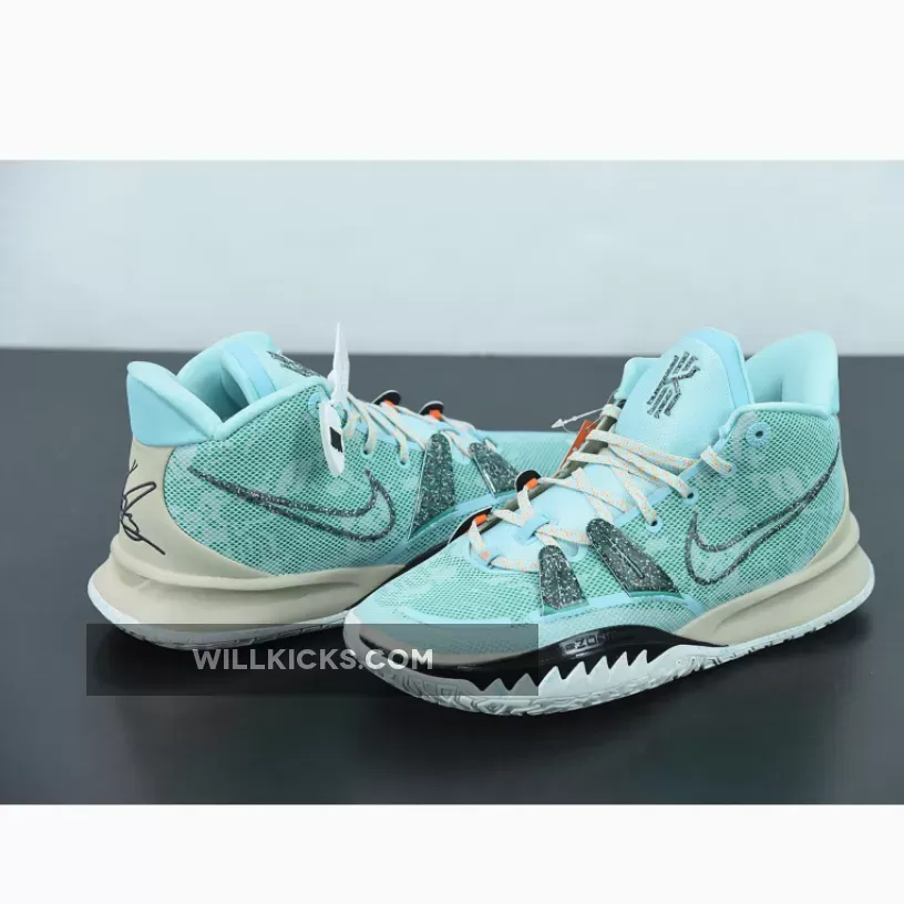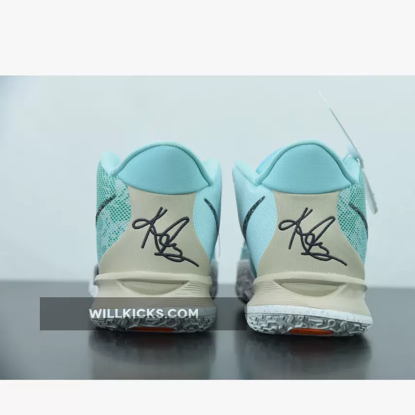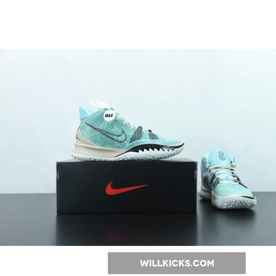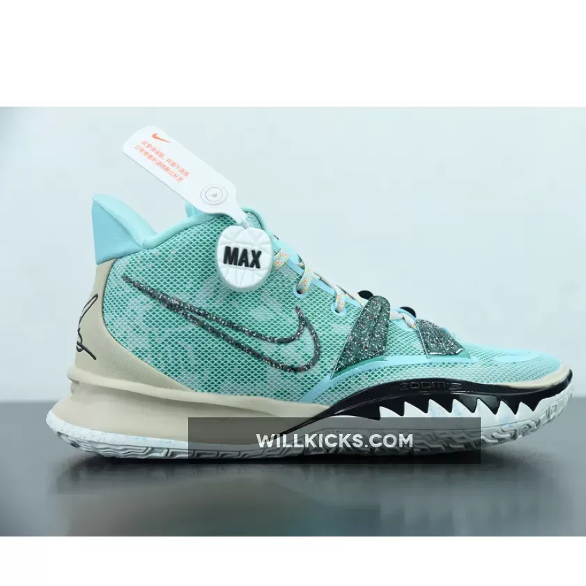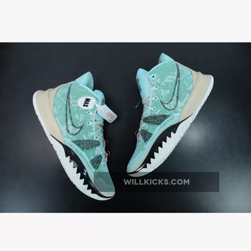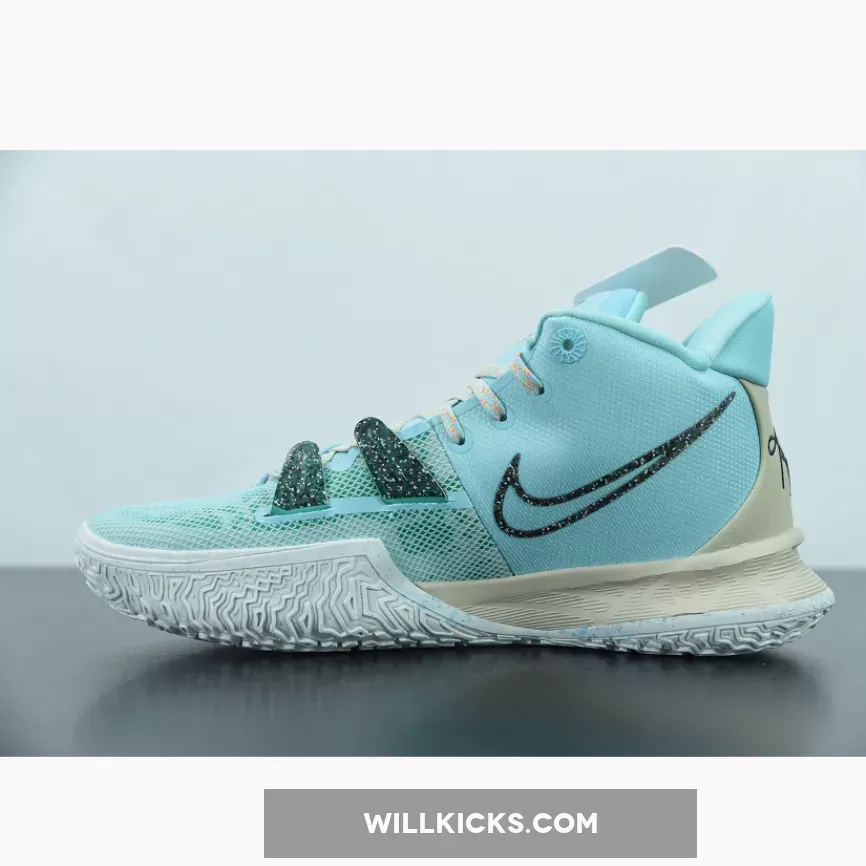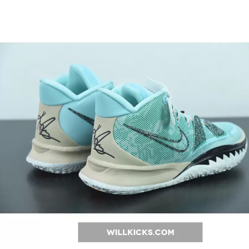 Dressed in a Copa, Dark Smoke Grey, and Rattan color scheme. This Nike Kyrie 7 features an Aqua Blue mesh upper paired with recycled materials on the Swooshes and TPU overlays made entirely out of Grind rubber. Speckled laces, Tan overlays atop a White rubber sole completes the design.
