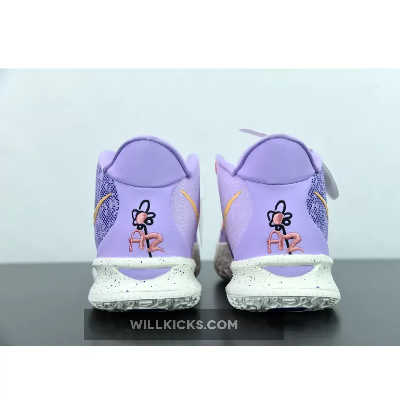 Coming soon is a series of sig models inspired by the respective athlete’s daughters, proudly representing the #GirlDad movement with playful and heartfelt designs. Seen here is the Nike Kyrie 7 made for KAI’s daughter Azurie; relying on a soft purple, pink, and bright orange colorway, this Nike Kyrie 7 emblazons an “AZ” on the heel with a cutesy illustration of a flower on the heel. That same floral pattern is seen beneath the mesh overlay on the upper as well as the on the exterior eyelets that sit at the forefoot of the shoes.