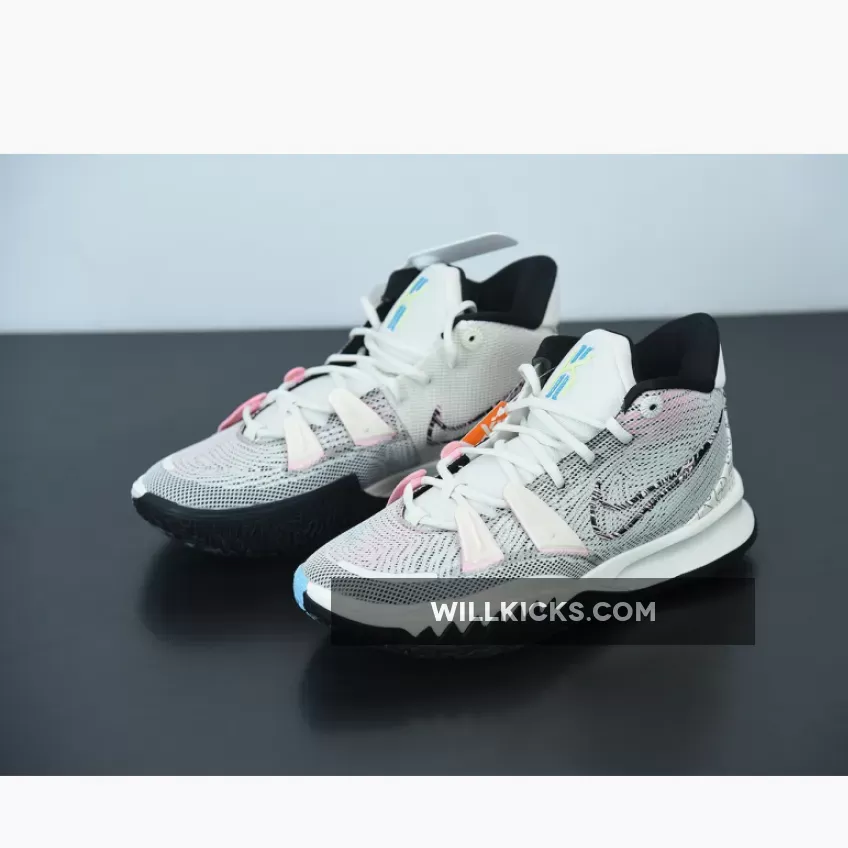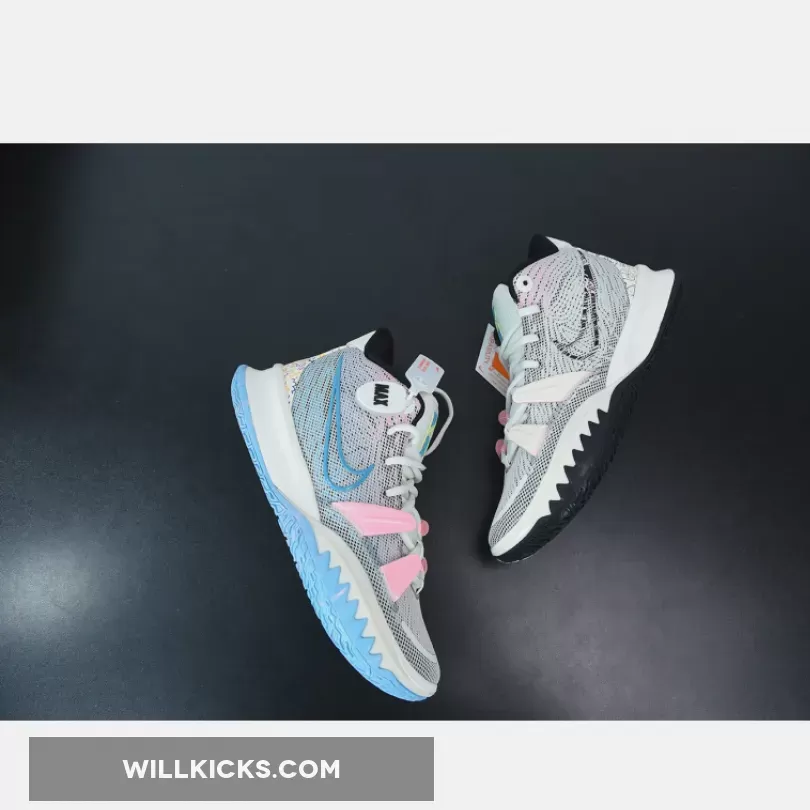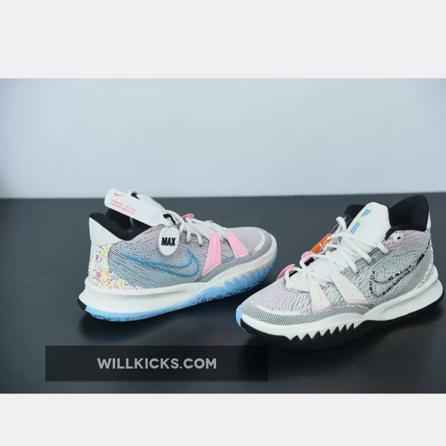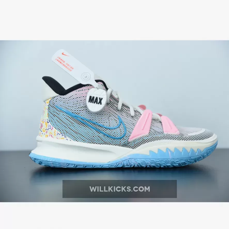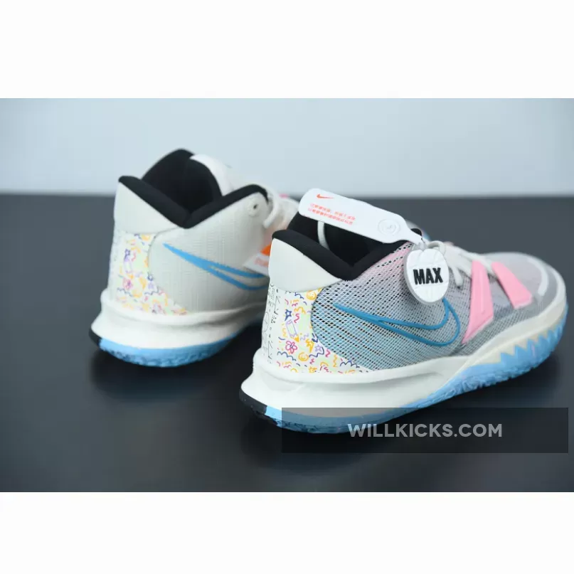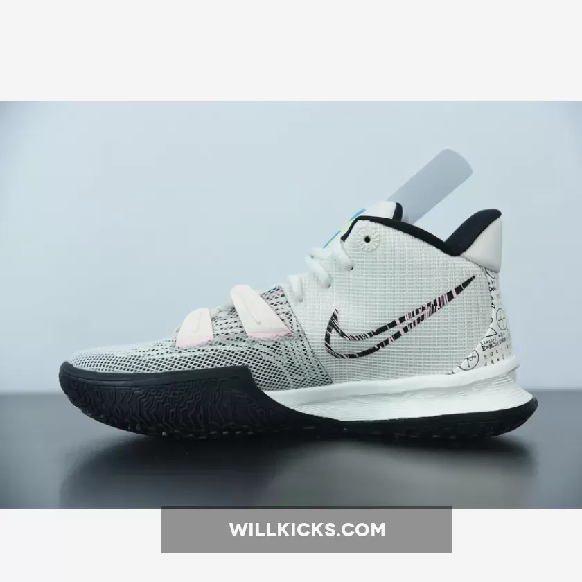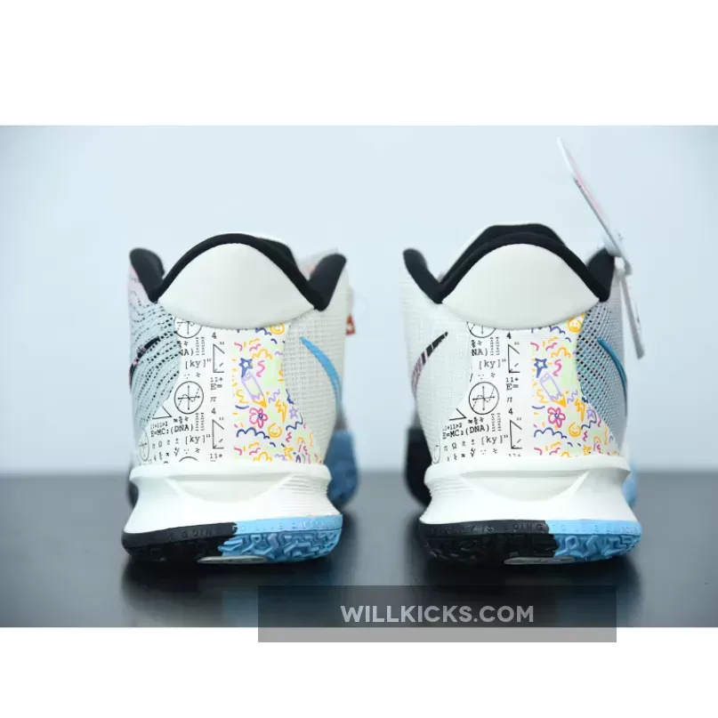 Dressed in a Pale Ivory, Chlorine Blue, and Black color scheme. This Nike Kyrie 7 comes constructed with a mesh upper and moldered plastic overlays detailed with colorful branding on the tongues and Swoosh logos. Highlighting the are the playful and mathematic graphics appearing on the heels atop a two-tone rubber outsole.