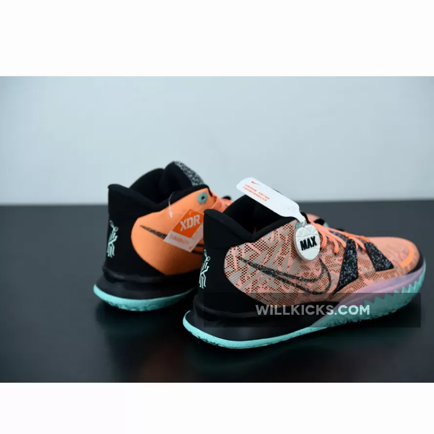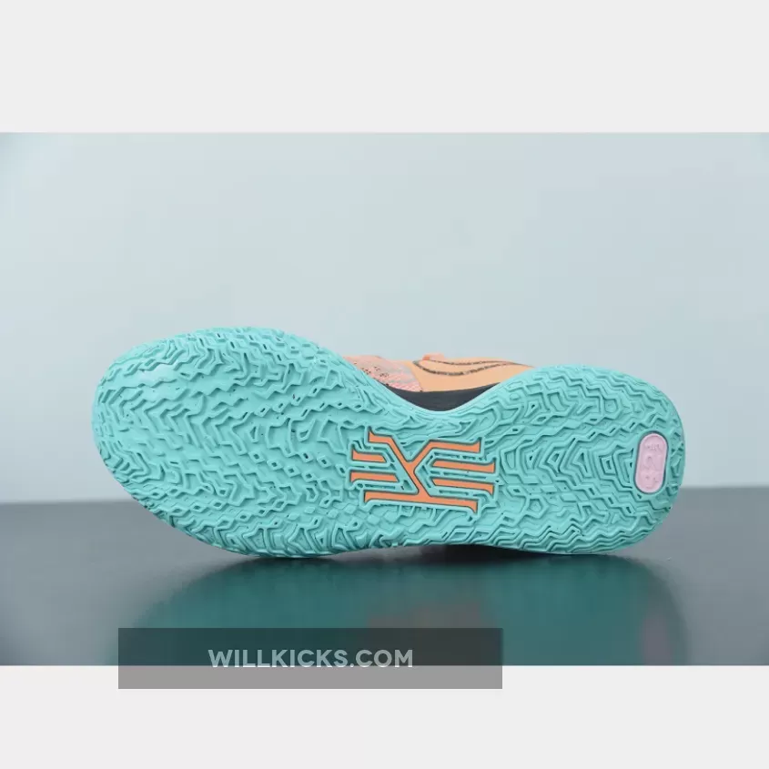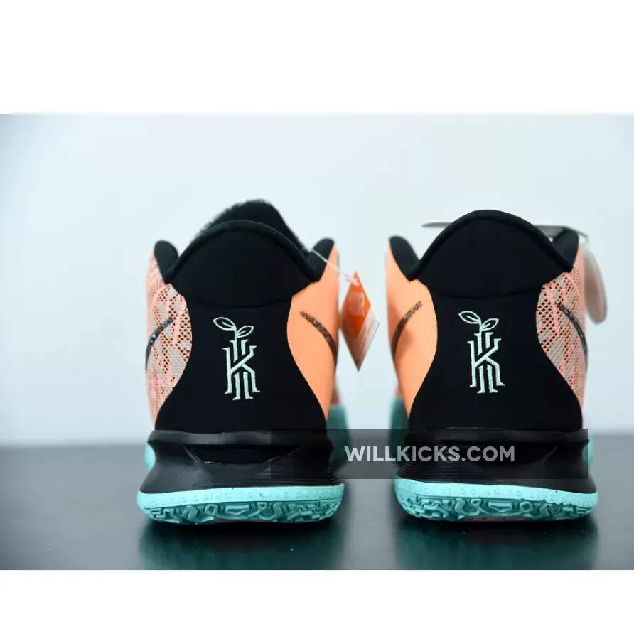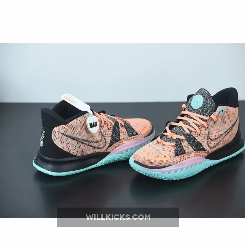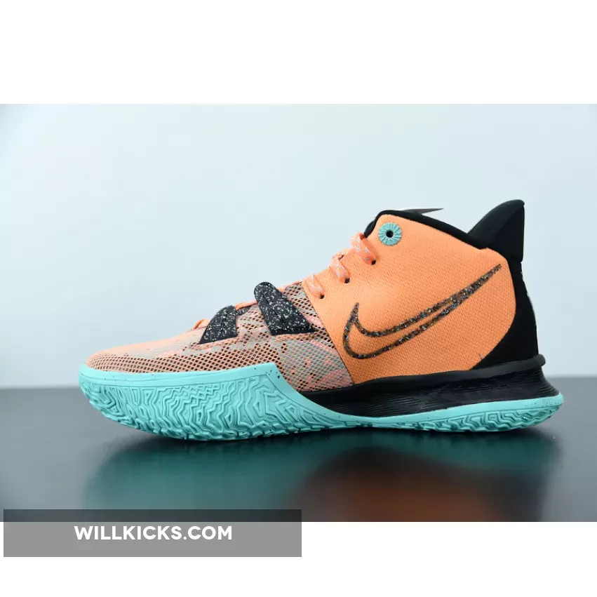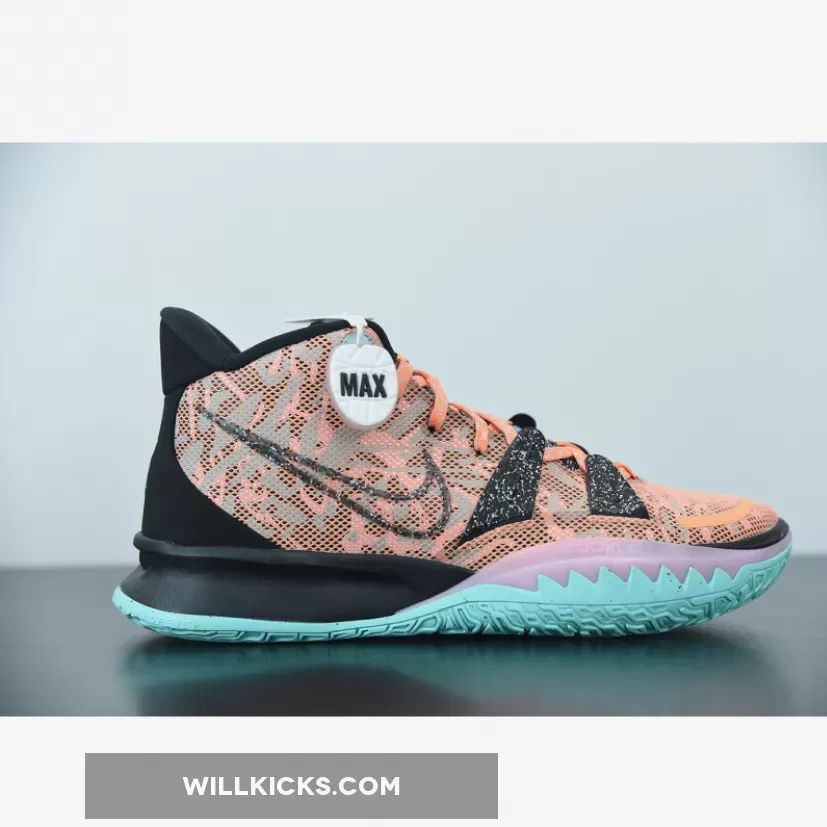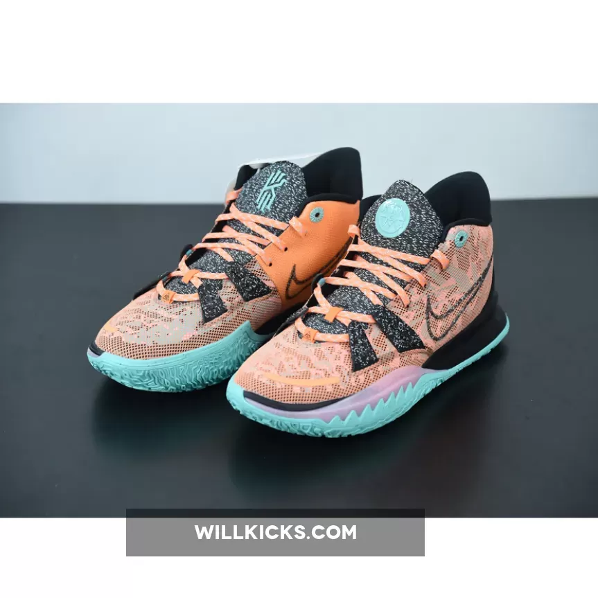 This offering of the Nike Kyrie 7 features an Orange hue covering its upper that’s constructed in mesh overlays with a vibrant, pattern revealed underneath. Also featured are Turquoise contrasting accents throughout, including covering its slightly-speckled rubber sole with Black heels and rear midsole. Nike’s Grind recycled materials used on the forefoot molds and outlined Swoosh with pant-infused branding on the insoles and heels completes the design.