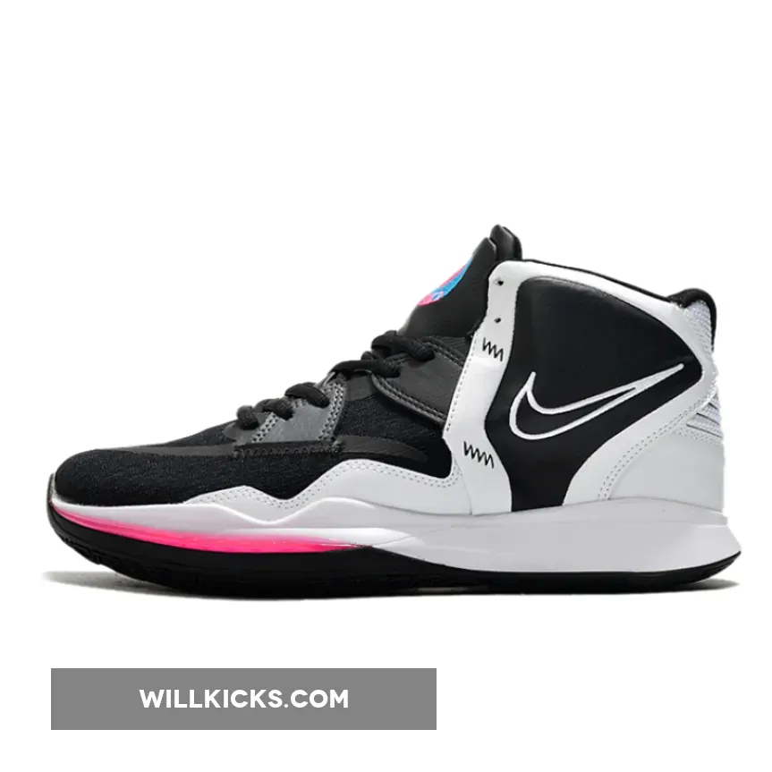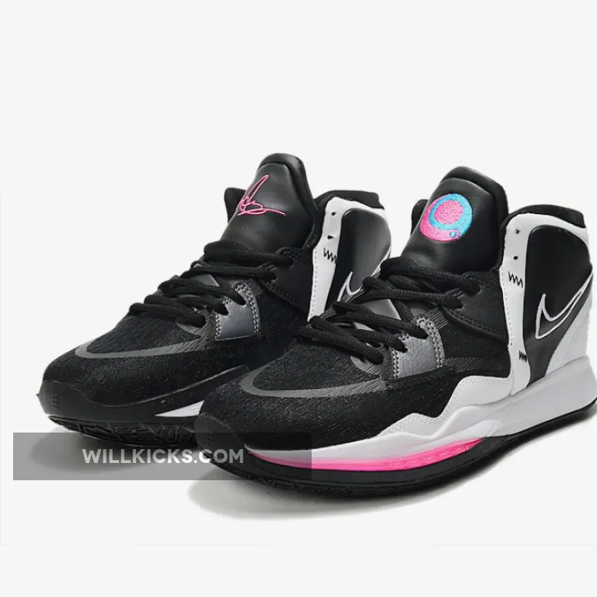 The Infinity South Beach Nike Kyrie showcases a striking appearance with a blend of deep black synthetic materials, textured leathers, and vibrant neon pink and blue hue details. Drawing inspiration from the renowned destination of South Beach, Florida, this sneaker includes logo embellishments, a white midsole, as well as Swooshes that are embroidered. Nikes Zoom Air cushioning technology is also used in crafting this shoe. The Nike Kyrie Infinity South Beach also features a Dynamic Fit System, which is an inner sleeve system that wraps around the foot.