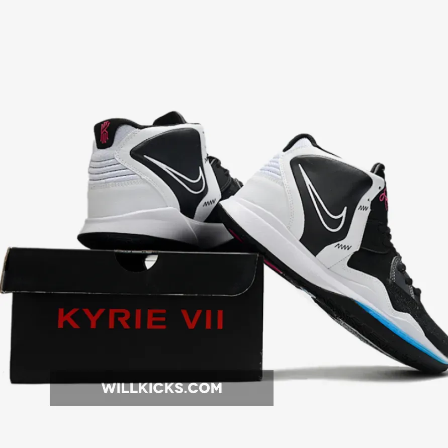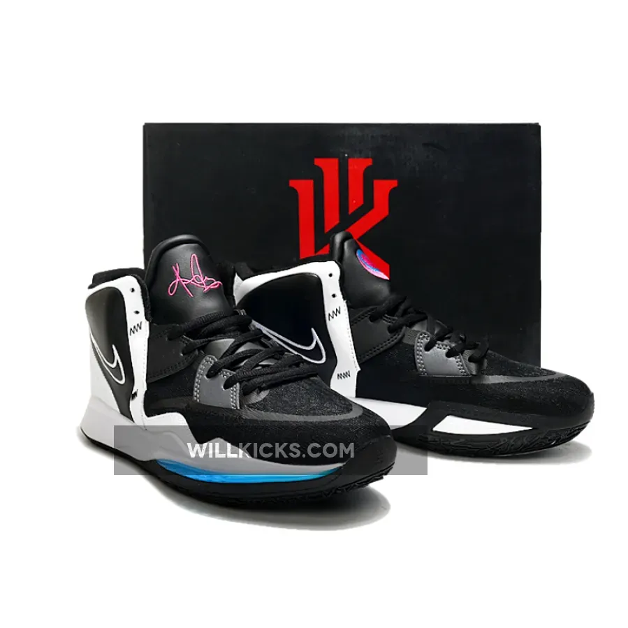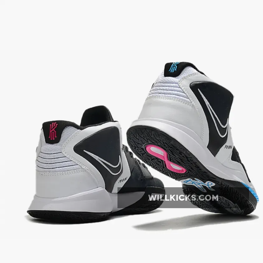 This offering of the Nike Kyrie 8 comes constructed in a mix of mesh and leather dressed in Black and White highlighted with Pink and Blue accents. Finishing off the design are Kyrie logos appearing on the tongue, heels, insoles and rubber outsole.