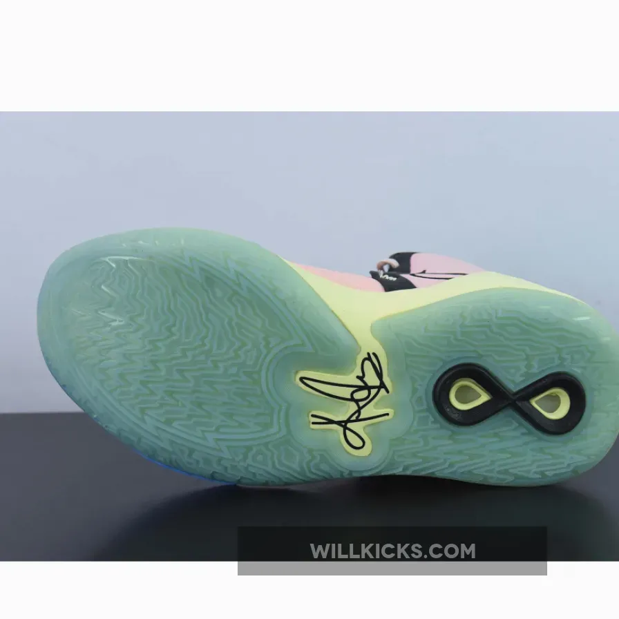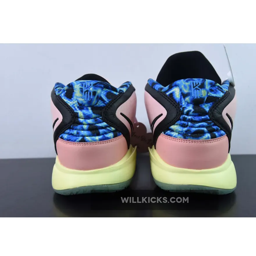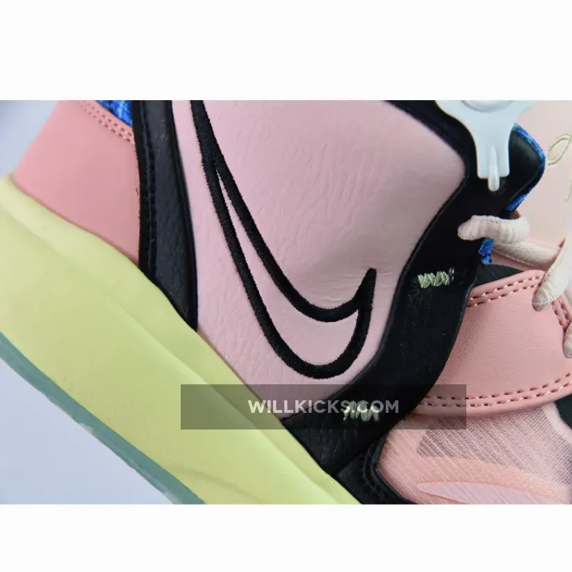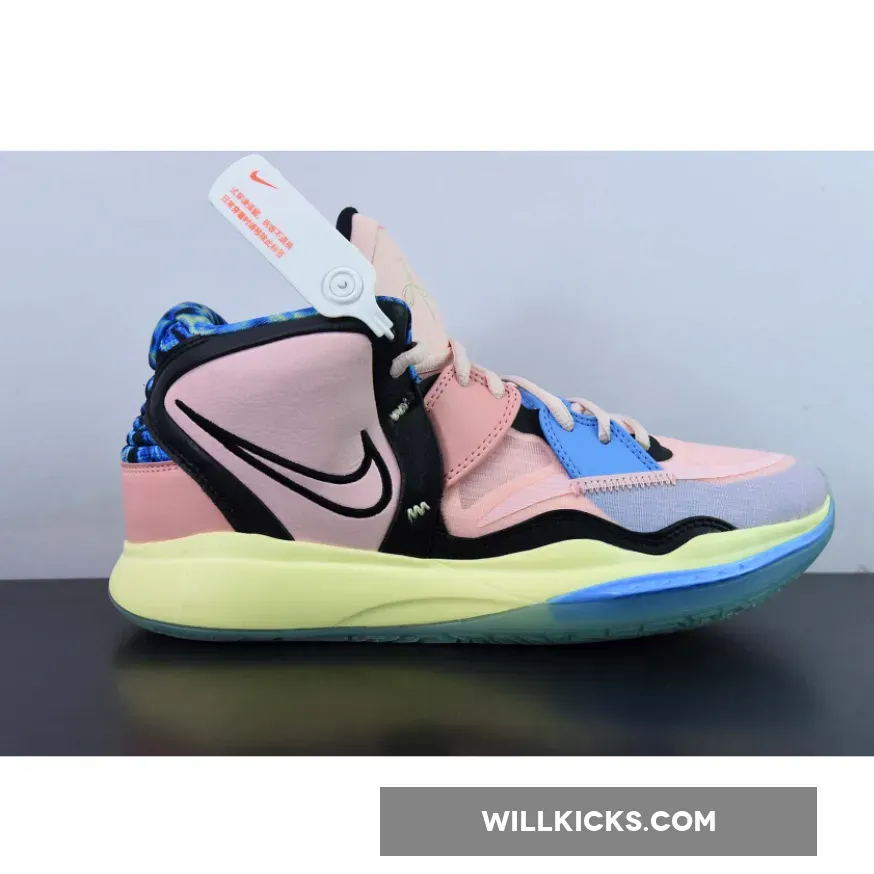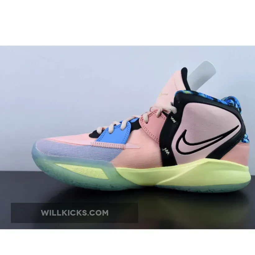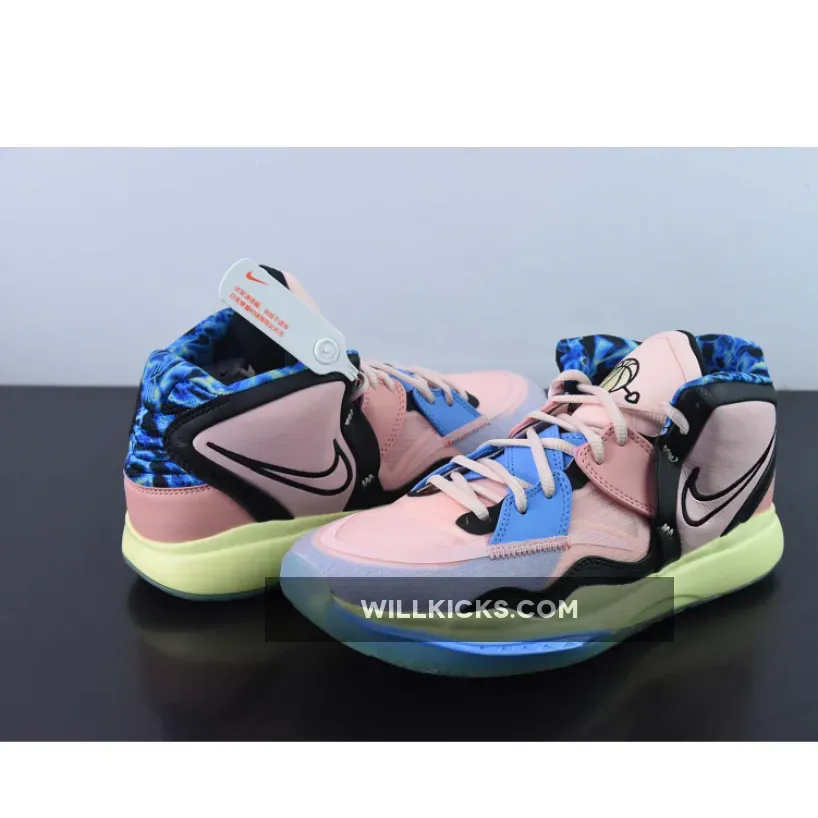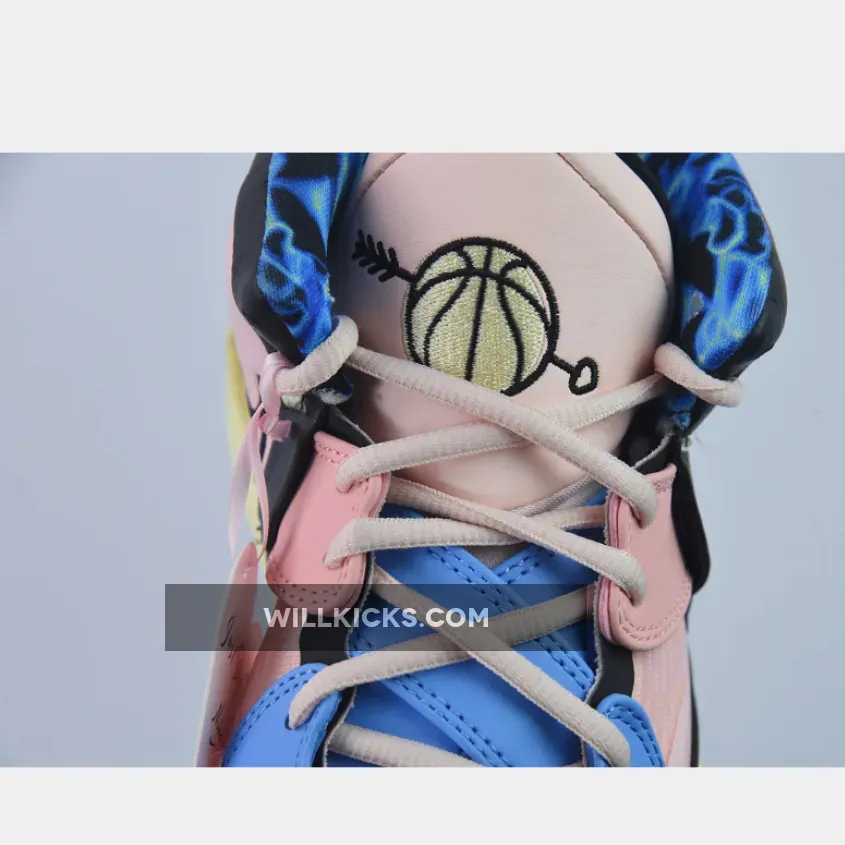 The Nike Kyrie 8 Valentine’s Day comes dressed in a Pink upper paired up with Blue accents found throughout the upper and sole unit. Other notable details include the Blue-heavy graphics on the lining and heel atop a Pale Yellow midsole. Valentine’s Day motifs come by way of the heart-arrowed basketball on the left tongue with a cupid logo on the insole.