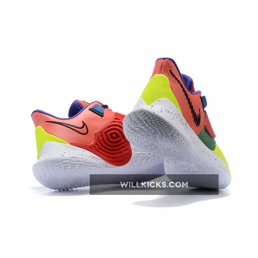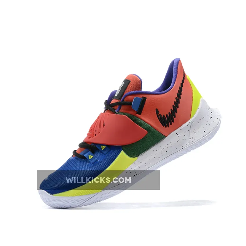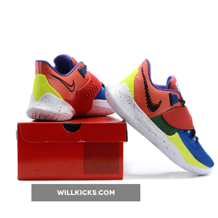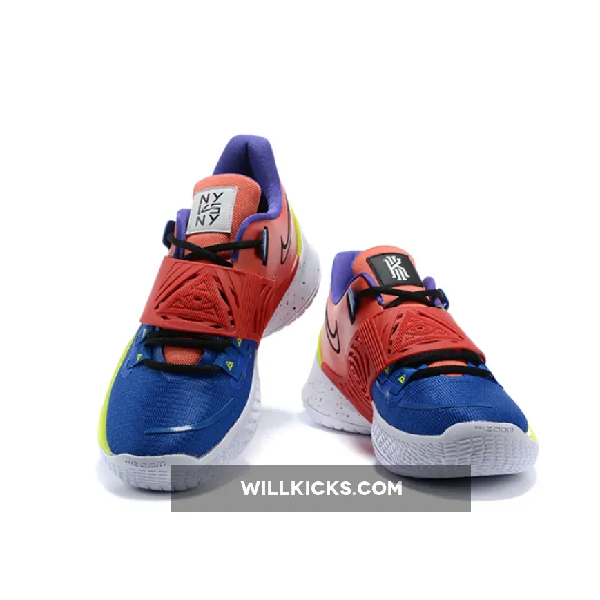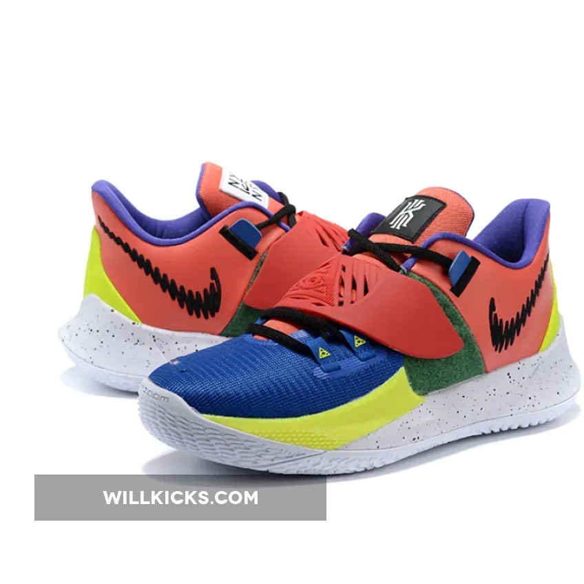 This offering of the Nike Kyrie Low 3 features a Multi-Color color blocking with a scribbled Swoosh logo on the lateral heel. “NY vs NY” logo appears on the right tongue completed with a speckled midsole and White rubber outsole.