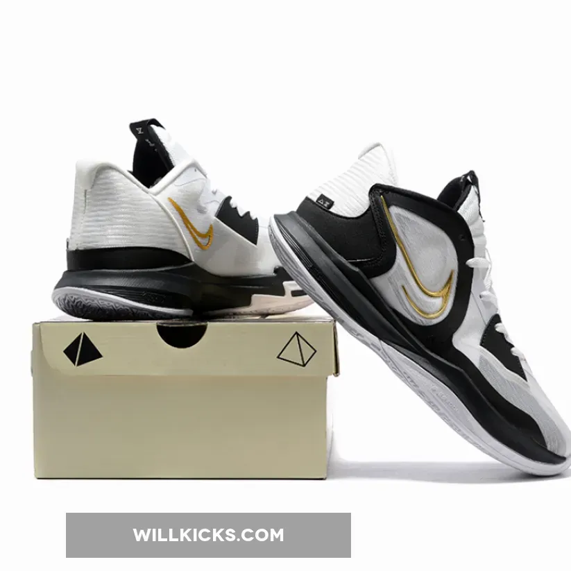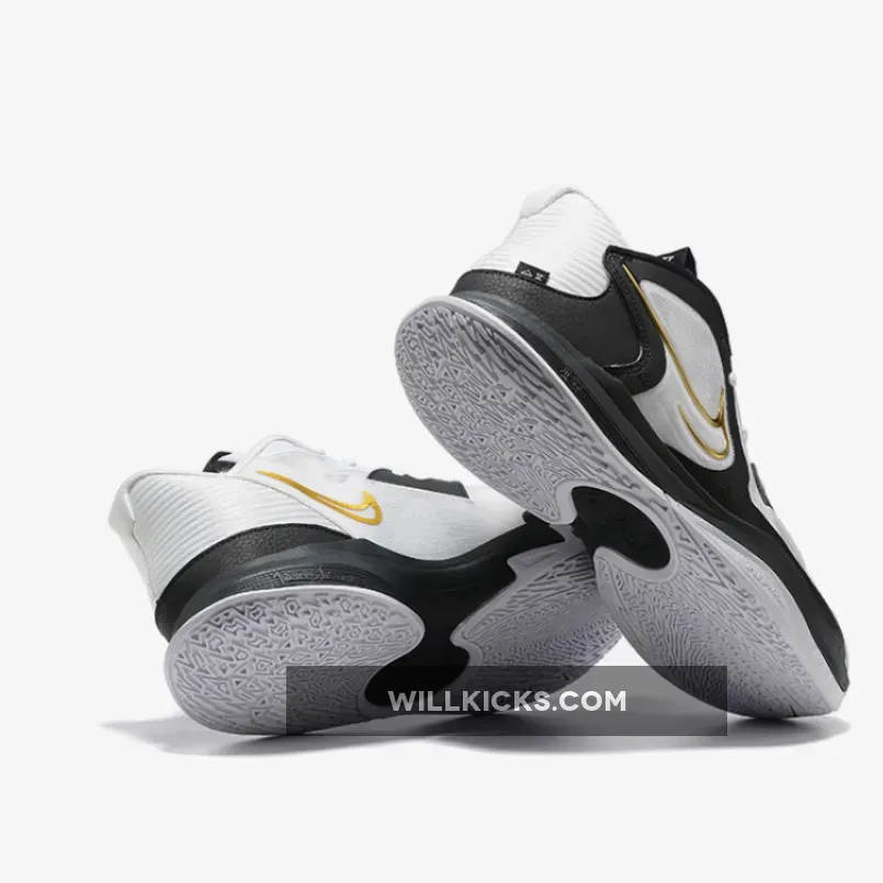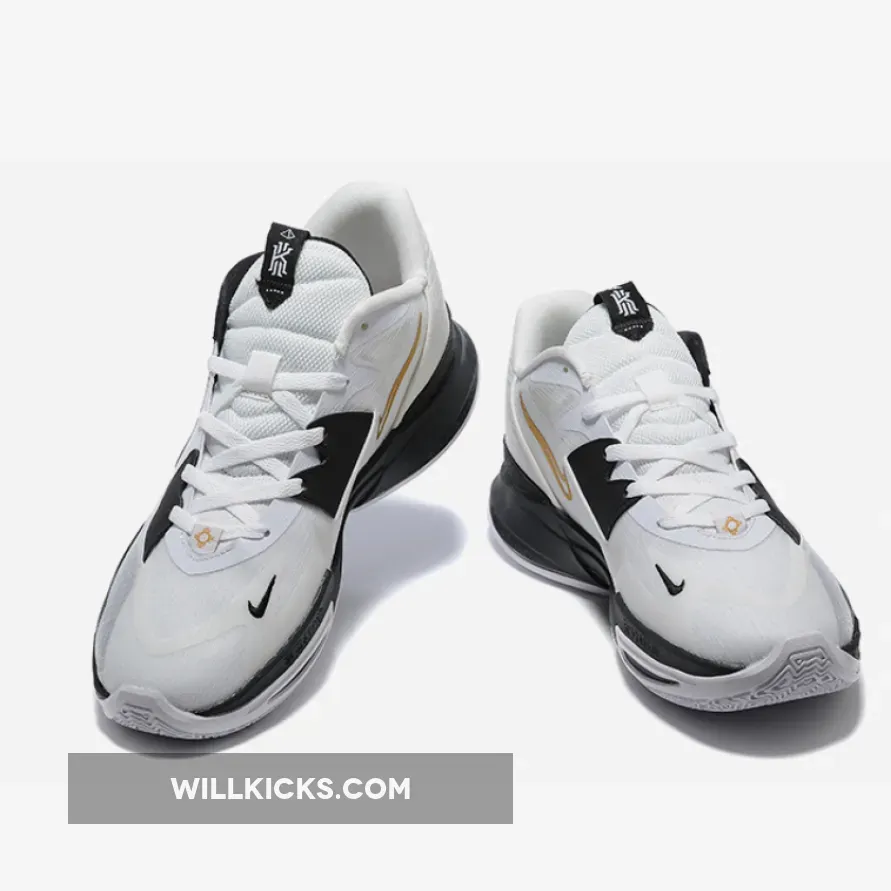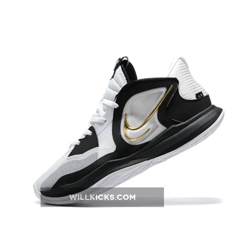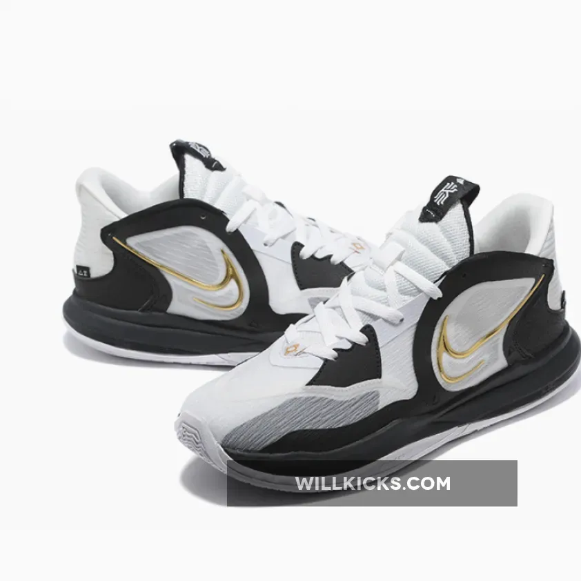 The Ben Nethongkome-designed Nike Kyrie 5 has a regal new release that’s bound to match anything in your closet. Meet the Nike Kyrie 5 Low White Metallic Gold Black. This Kyrie 5 sports an asymmetrical look with a combination of mesh, synthetic and pebbled leather material. The slanted white mesh tongues sport black piping and mismatched “K” branding on the tongues, one pyramid is white while the other is black. The Fly-trap mechanism that locks down this shoe is in black and white. Golden and stylised Swooshes cover both the medial and lateral sides of the shoe.