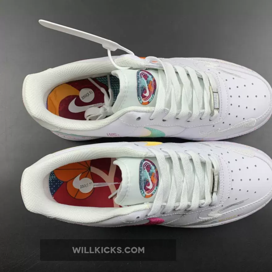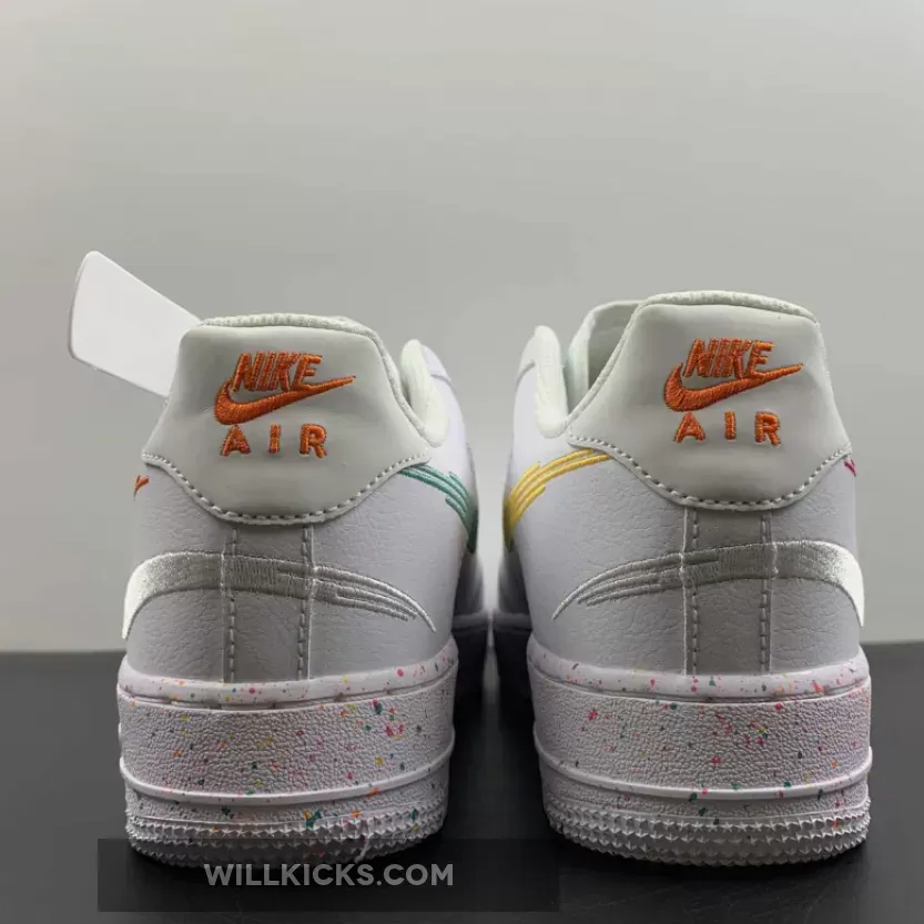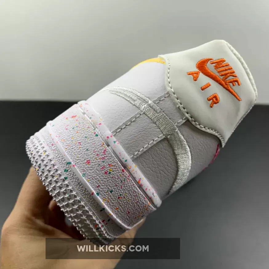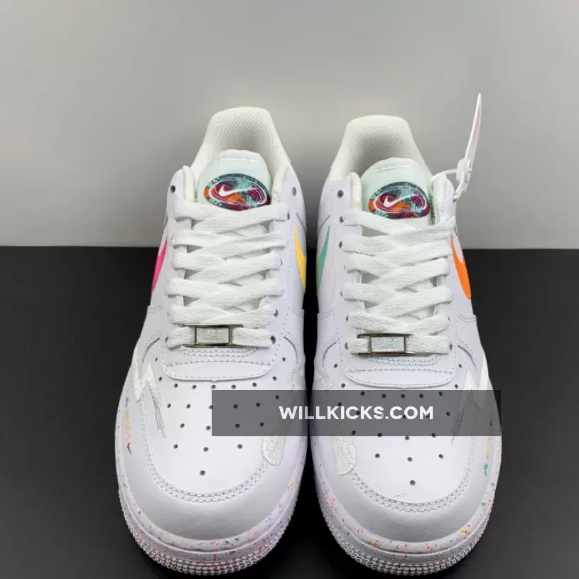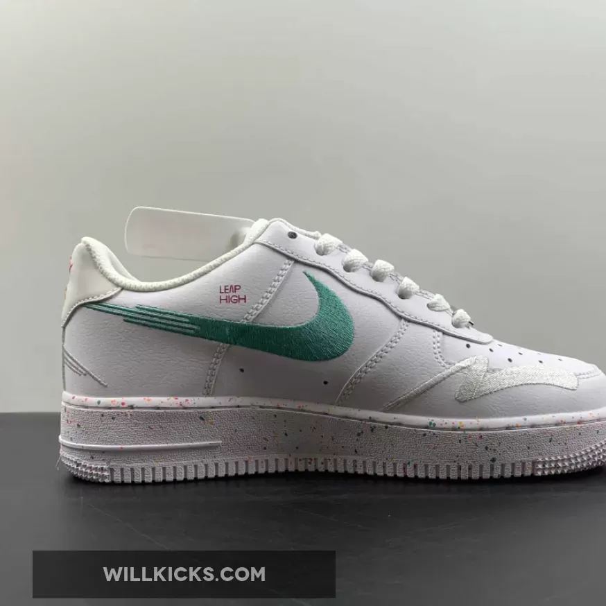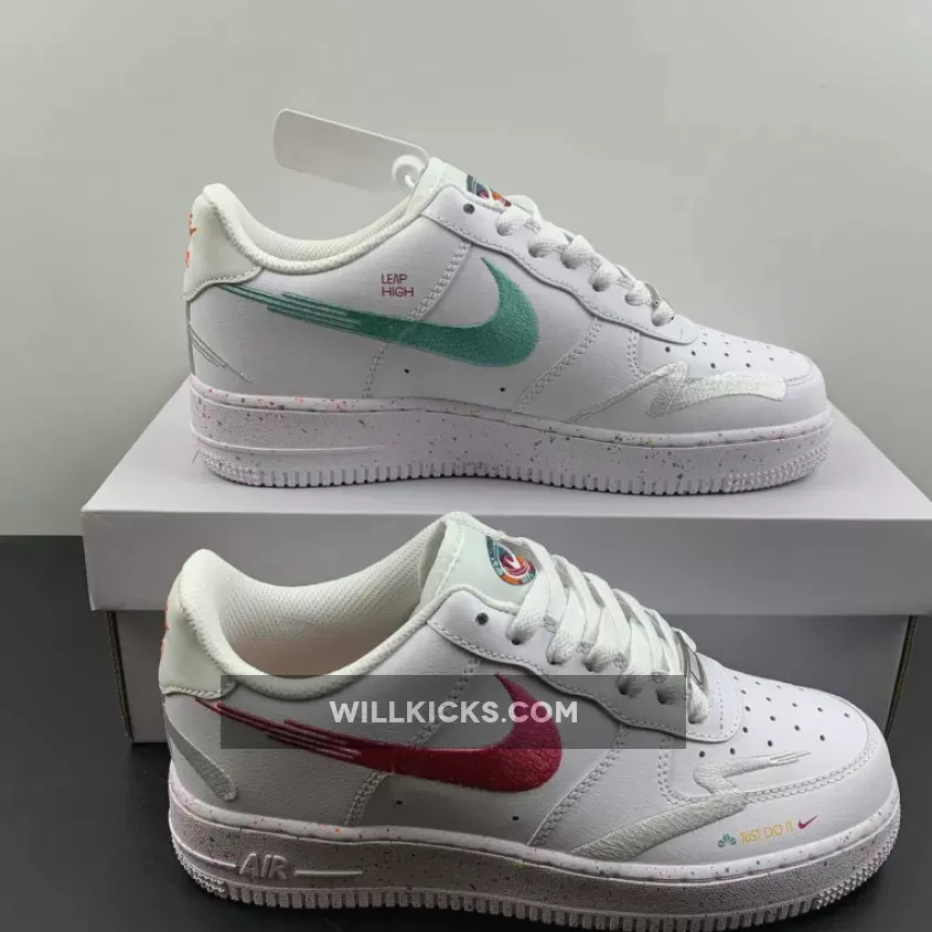 The Nike Air Force 1 Low Leap High White Multi features a playful design. It starts with a smooth white leather base that’s decorated with fun embroidered Nike Swooshes in bright orange, teal, lemon yellow and cherry red. The same colours can also be found intermingling at the inner lining and at the embroidered tongue tag branding. Underfoot, the splattered paint design across the chunky sole unit also features these cheery shades. Finishing touches of this Nike Air Force 1 Low include the “Just Do It” detail on the forefoot and the metallic silver lace dubrae.