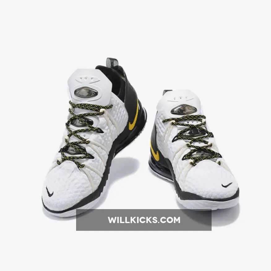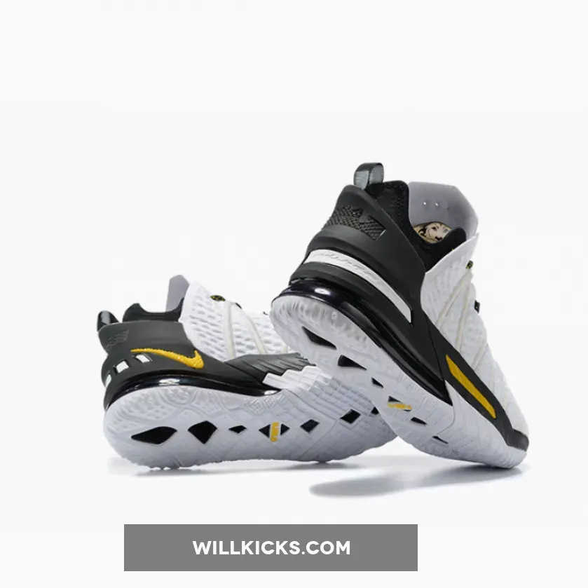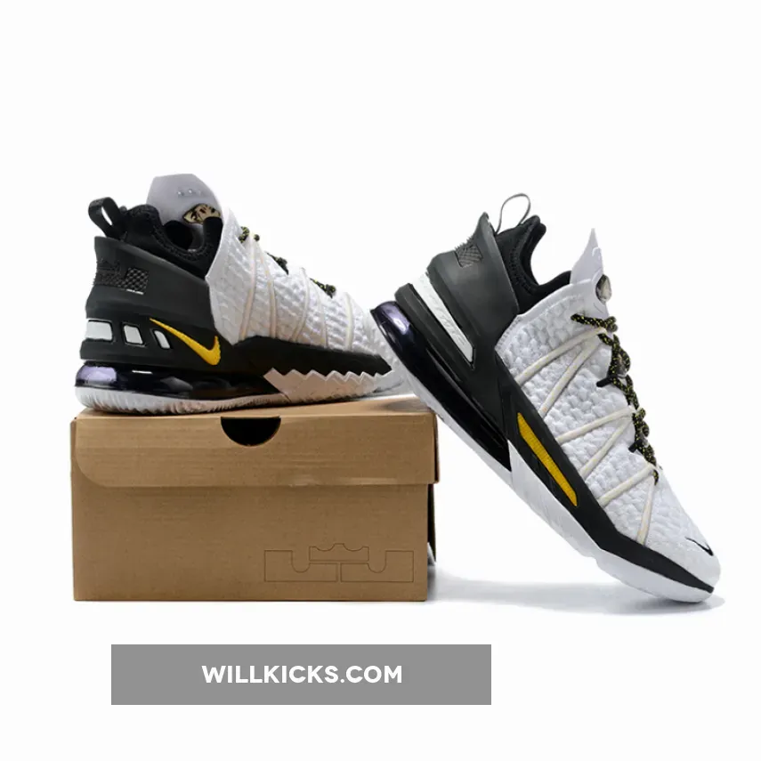 this Nike LeBron 18 features a White, Amarillo, and Black color combination. First, the pair features White knitting across the upper while Black and Gold accents run throughout. Next, LeBron’s number ’23’ lands on the insoles in the same style as his Lakers jersey while speckled accents land on the laces.