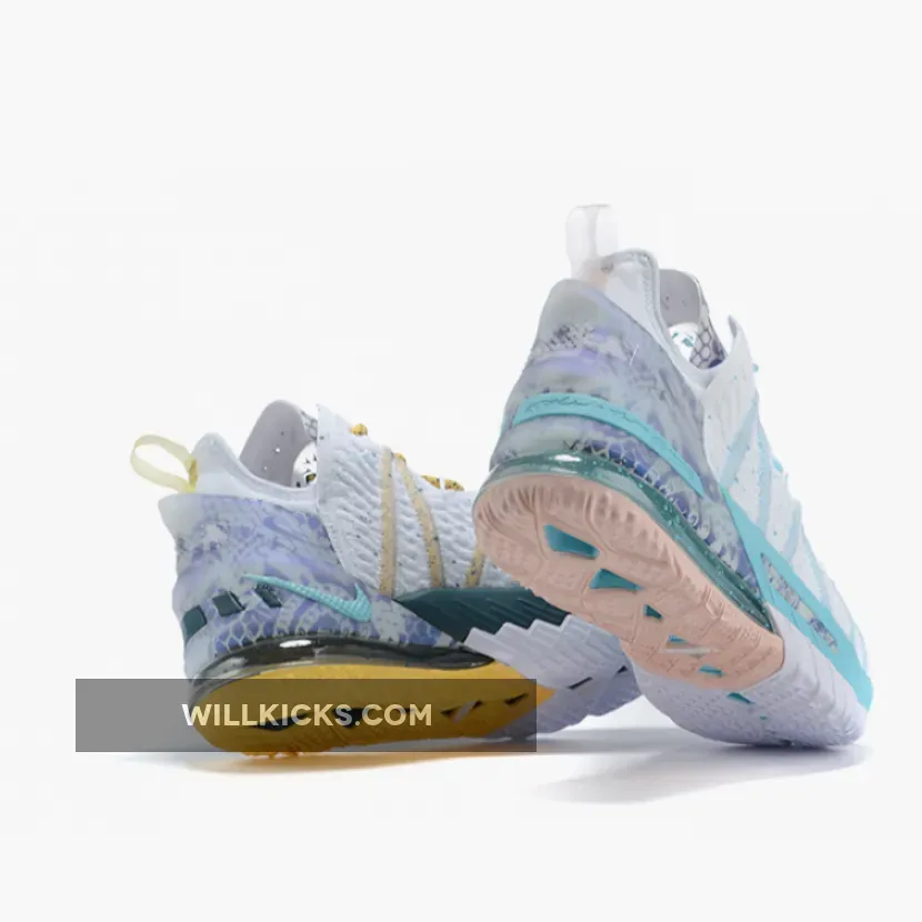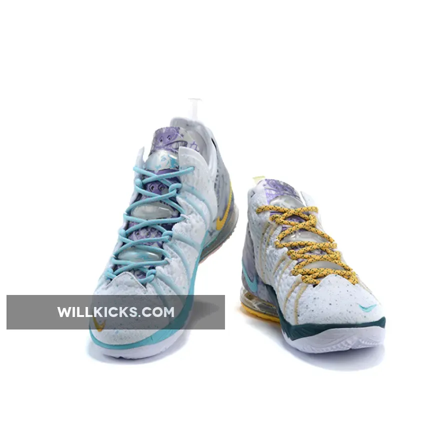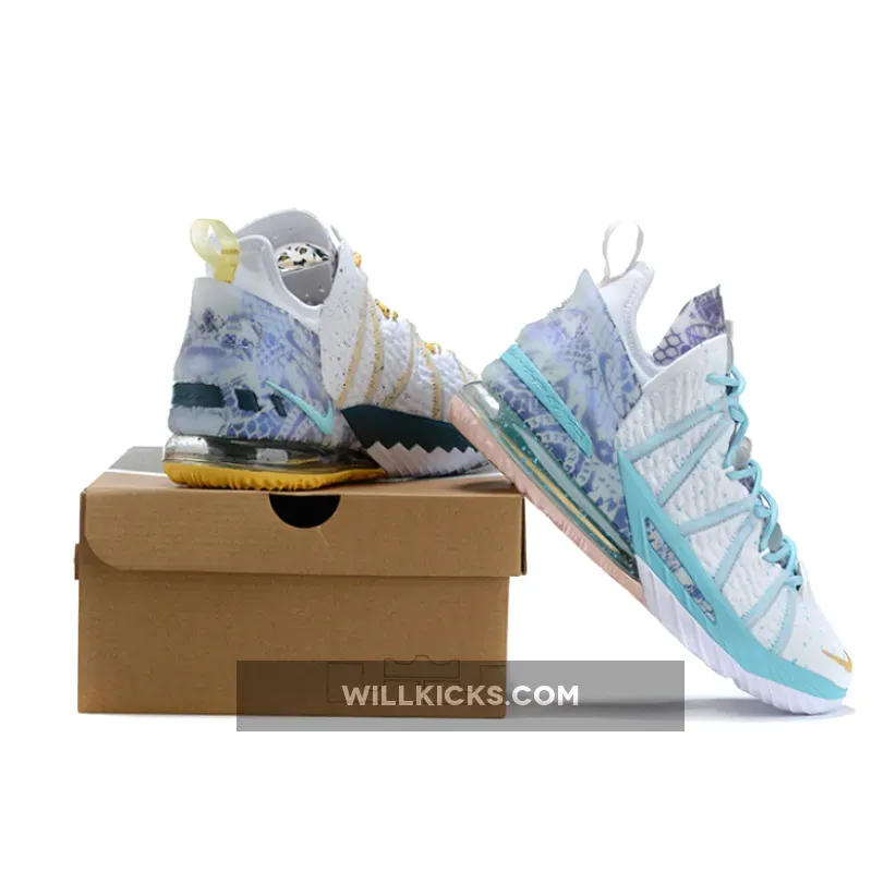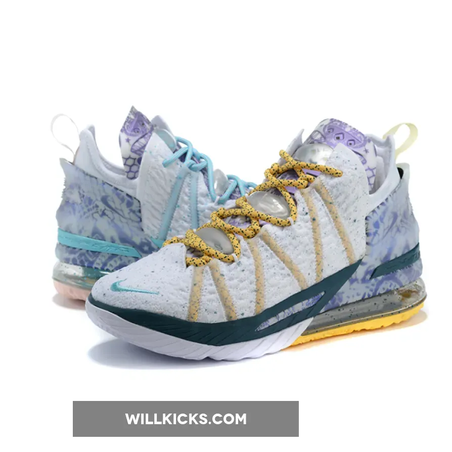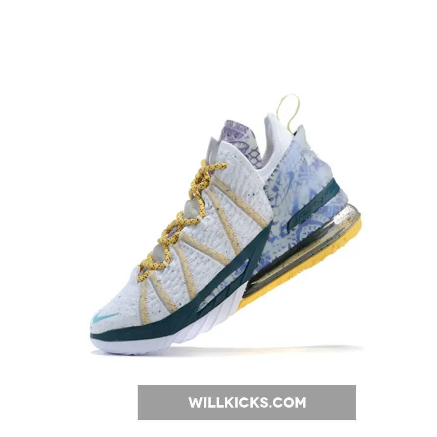 The reflection theme is expressed through slightly altered colors on the left and right shoe, with variations on the sole, logos, heel tab and laces. Iconography representing his 17 seasons to date creates unique collages that appear as graphics on the heel, tongue and sockliner. With a lightweight White Knitposite 2.0 upper, durable molded heel clip, new Air system in the tongue and a full-length Air Zoom unit combined with a Max AIR unit in the heel, this game-changing design elevates the LeBron signature line to the next level.