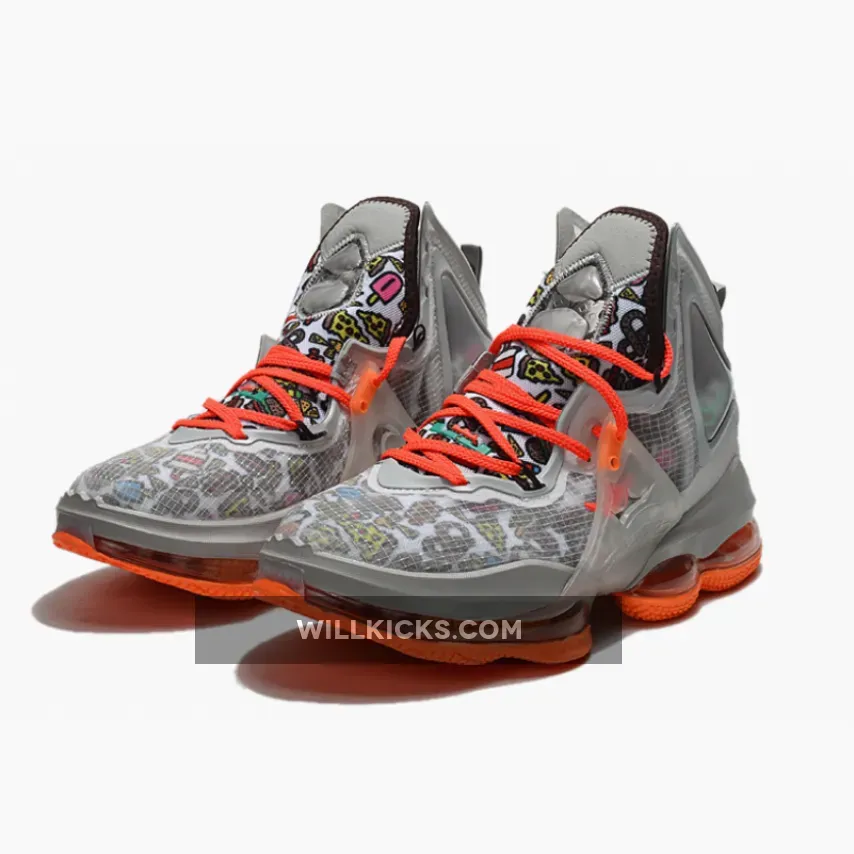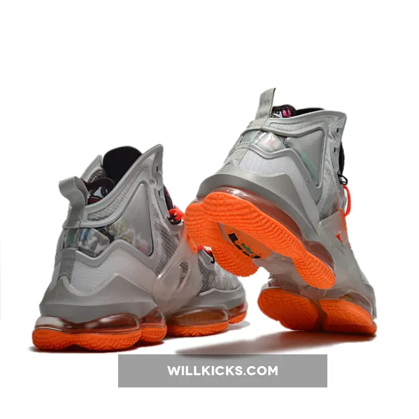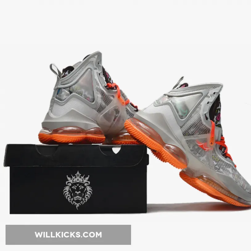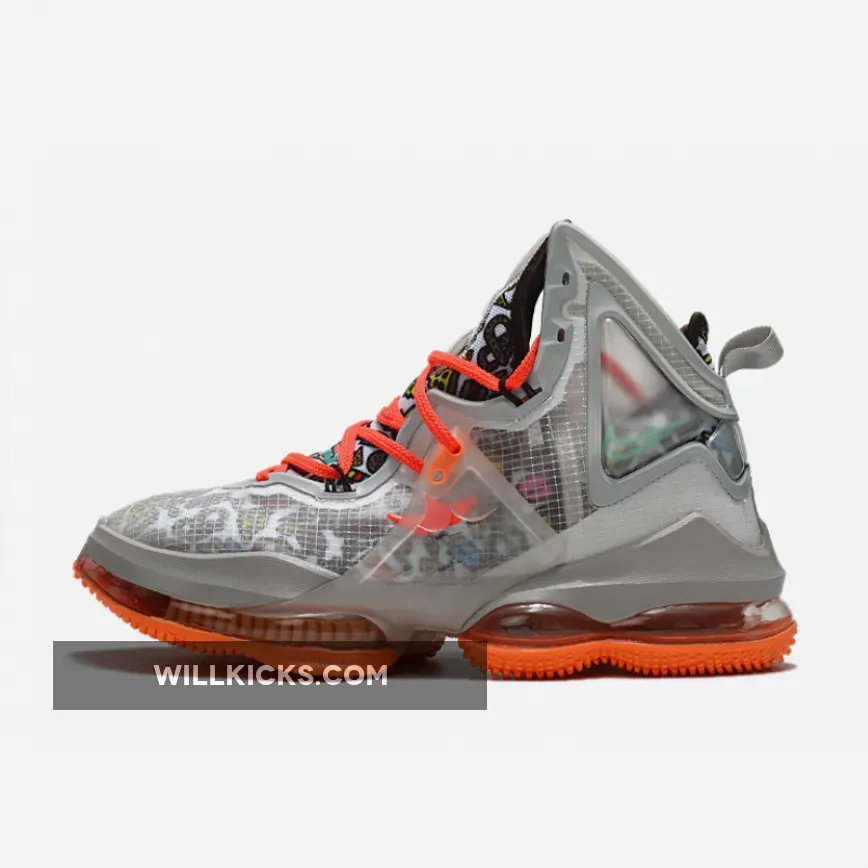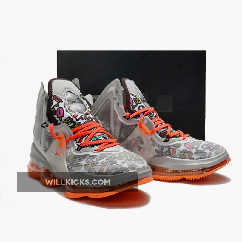 As you can see, this Nike LeBron 19 comes with White neoprene on the upper while junk food all-over print on the base. Laying over it, we have a transparent mesh. Built with a Zoom Air unit in the forefoot and a dual-chambered Max Air to finish the look.