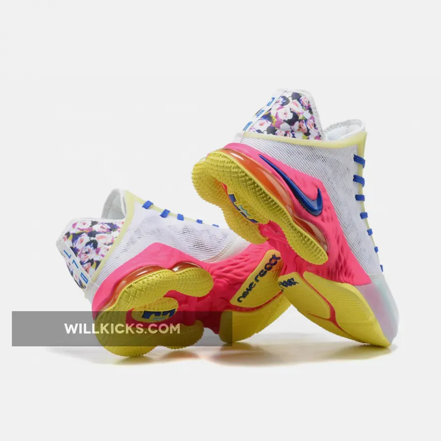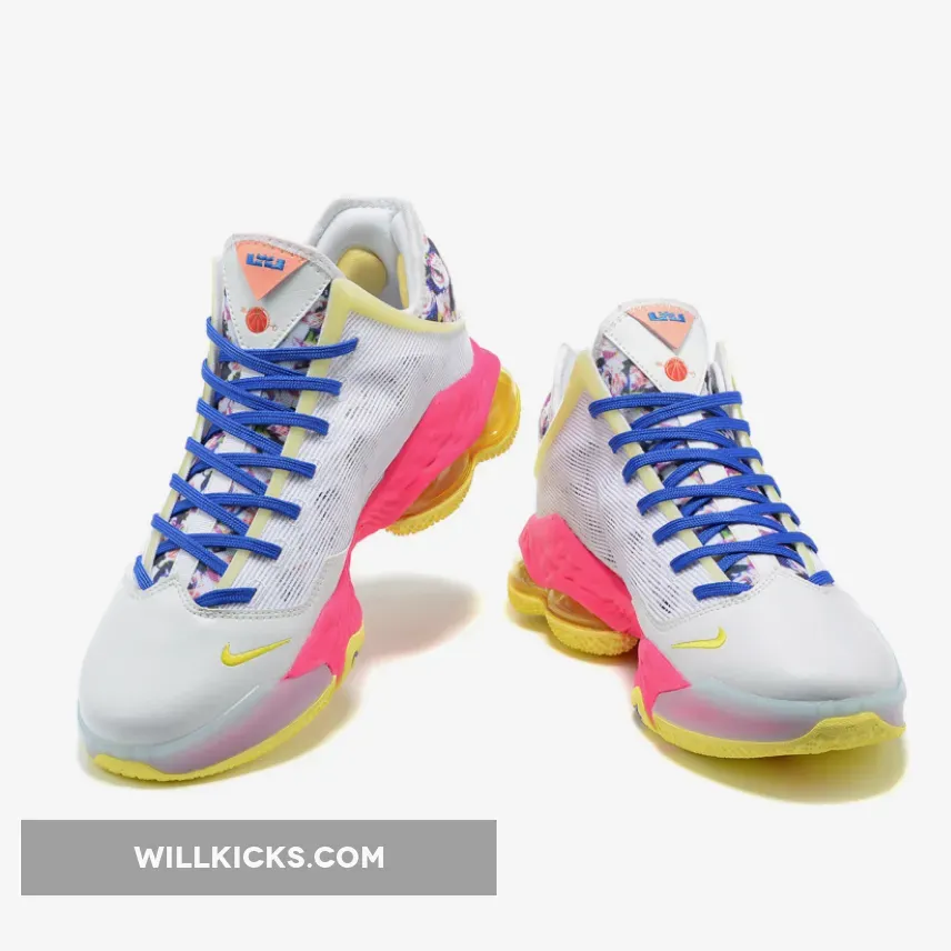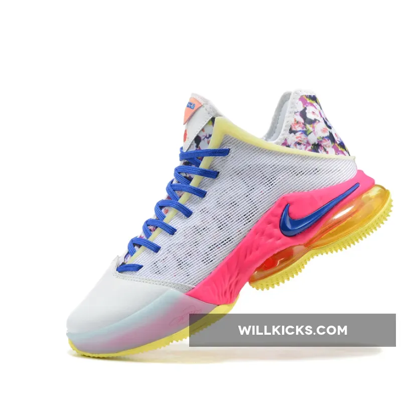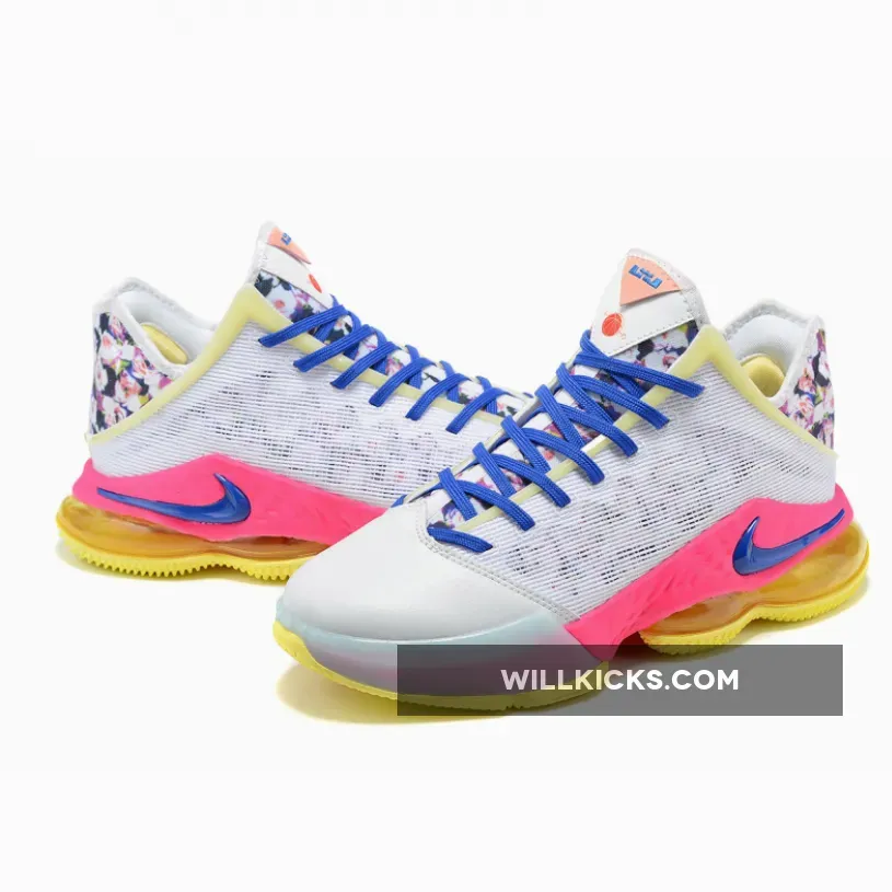 This offering of the Nike LeBron 19 Low features a White textile mesh upper and leather toe box paired with pastel accents perfect for spring. Highlighting the shoe are floral patterns on the tongues and heels.
